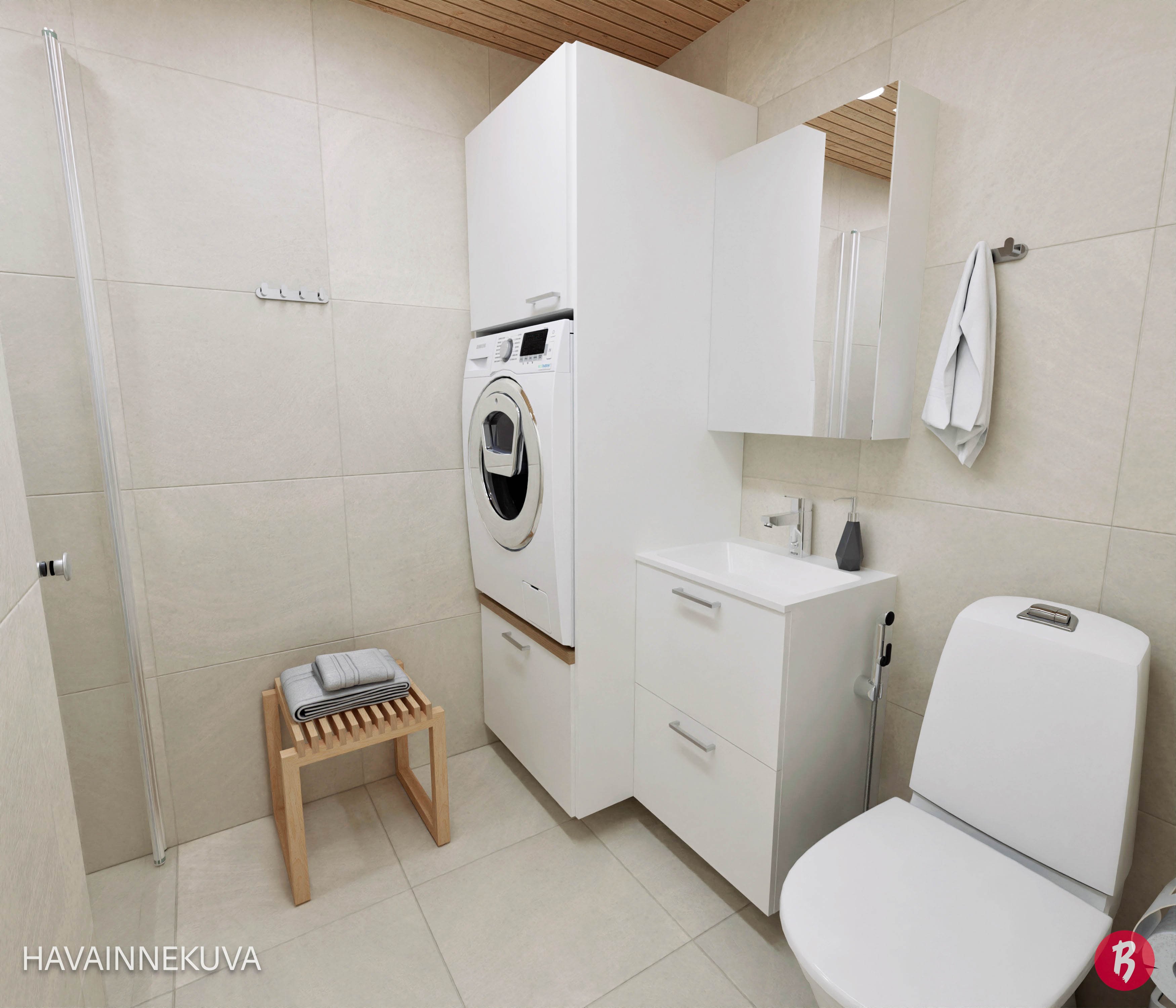 WC-istuin, suihku, pesukoneliitäntä, lattialämmitys, pesuallas ja allaskaappi