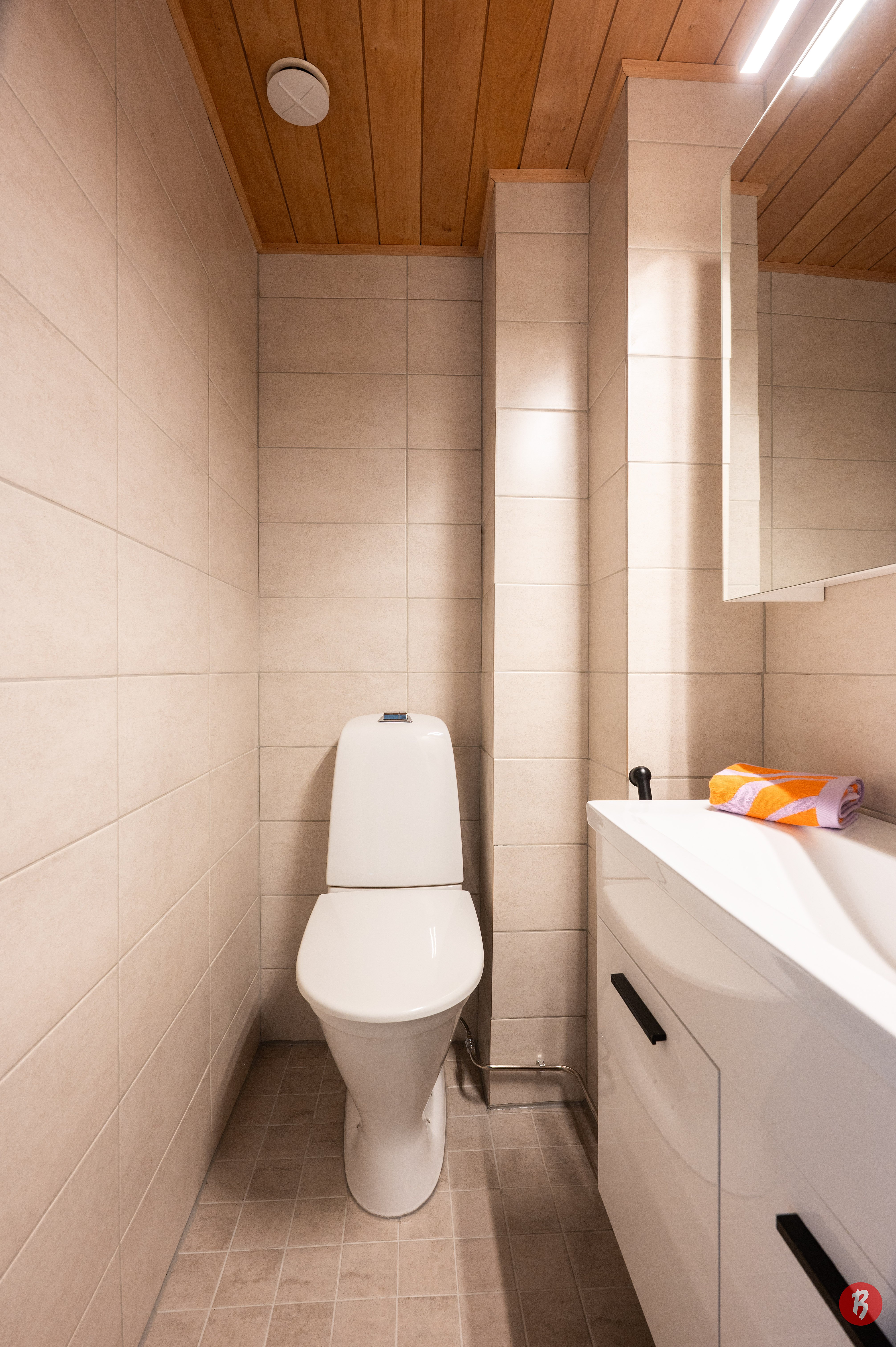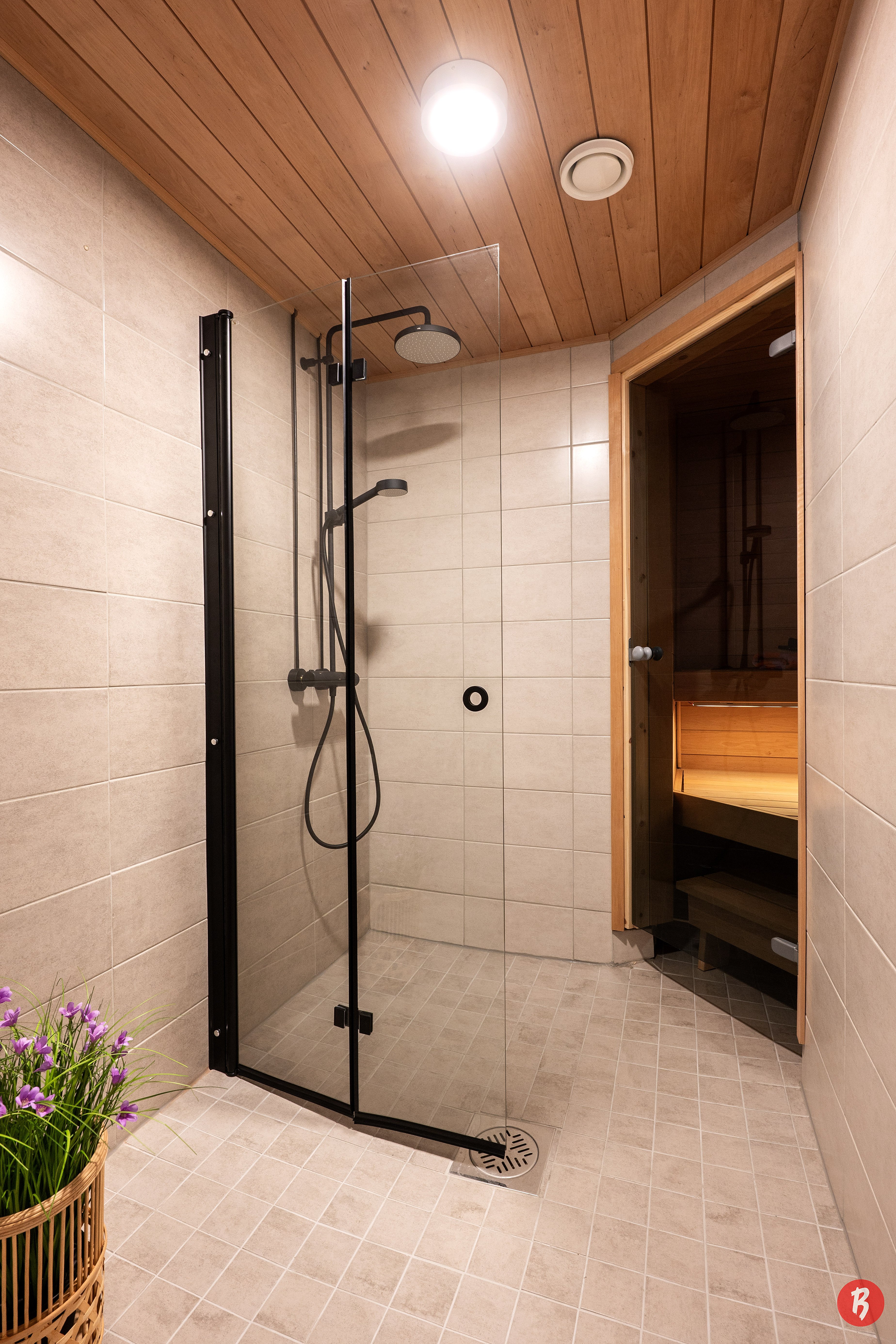 Suihku, pesukoneliitäntä, peilikaappi ja suihkuseinä