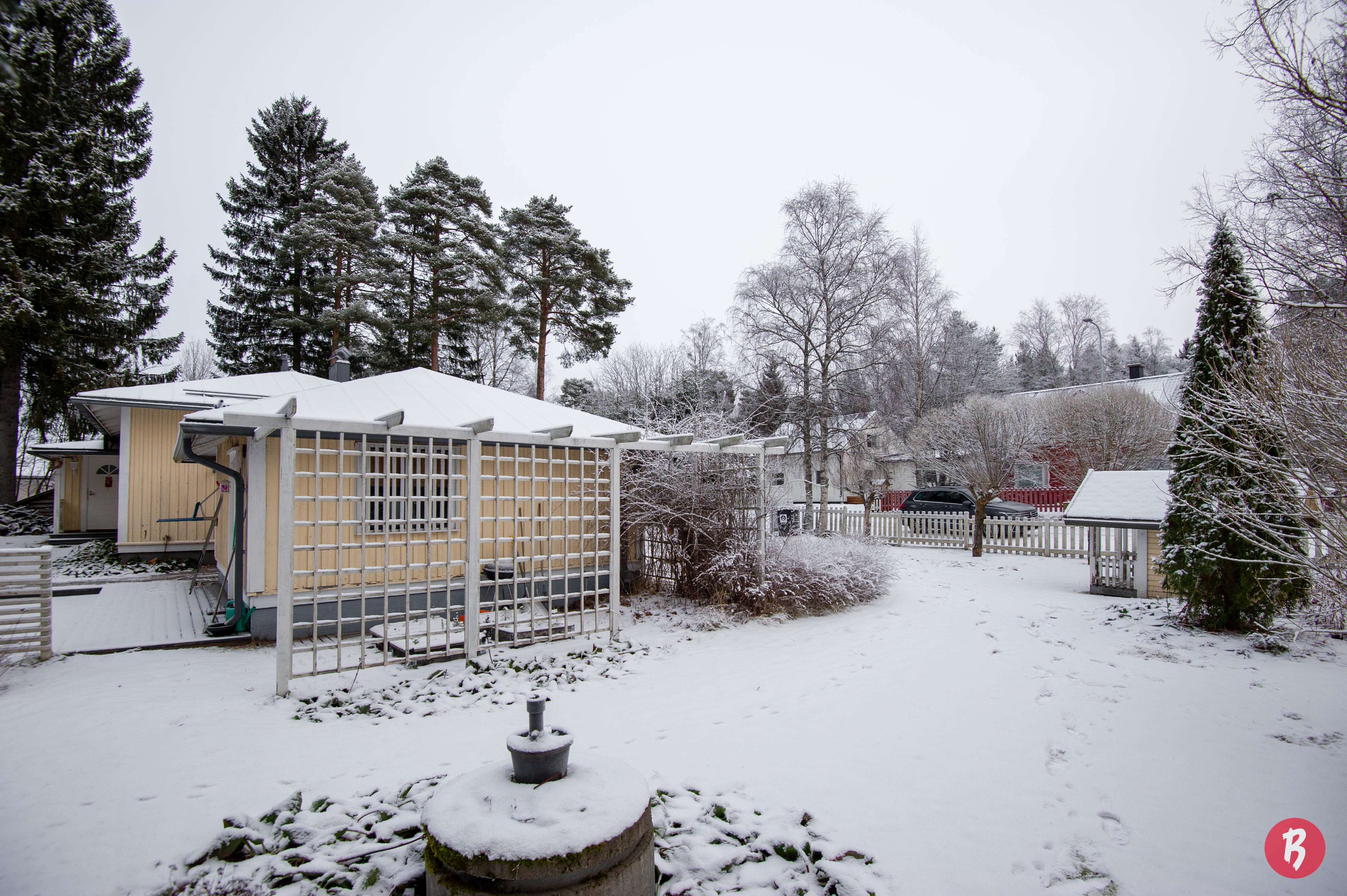 Puutarhamainen piha-alue on suunniteltu helppohoitoiseksi, ja laatoitetut kulkureitit tekevät liikkumisesta vaivatonta. Autotalli ja varasto tarjoavat lisää säilytystilaa, ja terassi kutsuu nauttimaan kesäpäivistä ulkoilmassa.