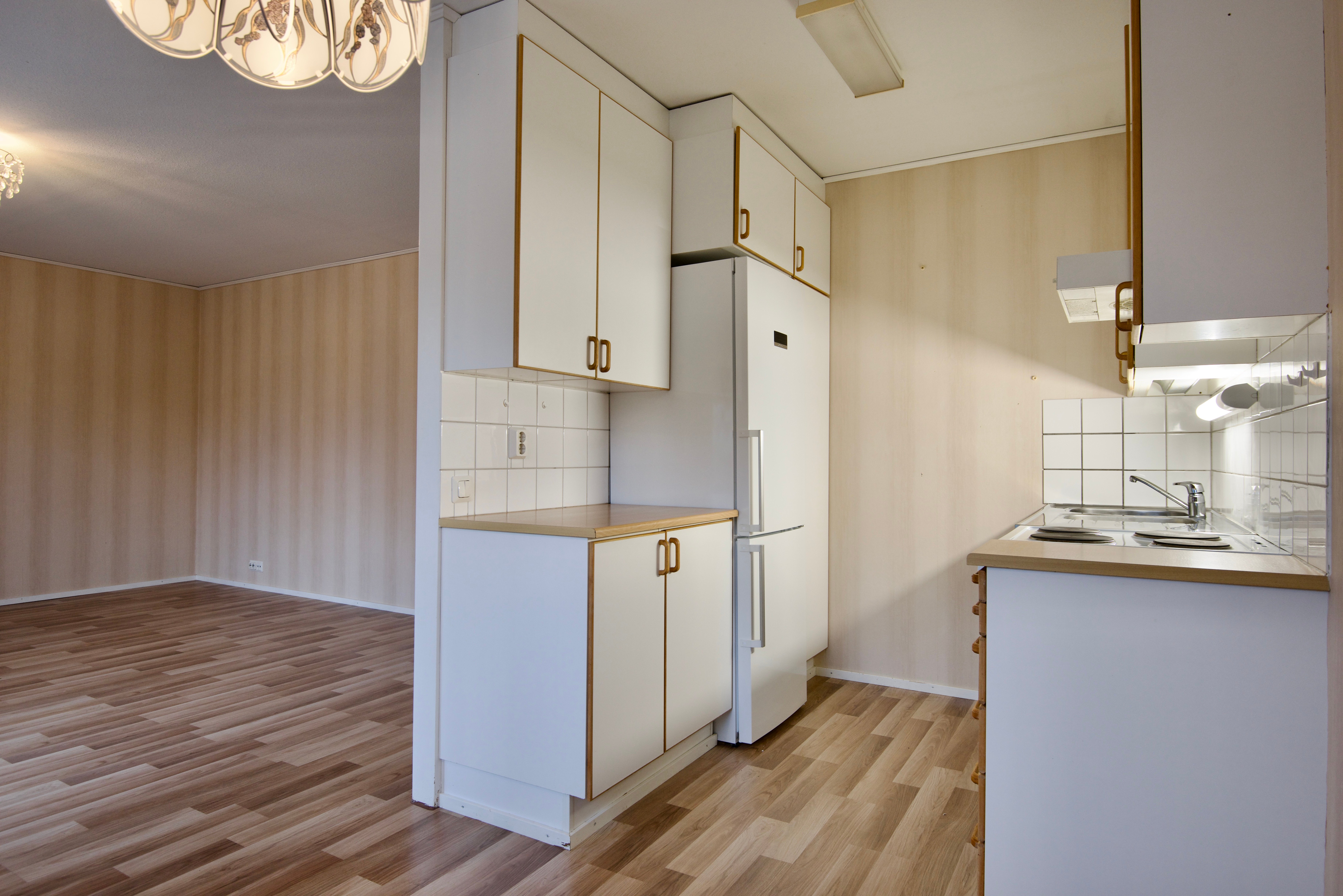 I köket har  både kyl/frys och spisen förnyats 2022, moderna vitvaror gör matlagningen enkel och bekväm.