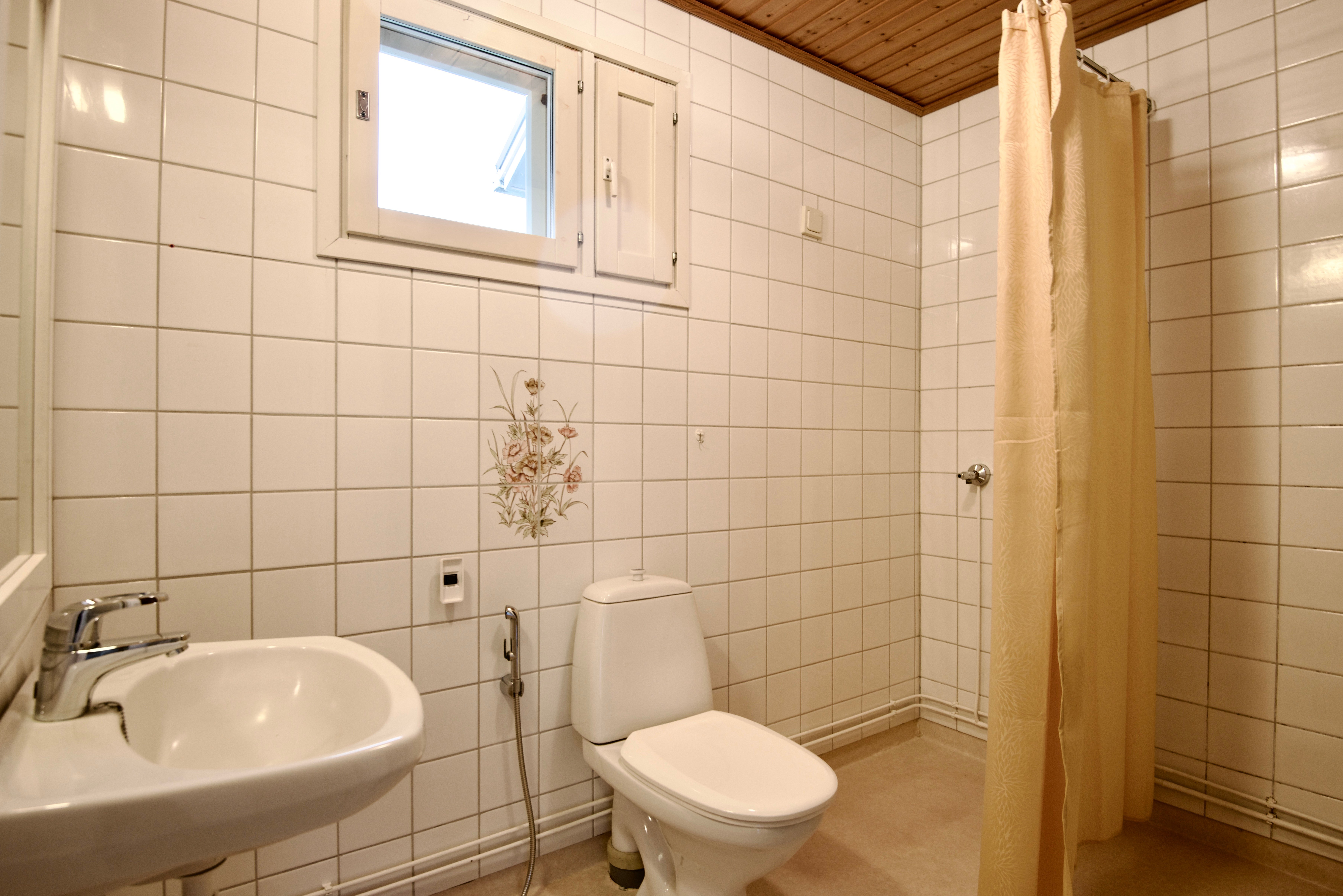 WC-istuin, suihku, pesukoneliitäntä, lattialämmitys, peili ja pesuallas