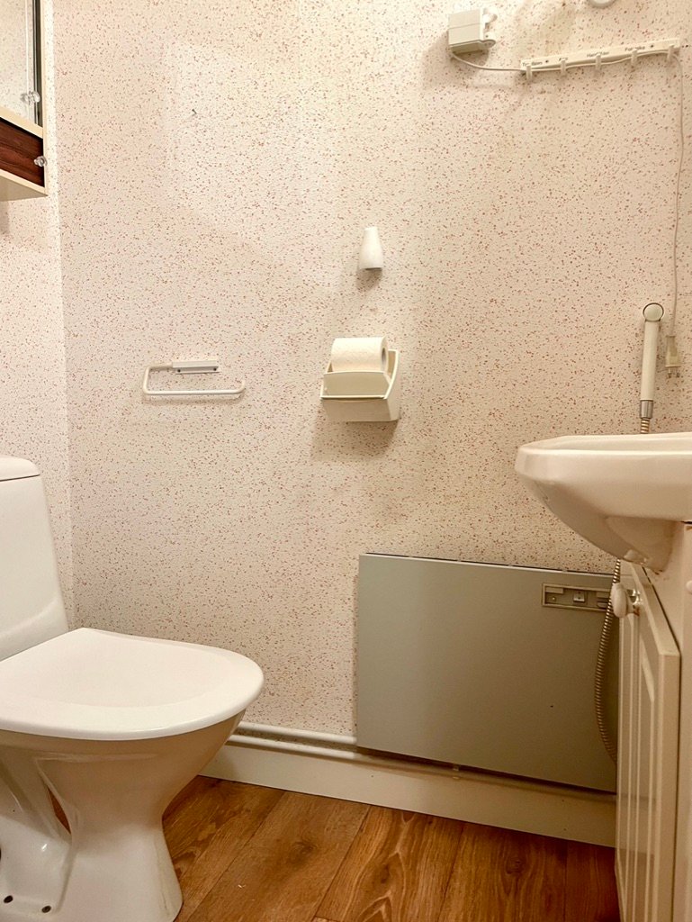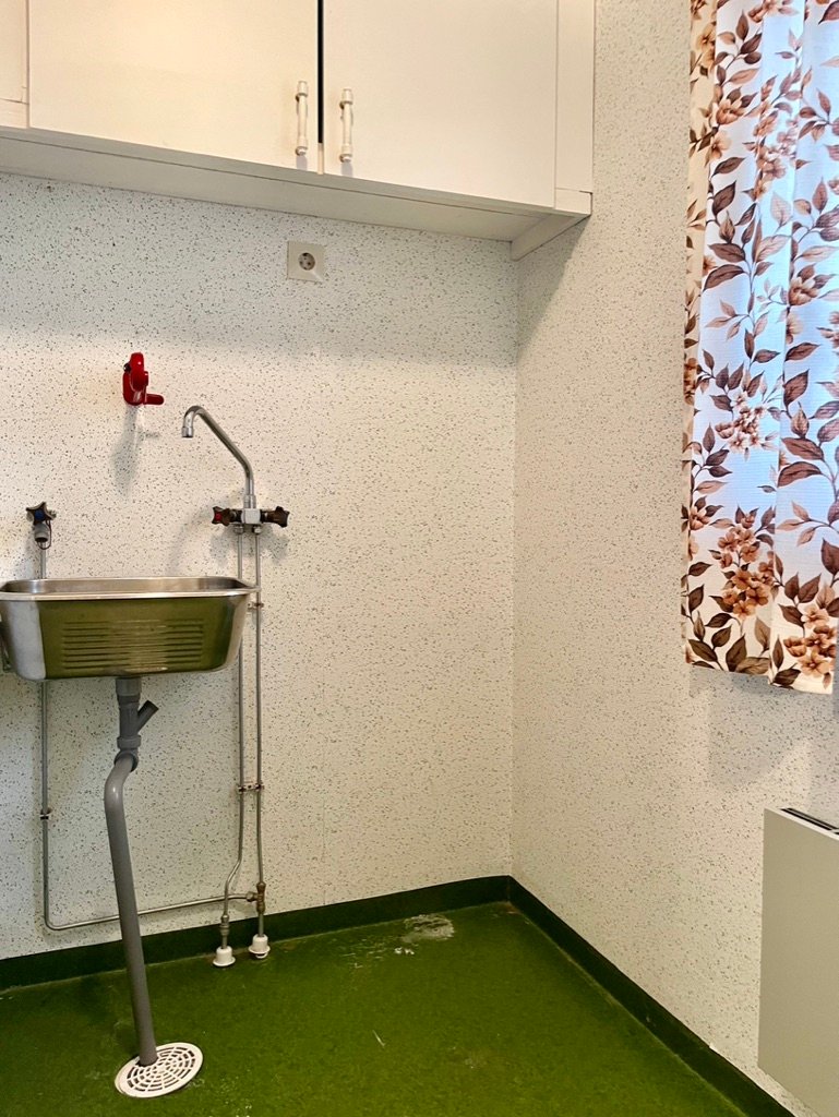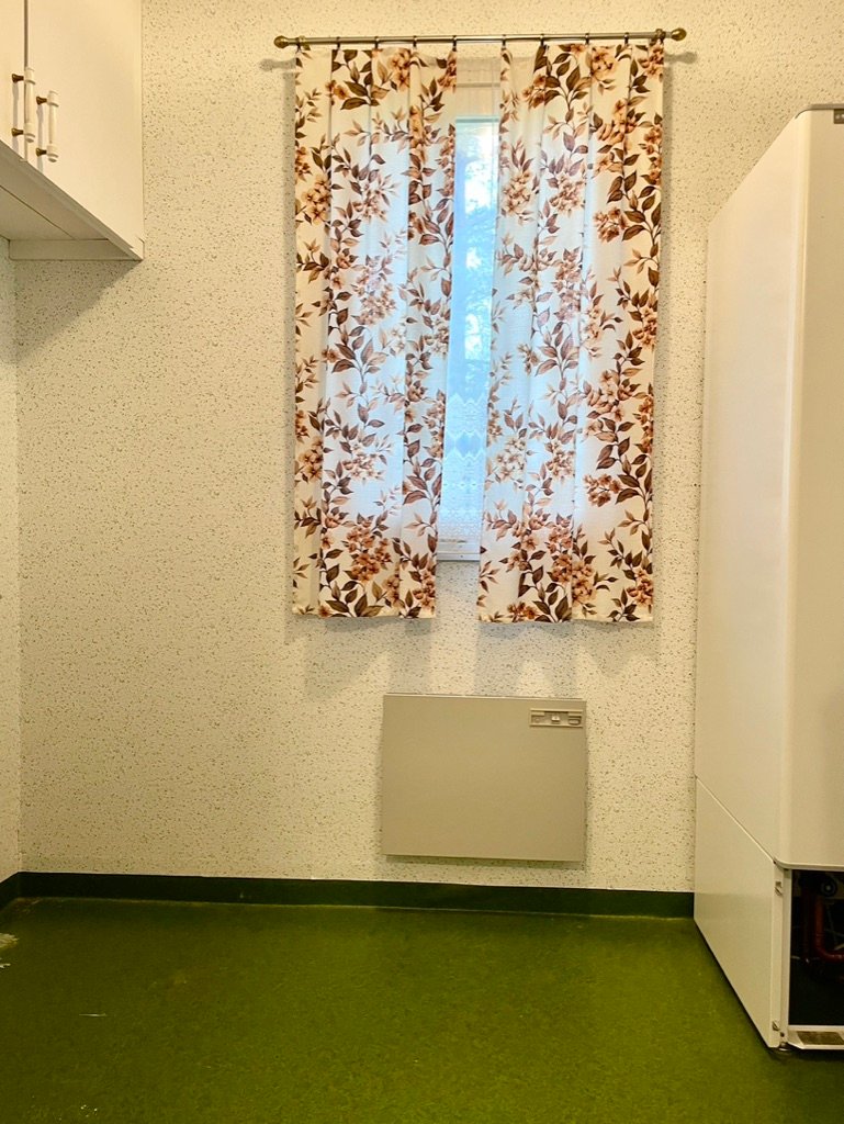 Husets interiör har en mängd olika golvytor, såsom parkett, laminat och plastmatta, vilket ger värme och mysighet.