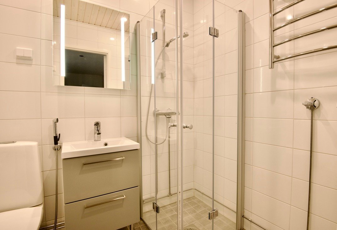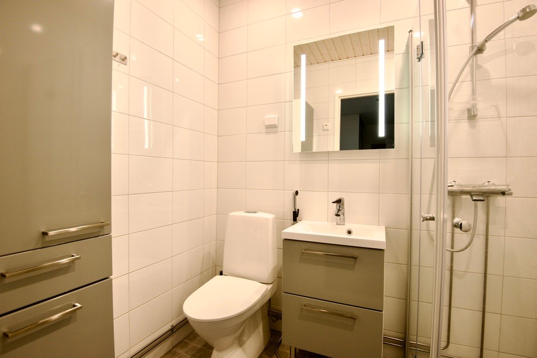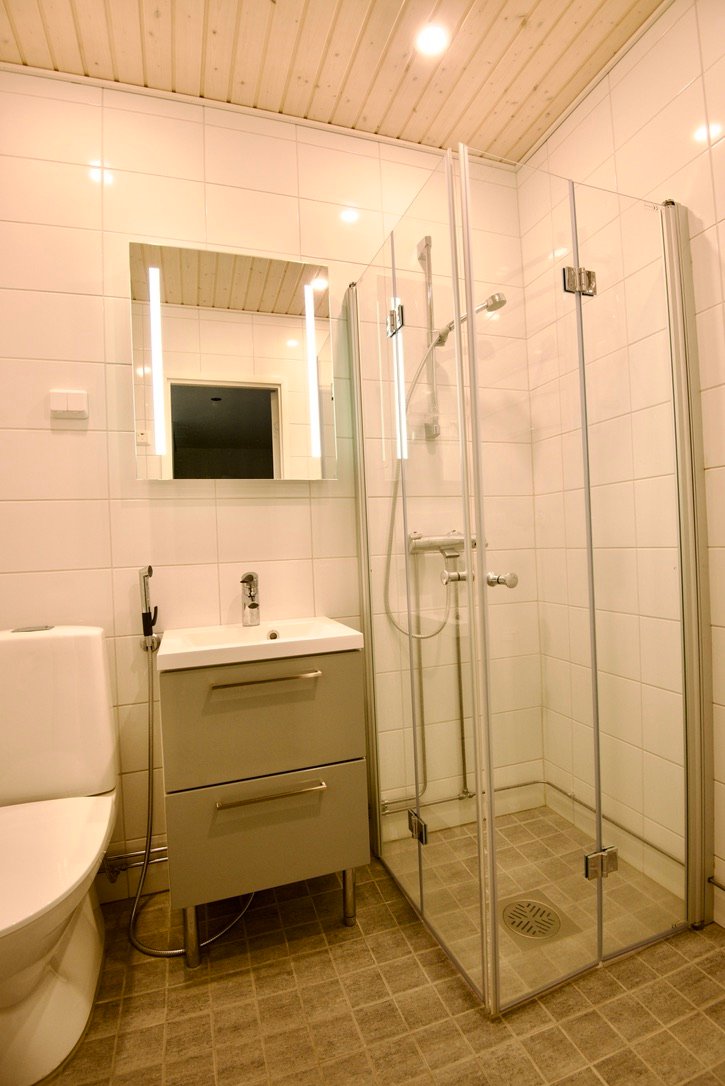 WC-istuin, suihku, suihkuseinä, pesukoneliitäntä, peili, pesuallas ja allaskaappi