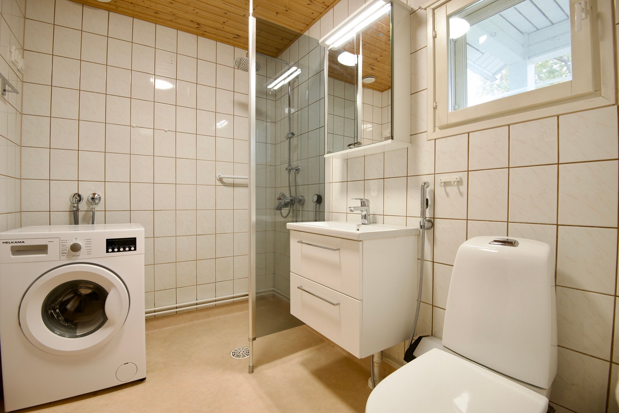 WC-istuin (Uusittu 2021), peilikaappi, allaskaappi, pesukoneliitäntä, suihkuseinä, lattialämmitys ja pesuallas