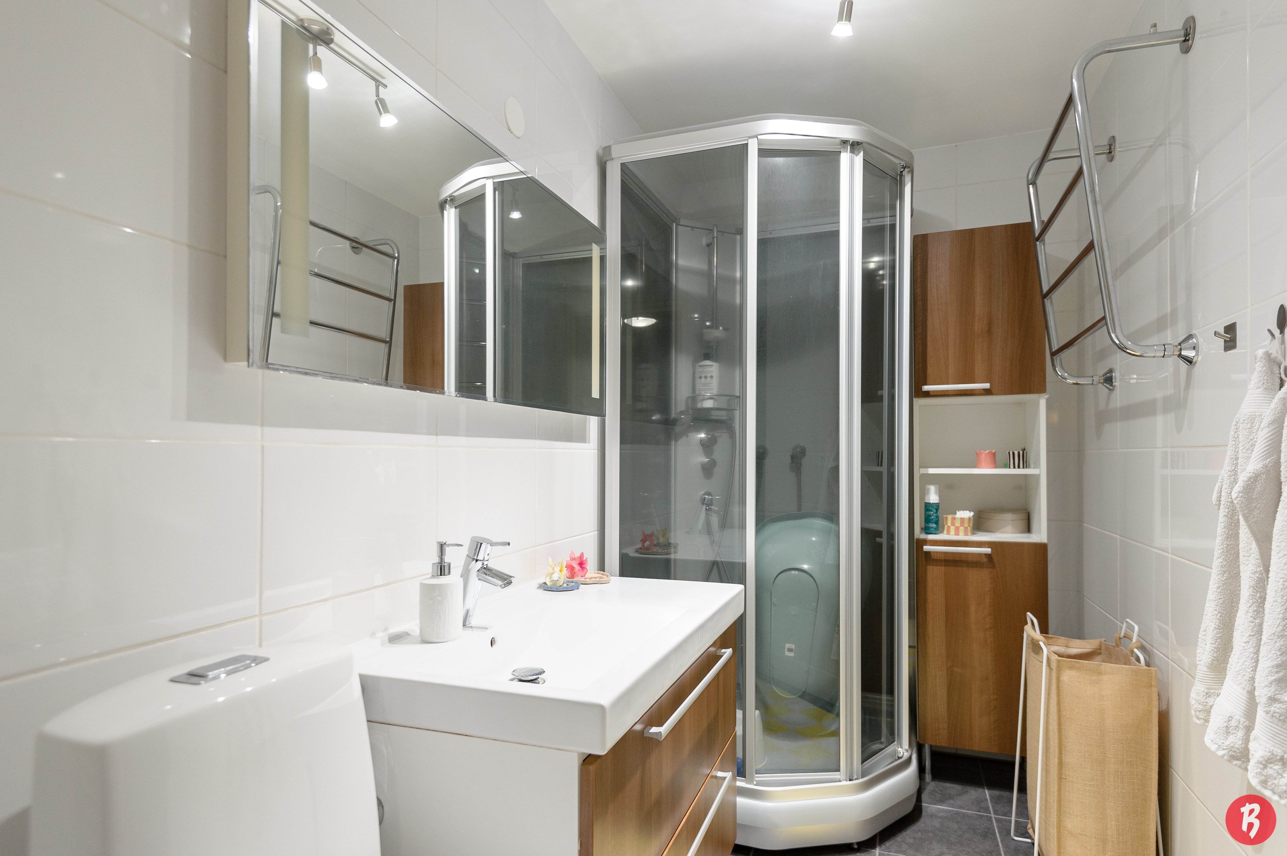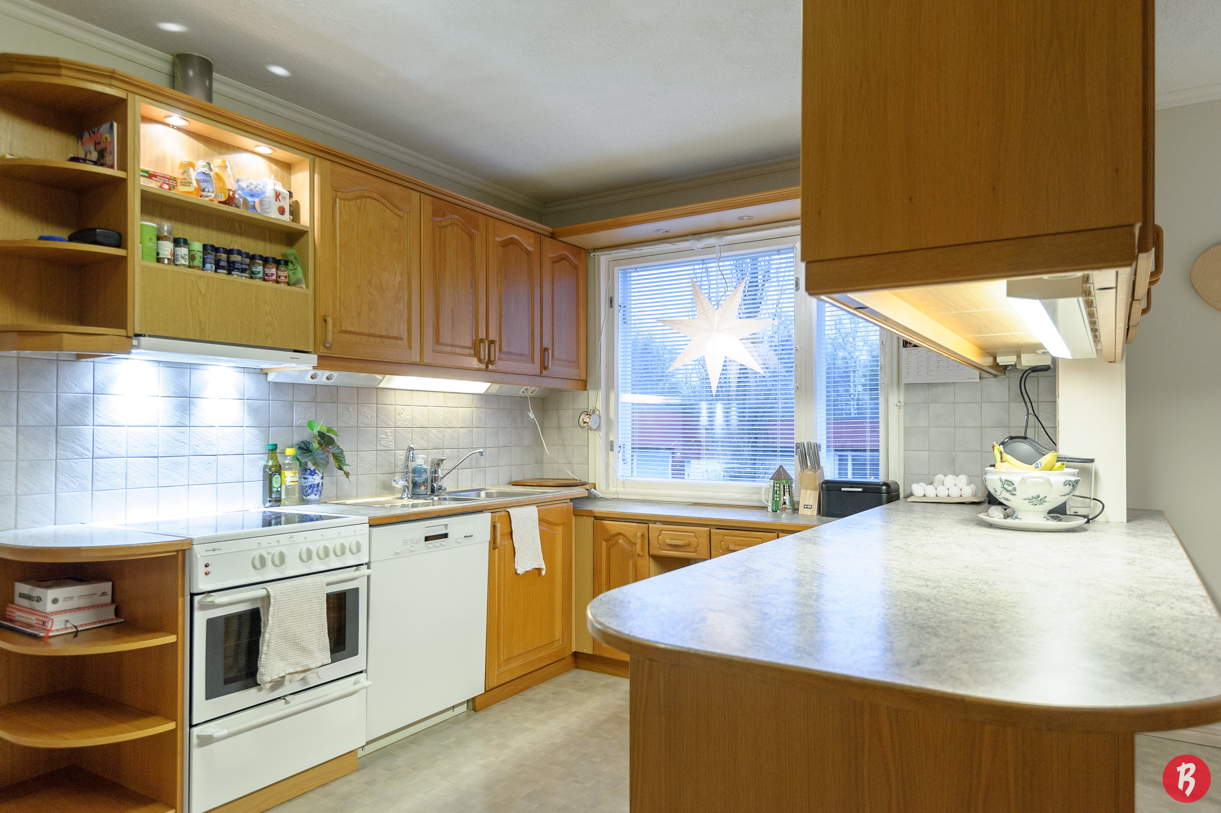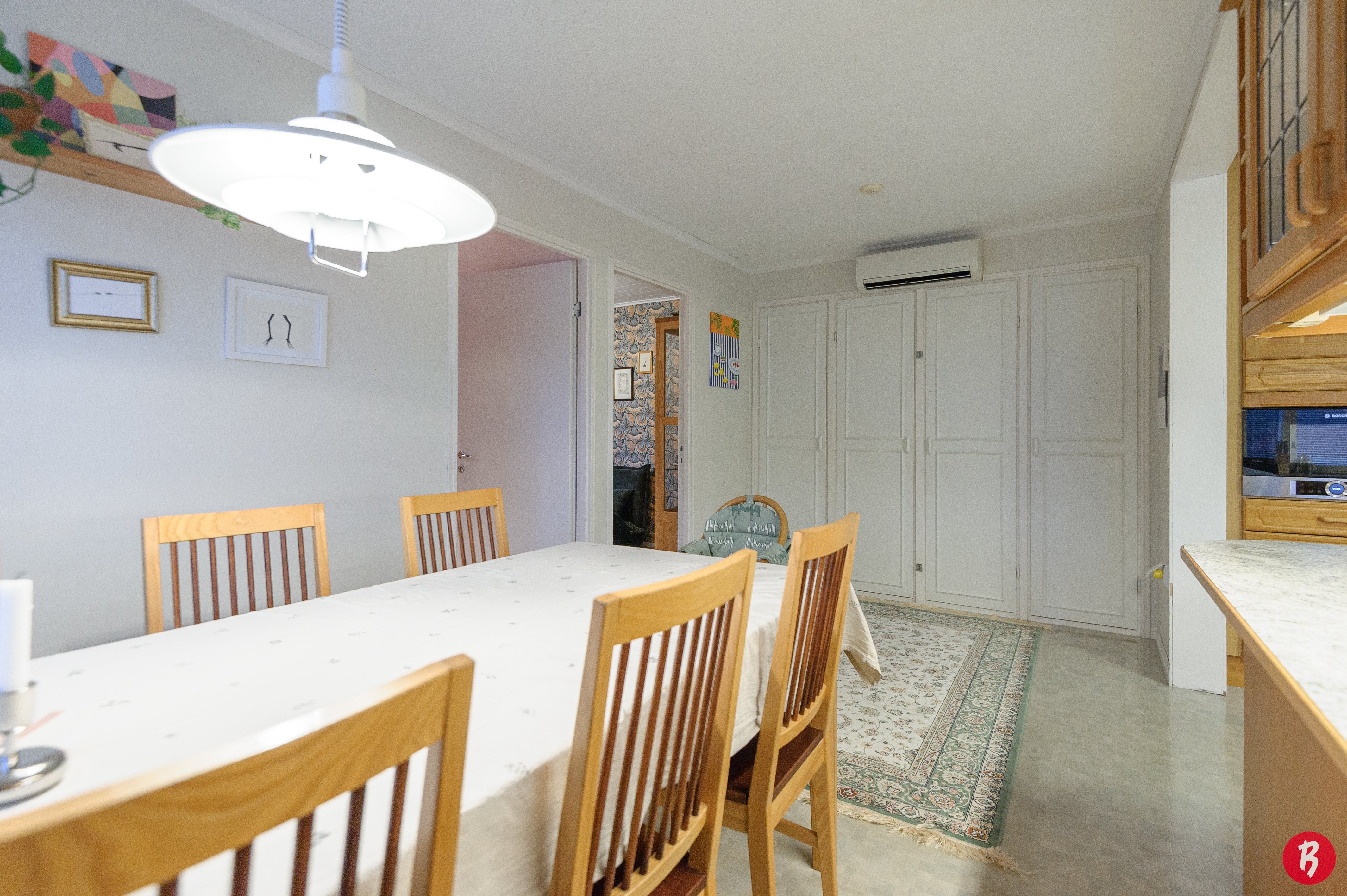 Under heta sommardagar svalkar kökets luftpump skönt. Uppvärmningen sköts med fjärrvärme, vilket garanterar ett energieffektivt boende. Du kan även njuta av värmen från en stämningsfull spis under vinterns kvällar.