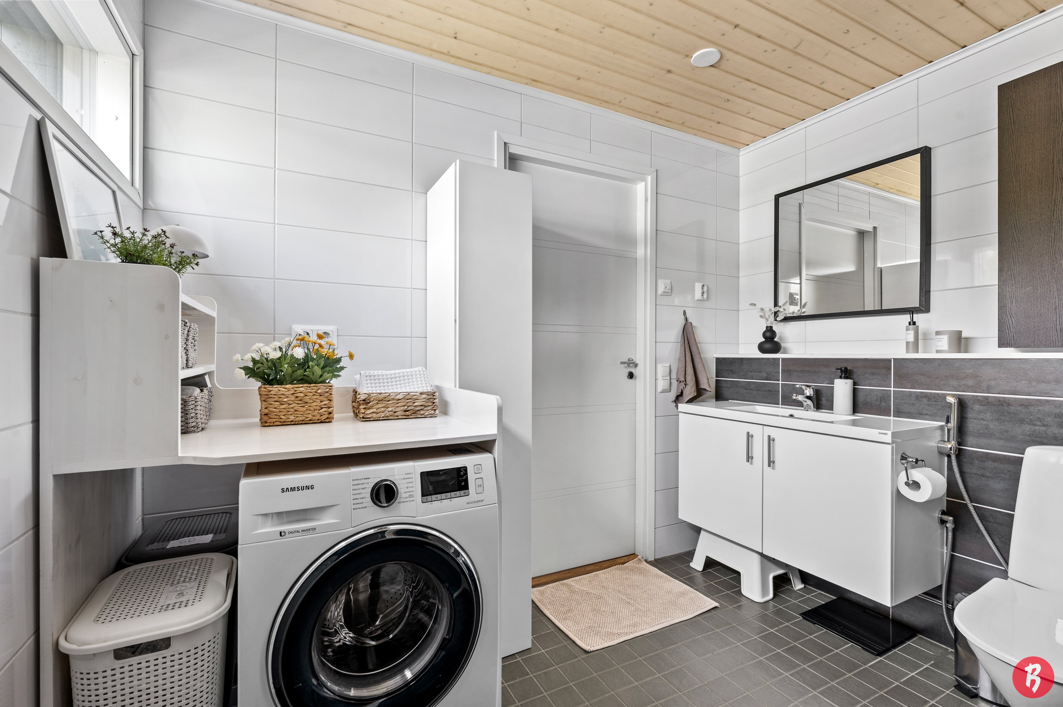 WC-istuin, suihku, pesukone, kuivausrumpu, pesukoneliitäntä, lattialämmitys ja peili