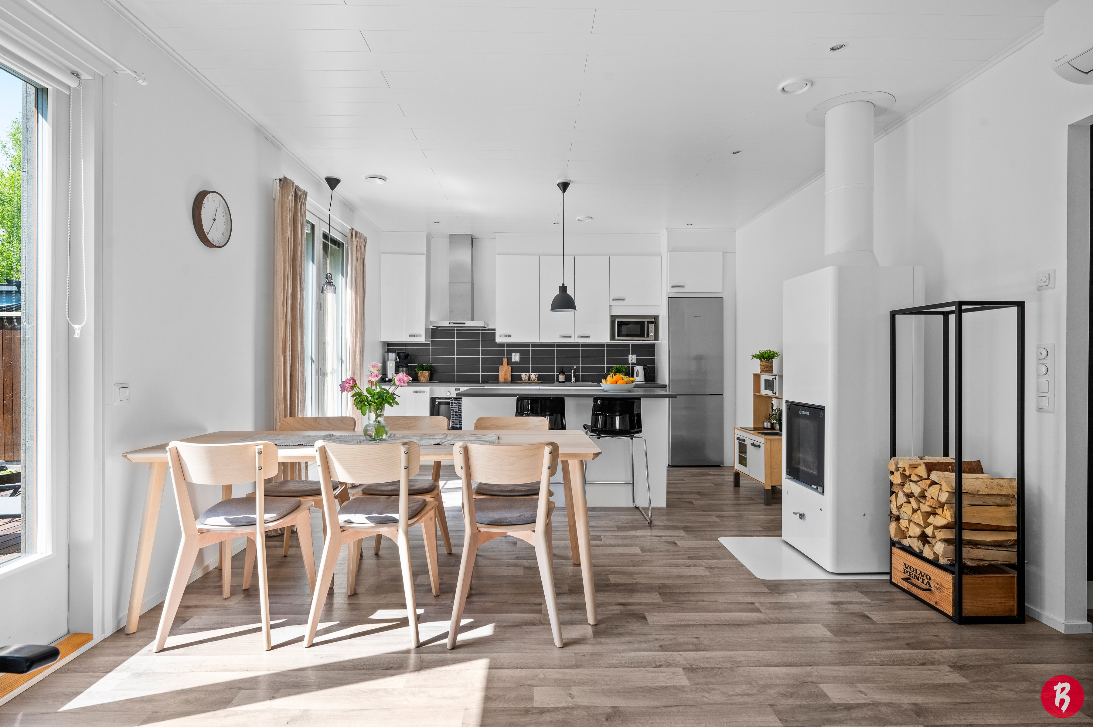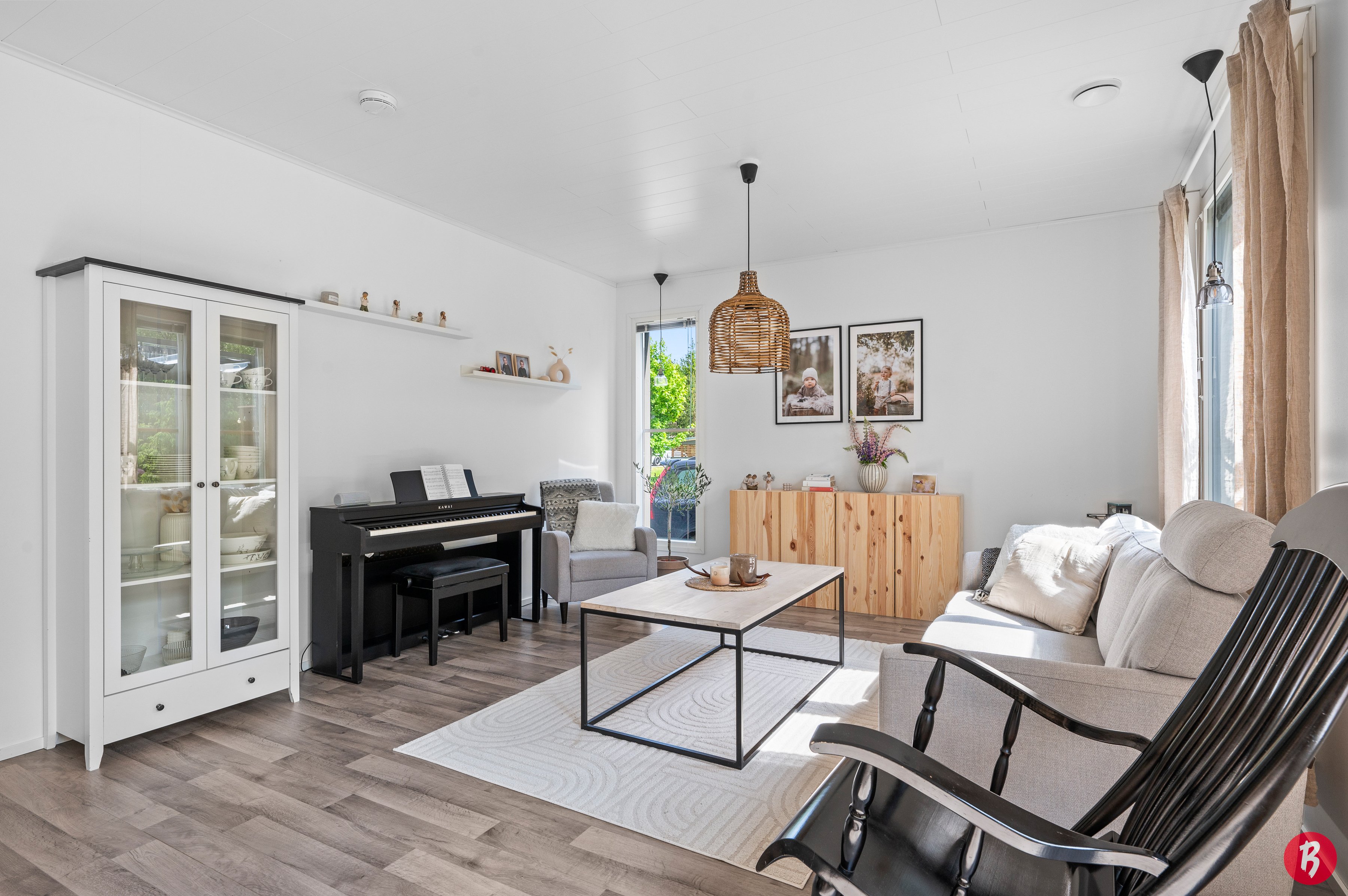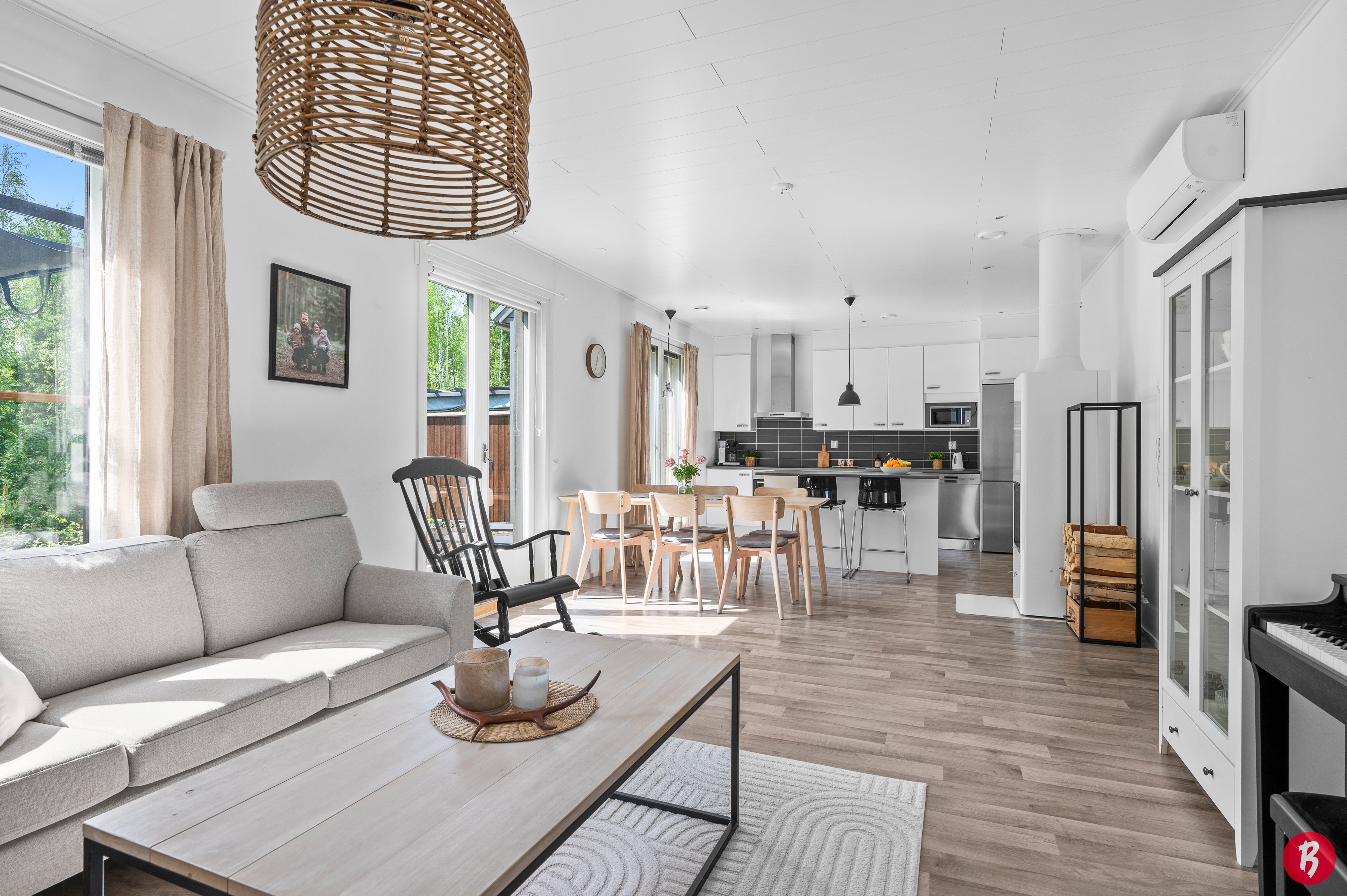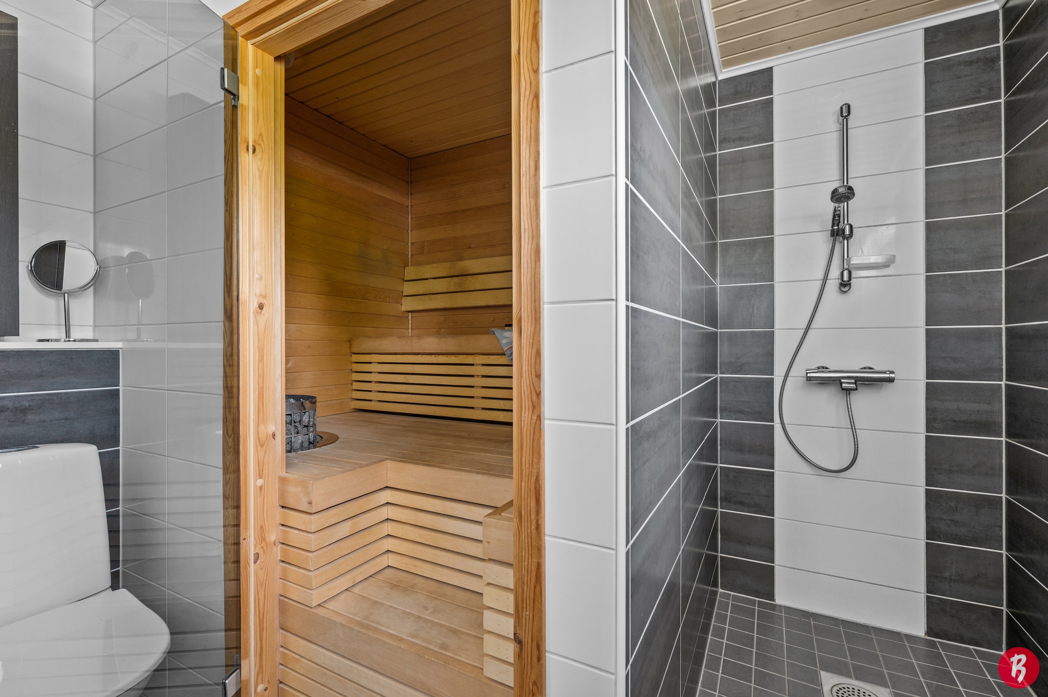 Lägenheten har ett rymligt vardagsrum med laminatgolv och en mysig öppen spis som skapar en inbjudande atmosfär. Köket är fullt utrustat med moderna vitvaror och har en elegant arbetsbänk i kvarts. Här finns också ett helkaklat badrum med golvvärme och en egen bastu för avkopplande stunder.