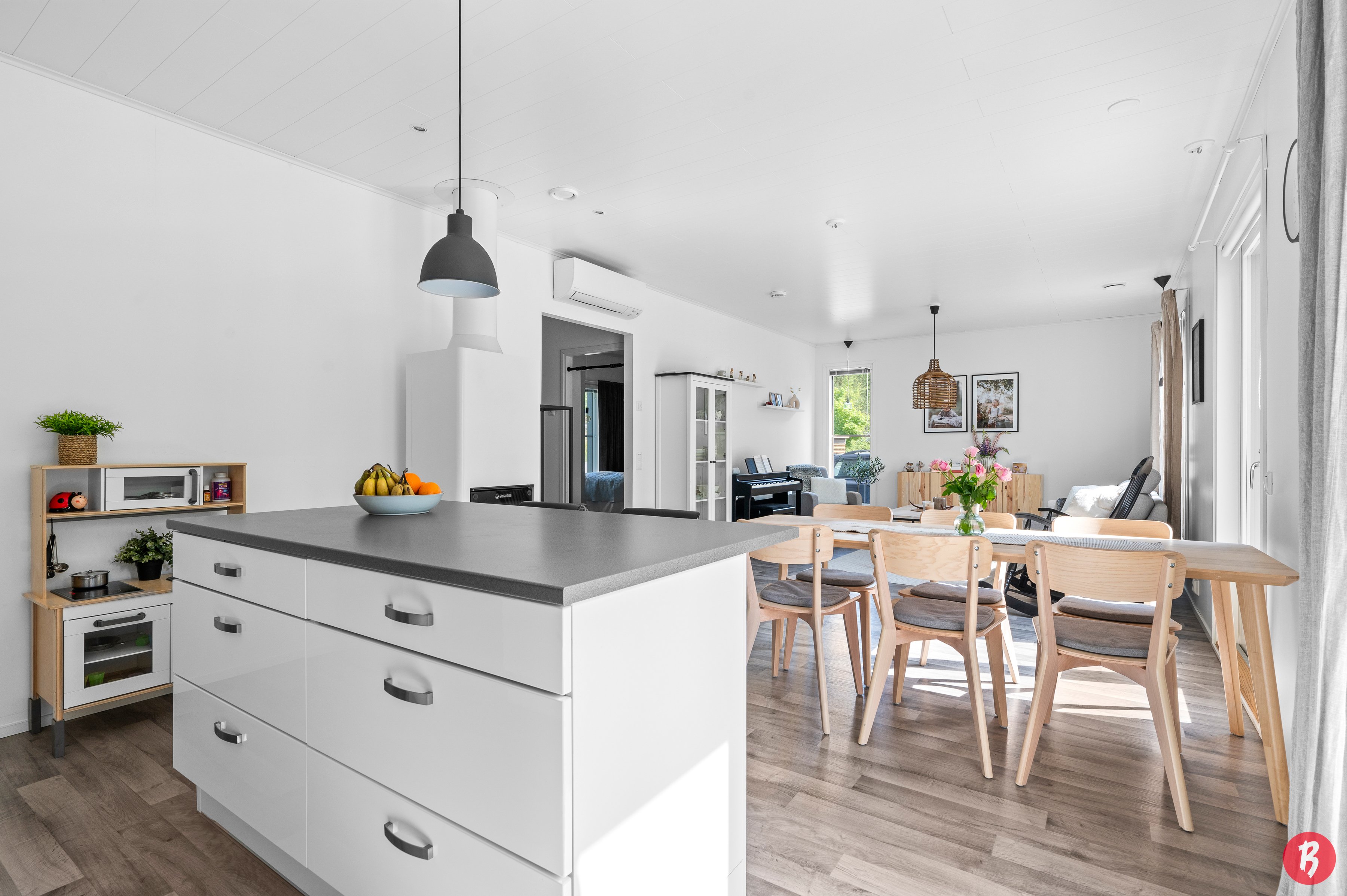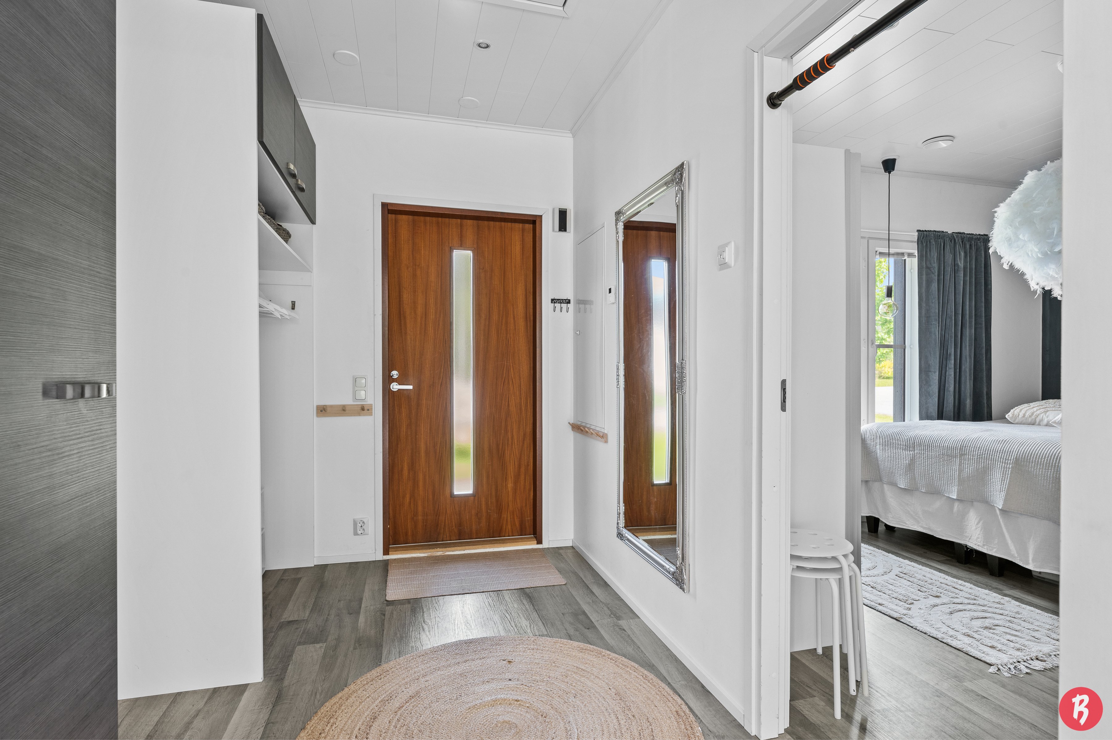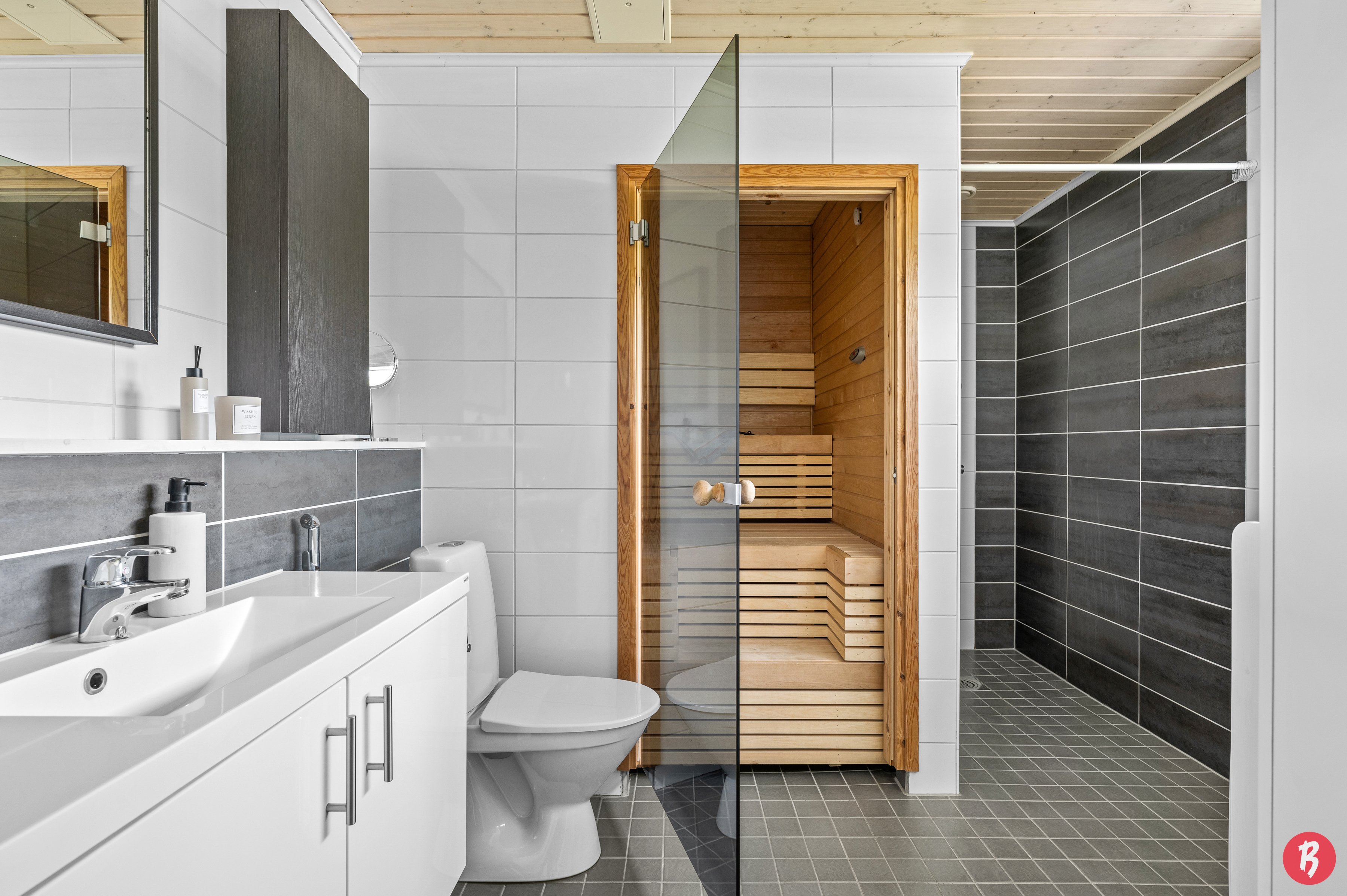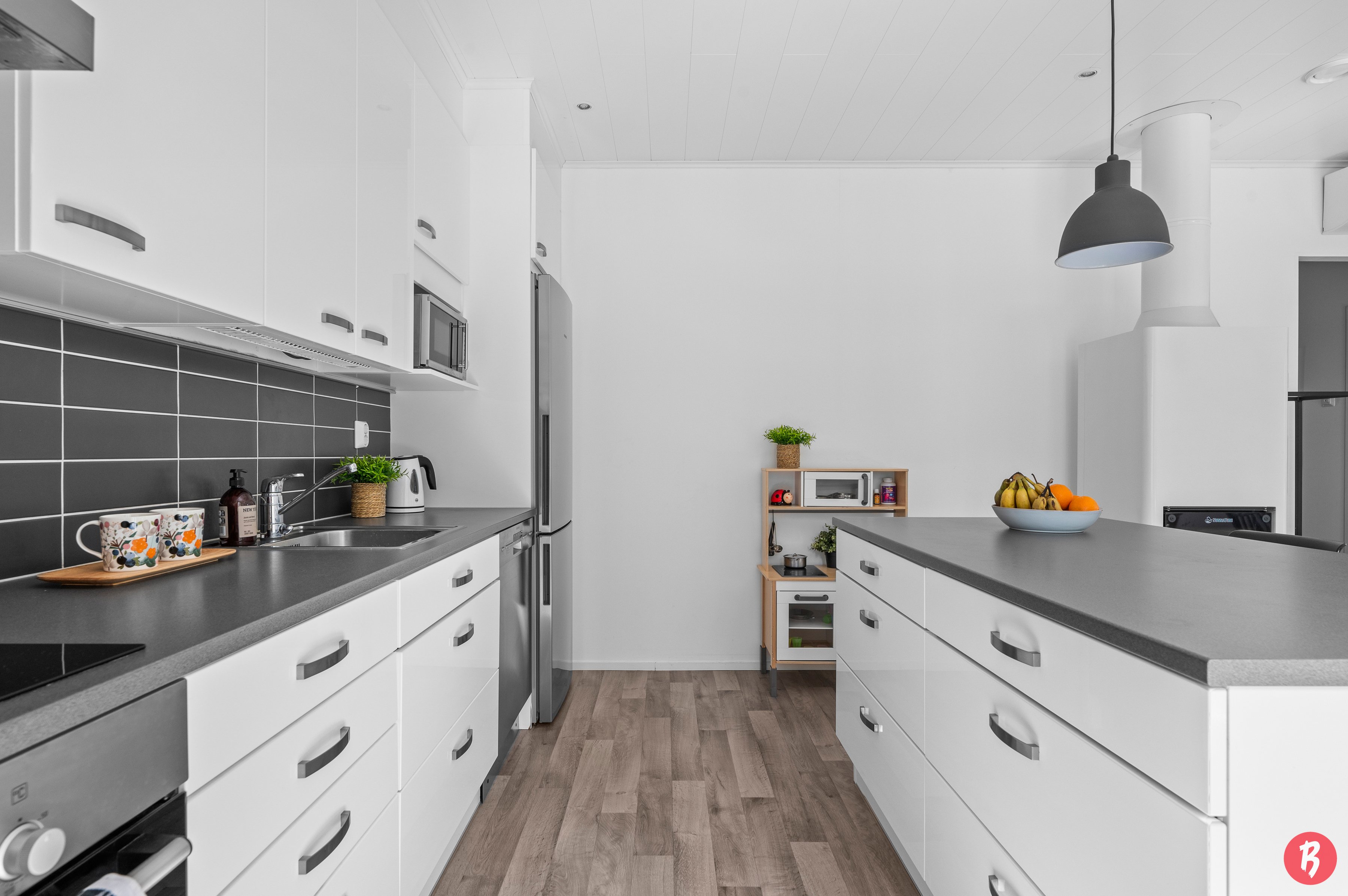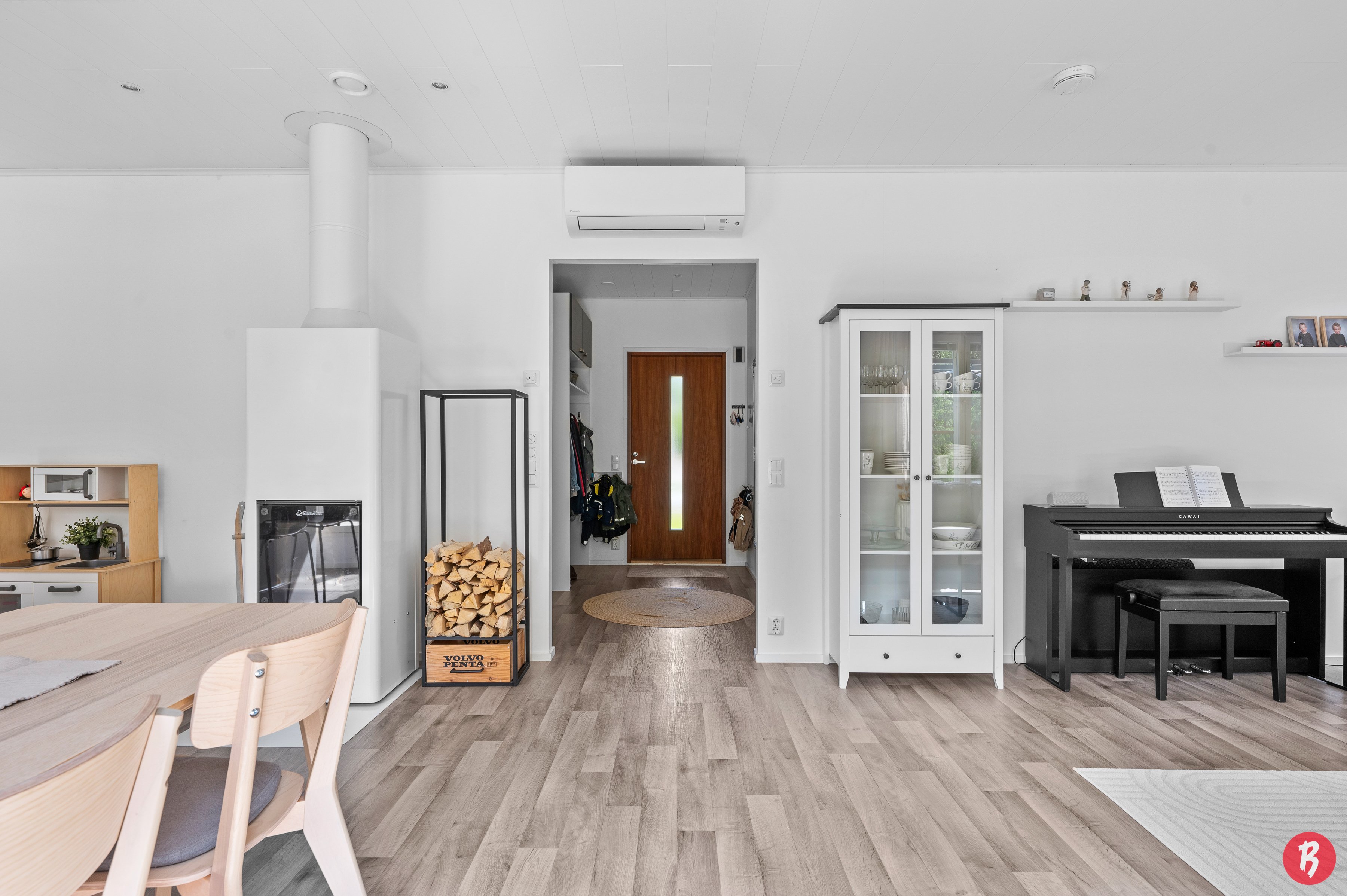 Lägenheten har ett rymligt vardagsrum med laminatgolv och en mysig öppen spis som skapar en inbjudande atmosfär. Köket är fullt utrustat med moderna vitvaror och har en elegant arbetsbänk i kvarts. Här finns också ett helkaklat badrum med golvvärme och en egen bastu för avkopplande stunder.