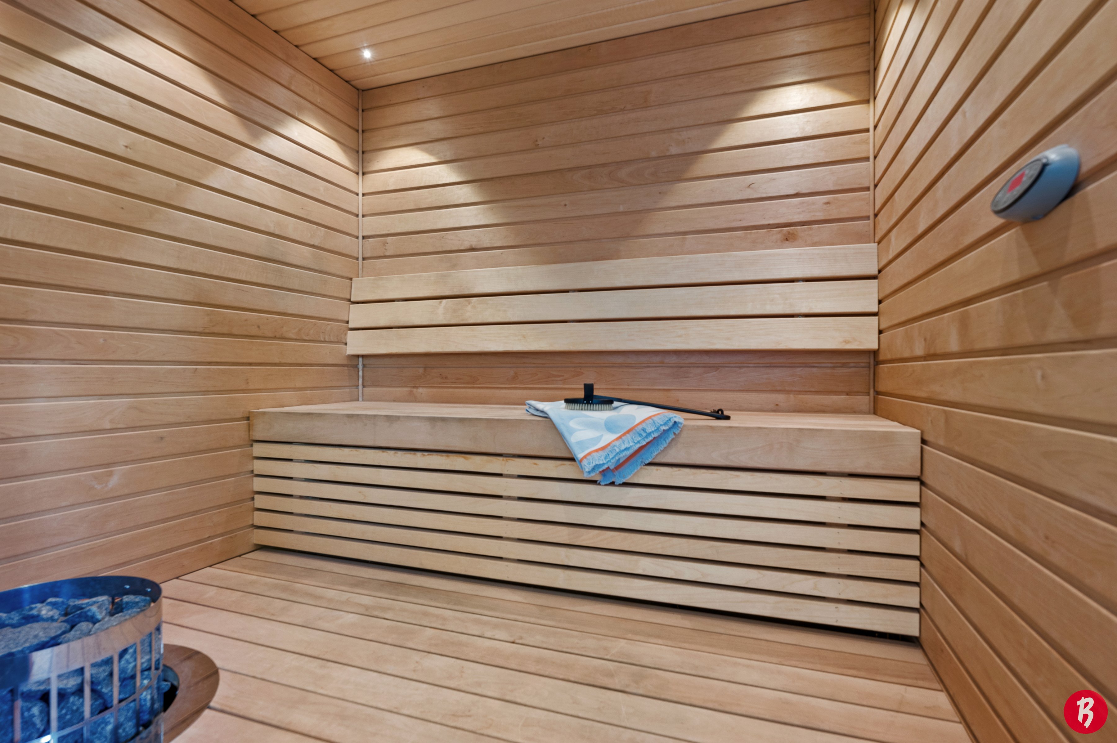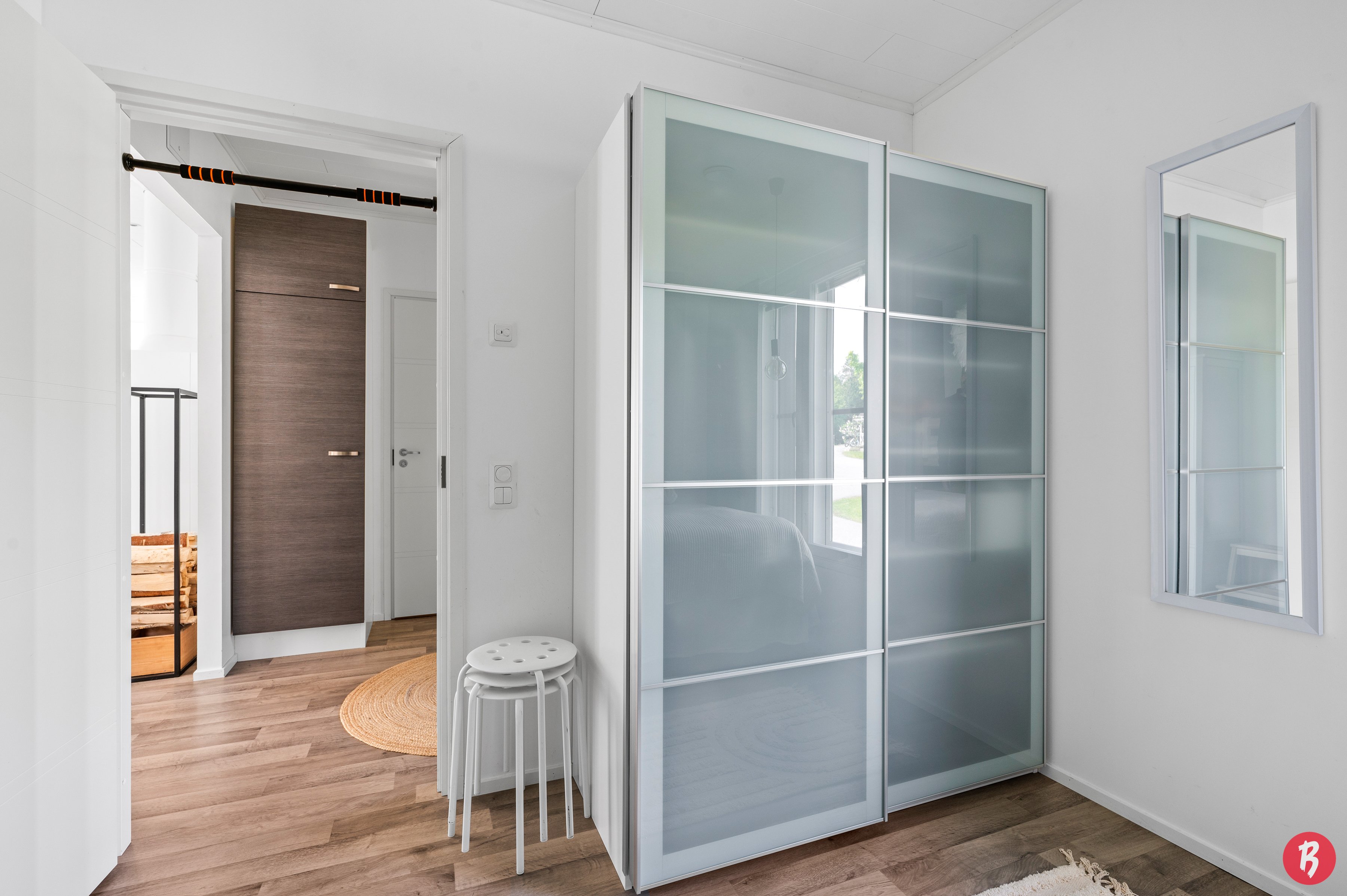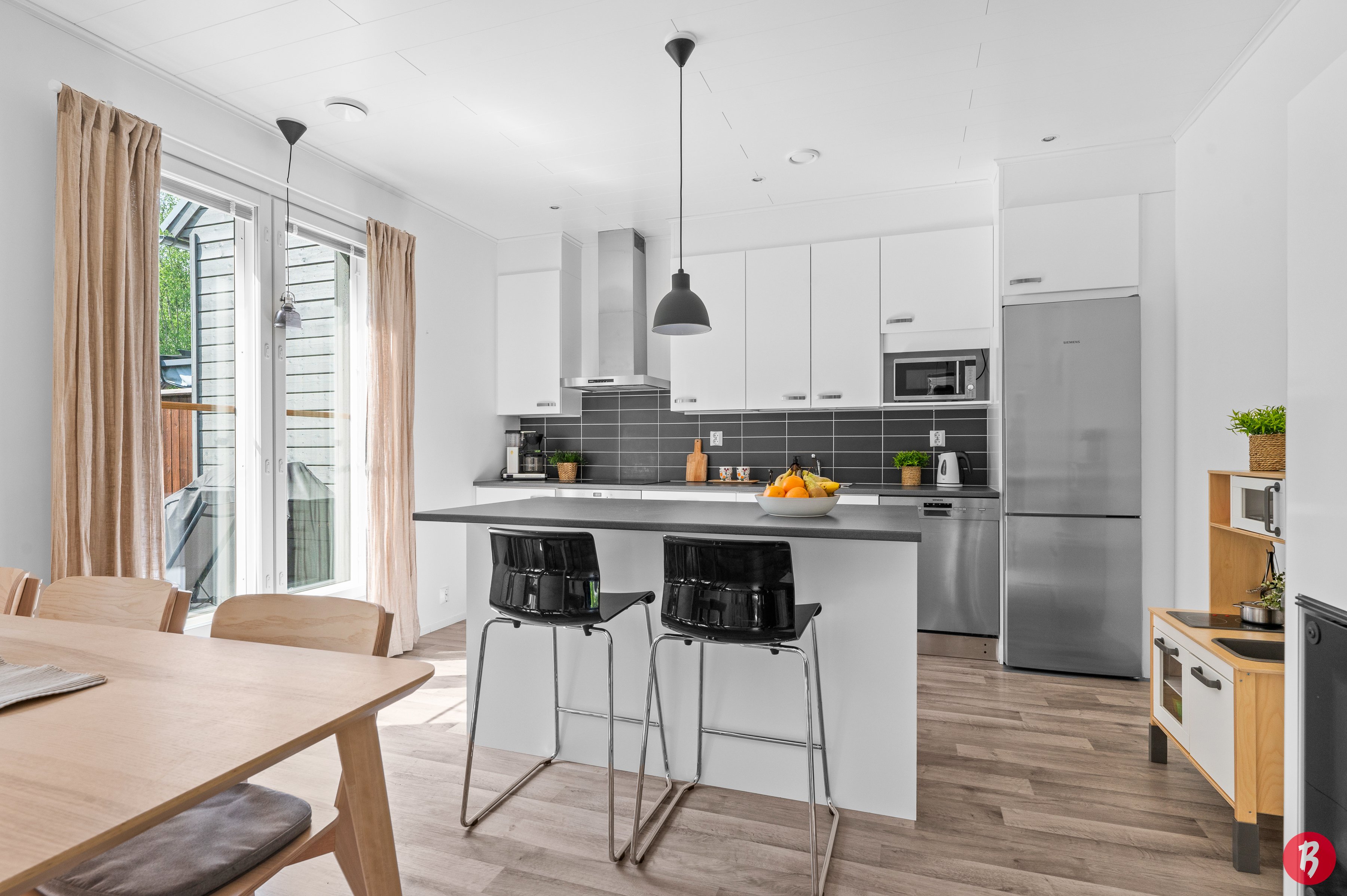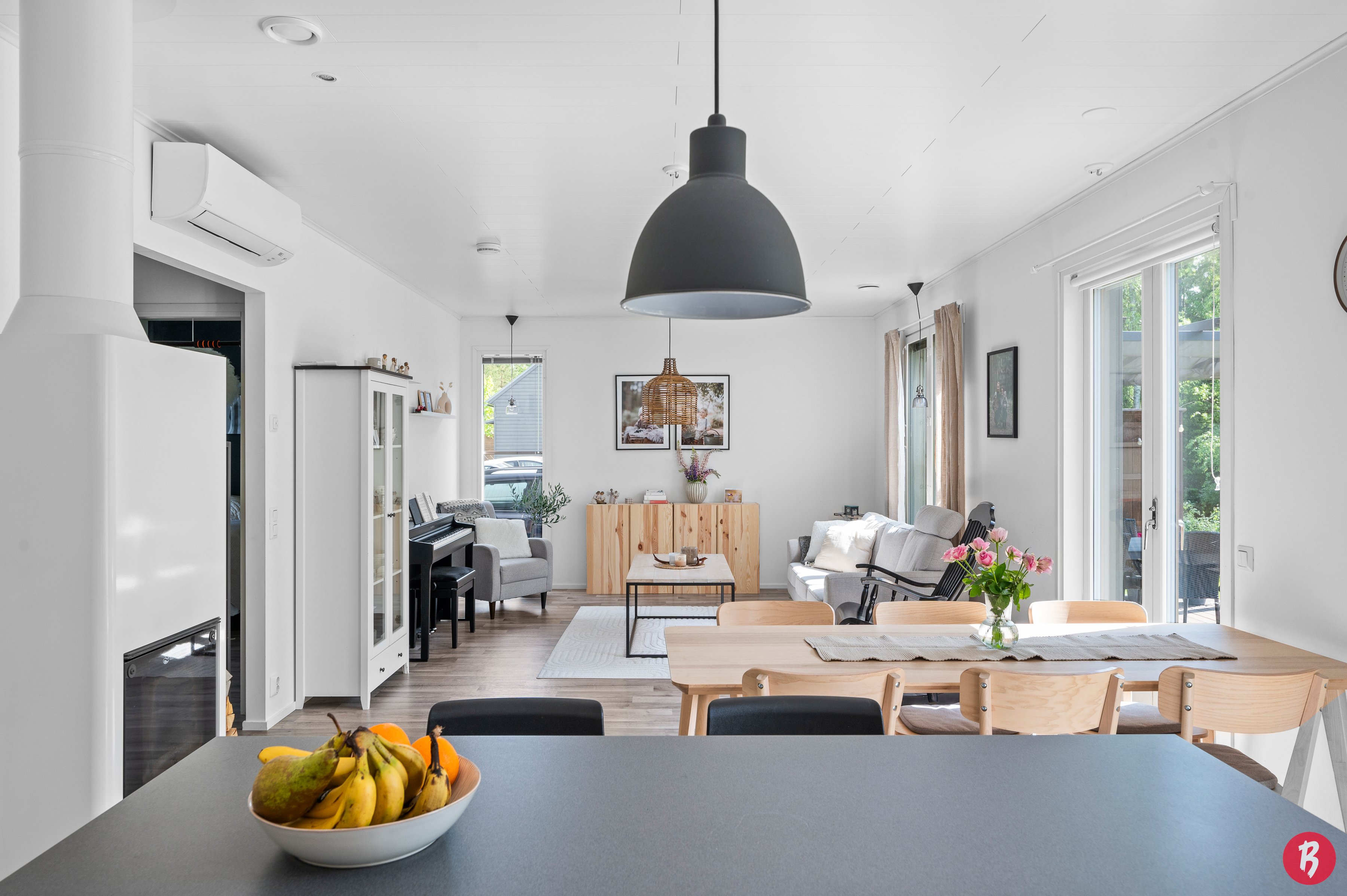 Lägenheten har ett rymligt vardagsrum med laminatgolv och en mysig öppen spis som skapar en inbjudande atmosfär. Köket är fullt utrustat med moderna vitvaror och har en elegant arbetsbänk i kvarts. Här finns också ett helkaklat badrum med golvvärme och en egen bastu för avkopplande stunder.