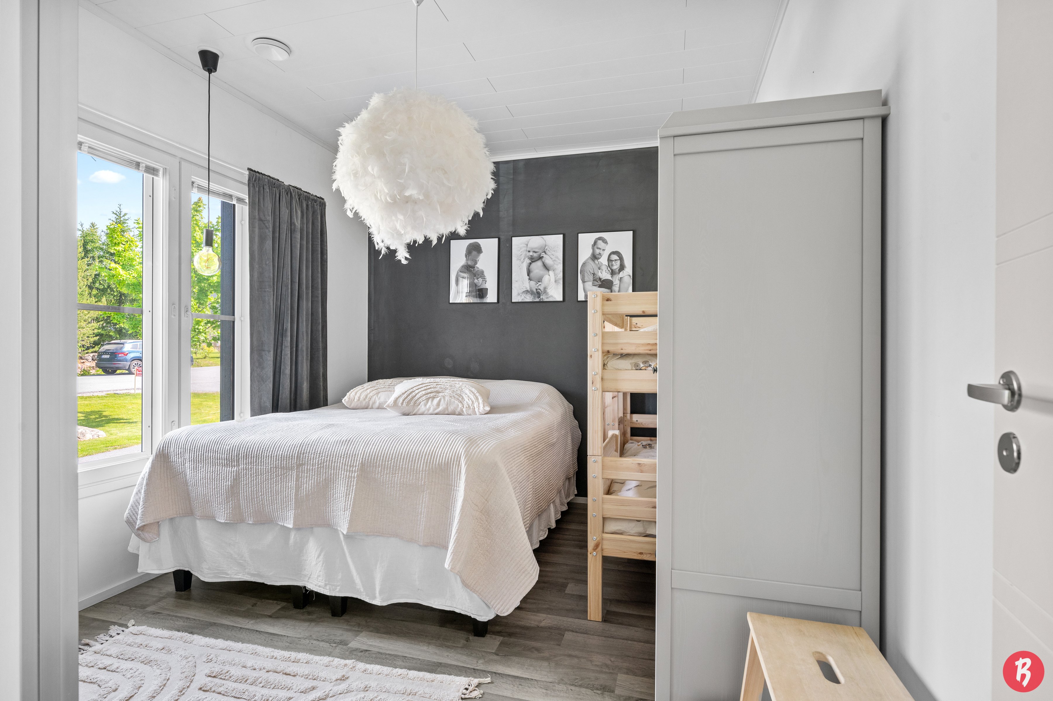 Det finns ett sovrum med laminatgolv och målade väggar, vilket ger en lugn och behaglig miljö för vila. Utanför hittar du en härlig terrass där du kan njuta av den natursköna utsikten mot skogen.