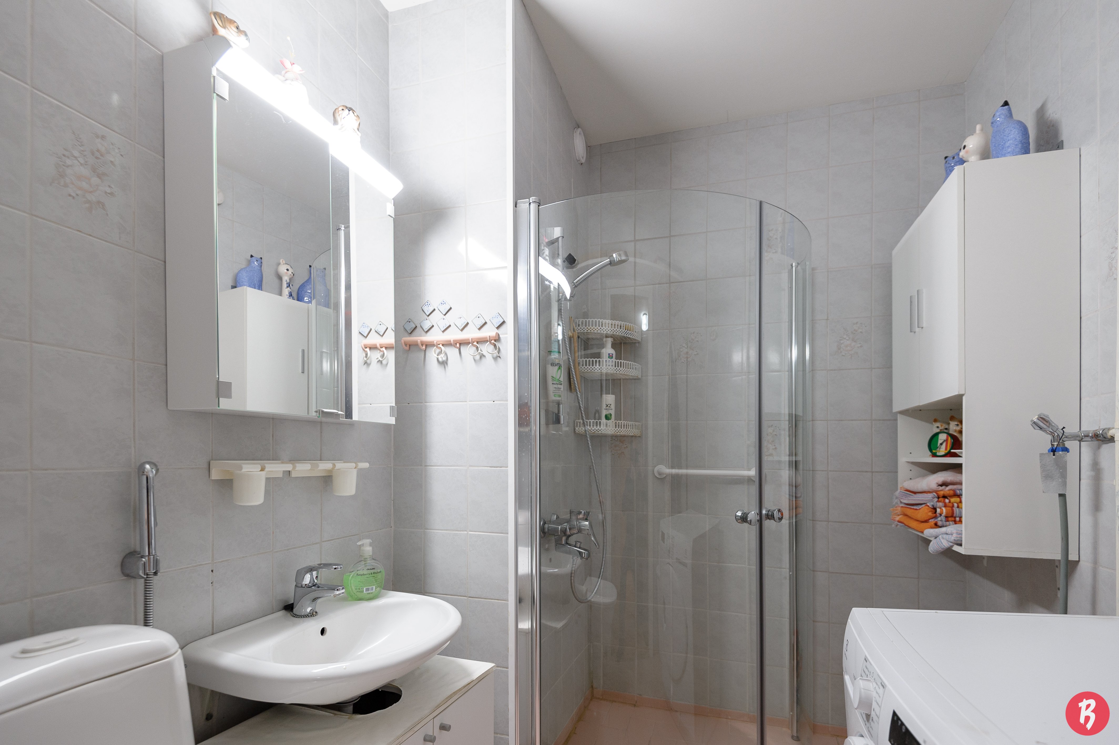 WC-istuin, pesuallas, allaskaappi, bidee-suihku, peilikaappi, suihku, pesukoneliitäntä ja suihku-ovet