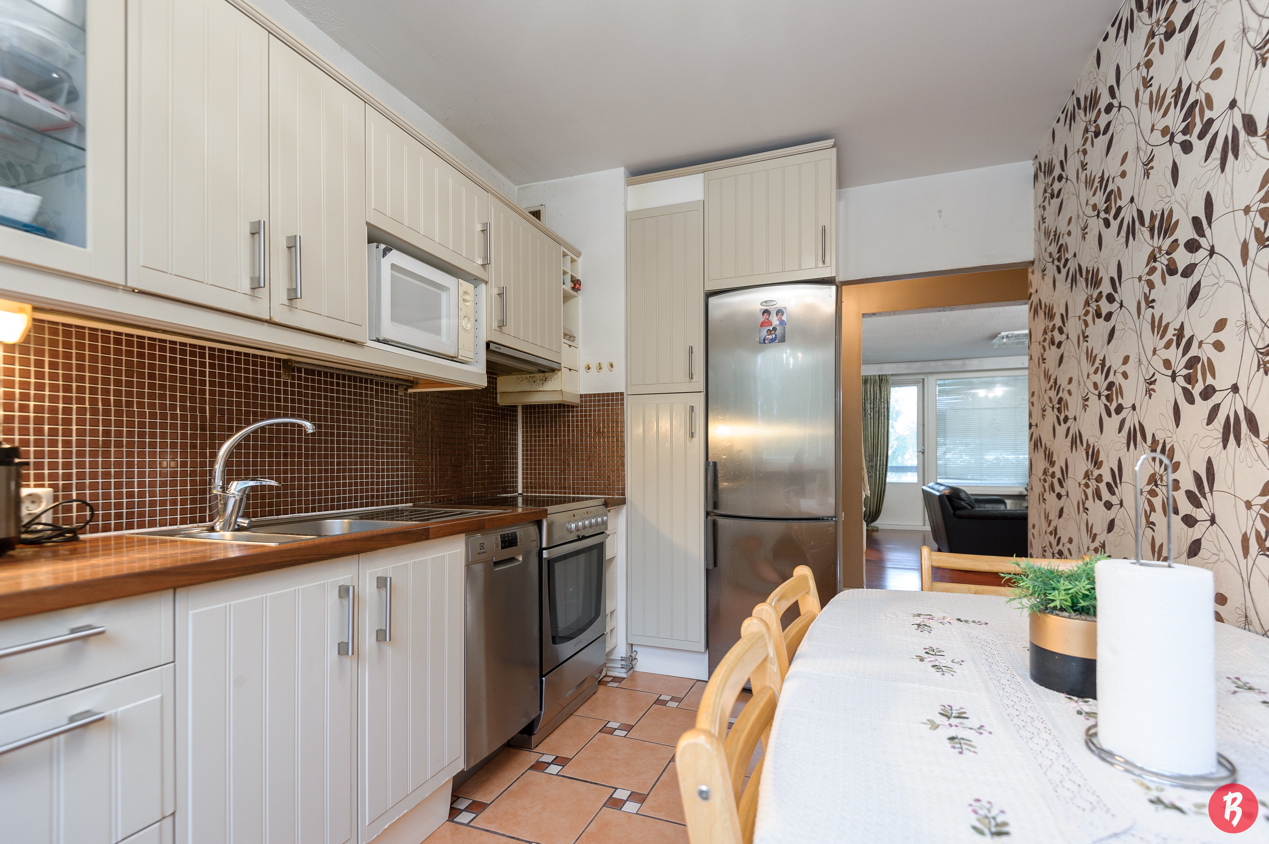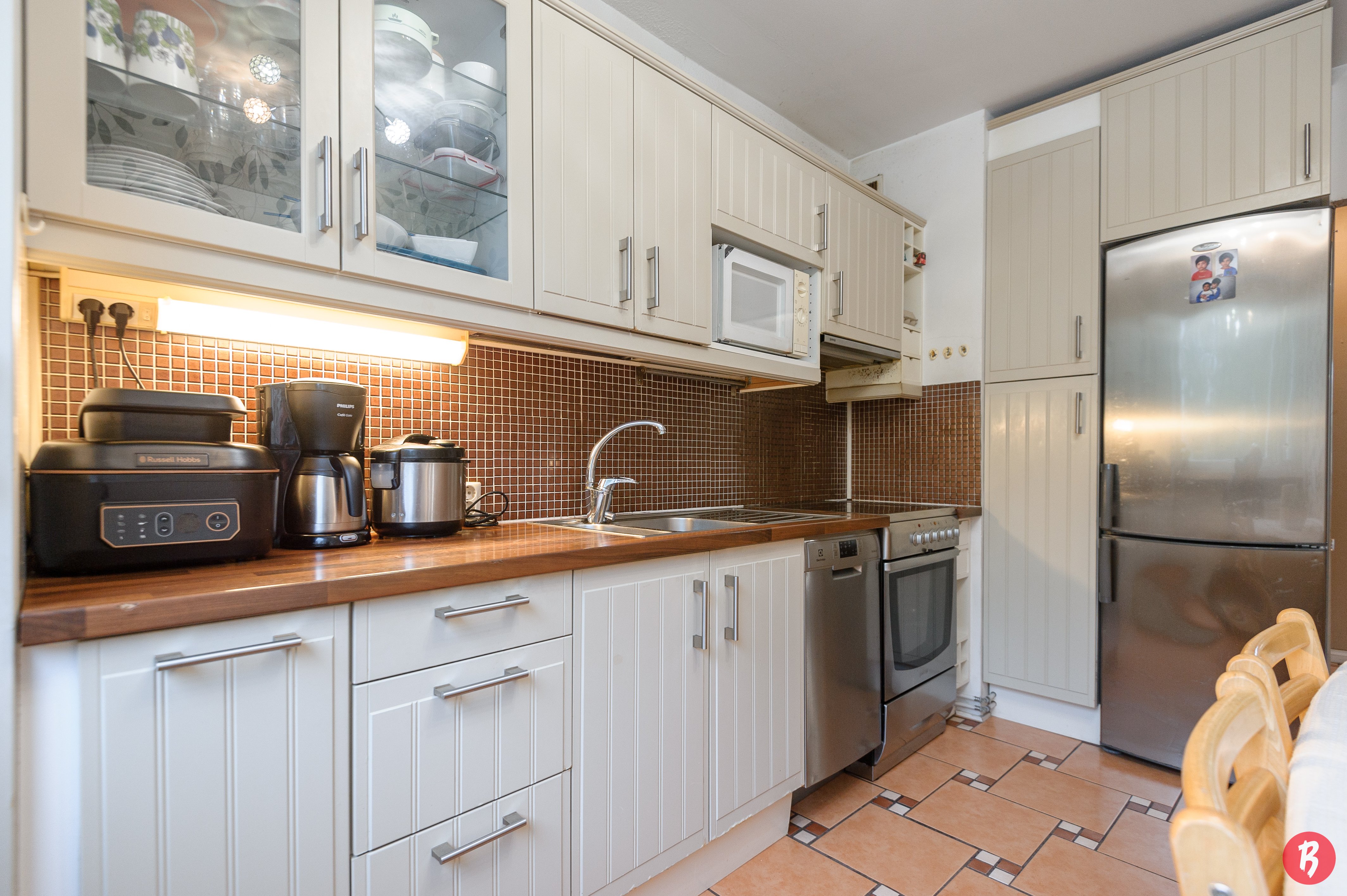 Köket är välutrustat och i badrummet finns anslutning för tvättmaskin.