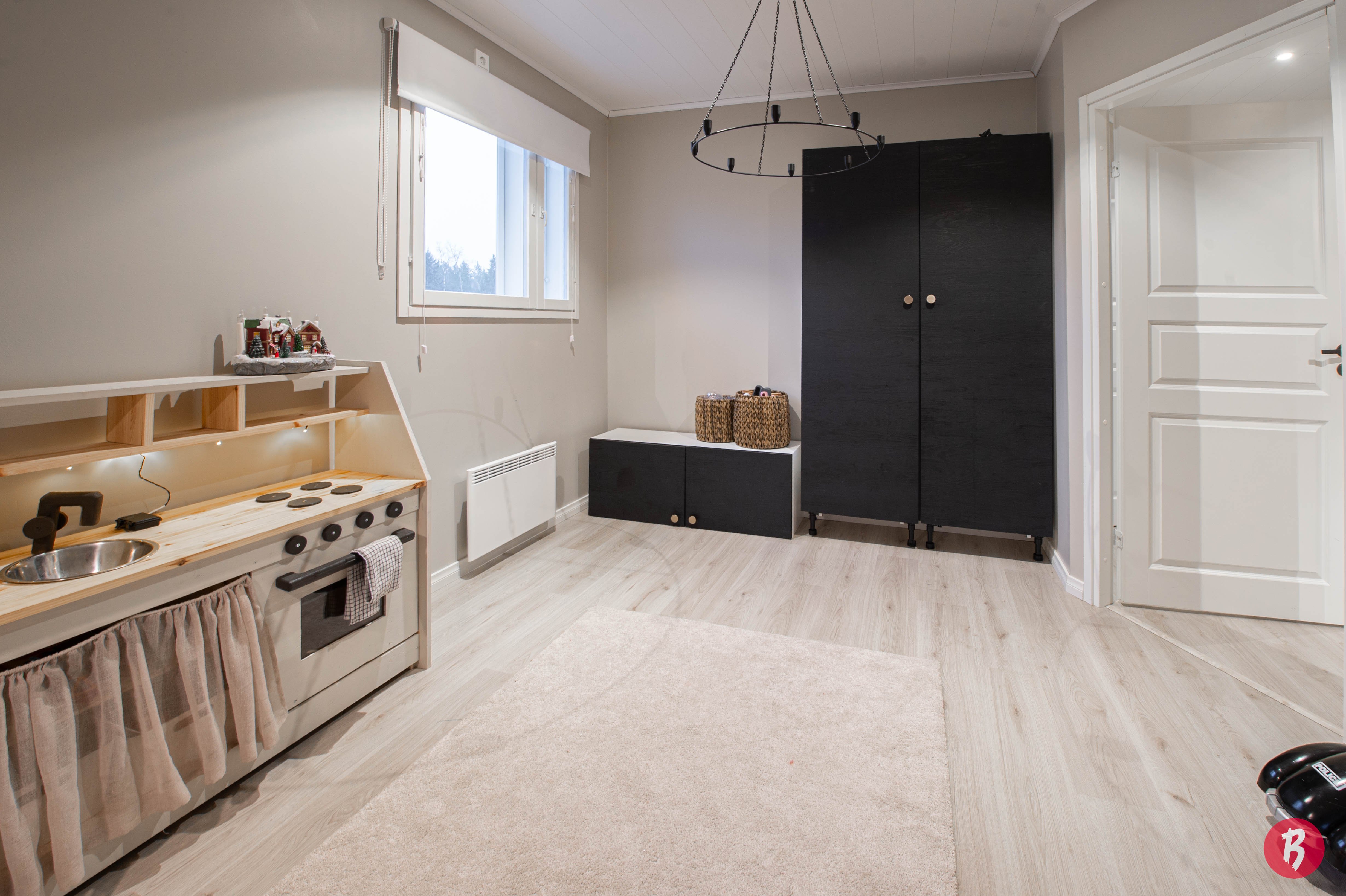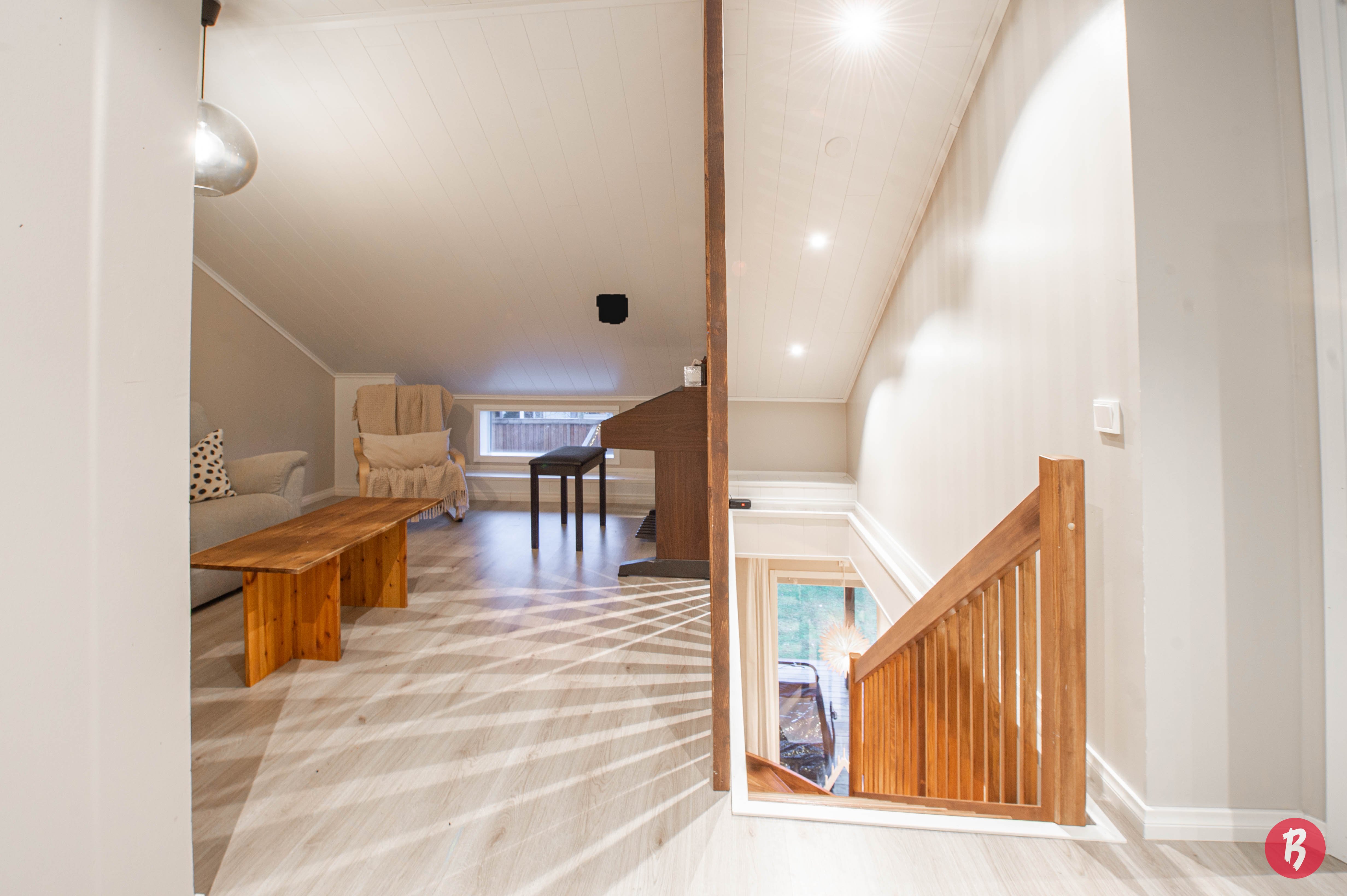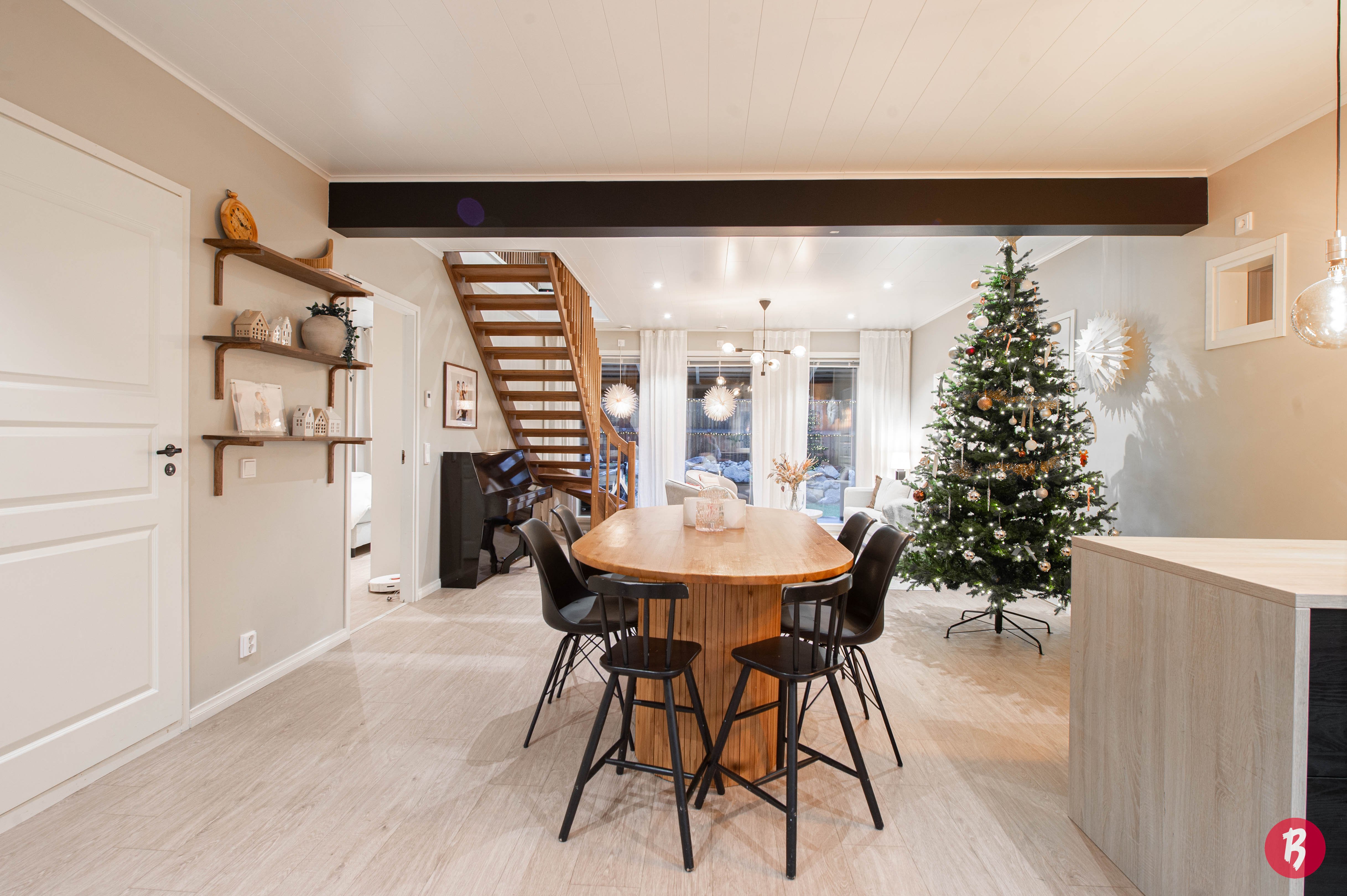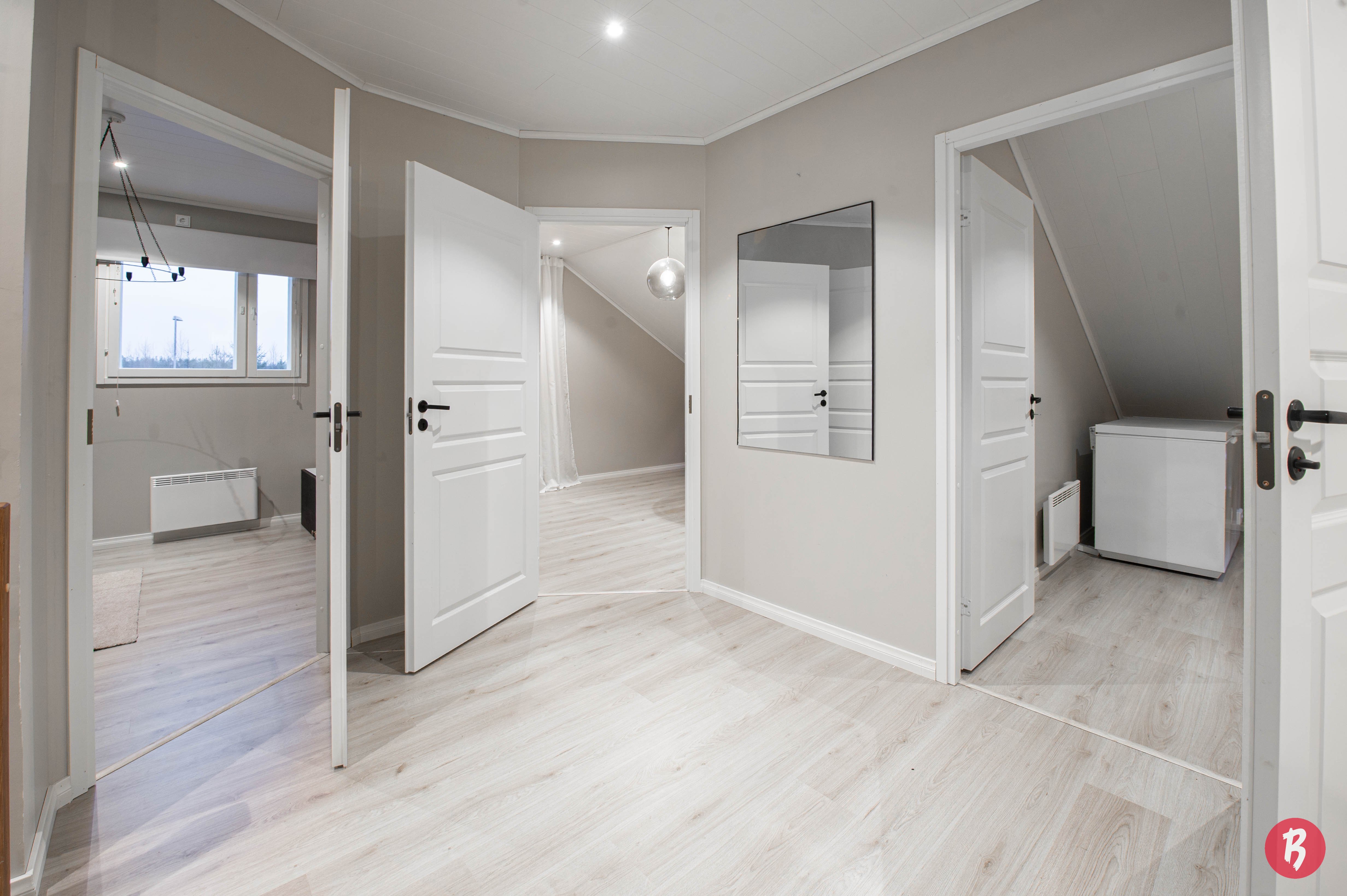 På nedre våningen öppnar sig ett ljust vardagsrum som smälter samman med det moderna köket. Köket är modernt utrustat och försett med induktionsspis och diskmaskin, vilket gör vardagen smidig. Fyra sovrum ger gott om utrymme för familjeliv eller exempelvis ett hemmakontor.