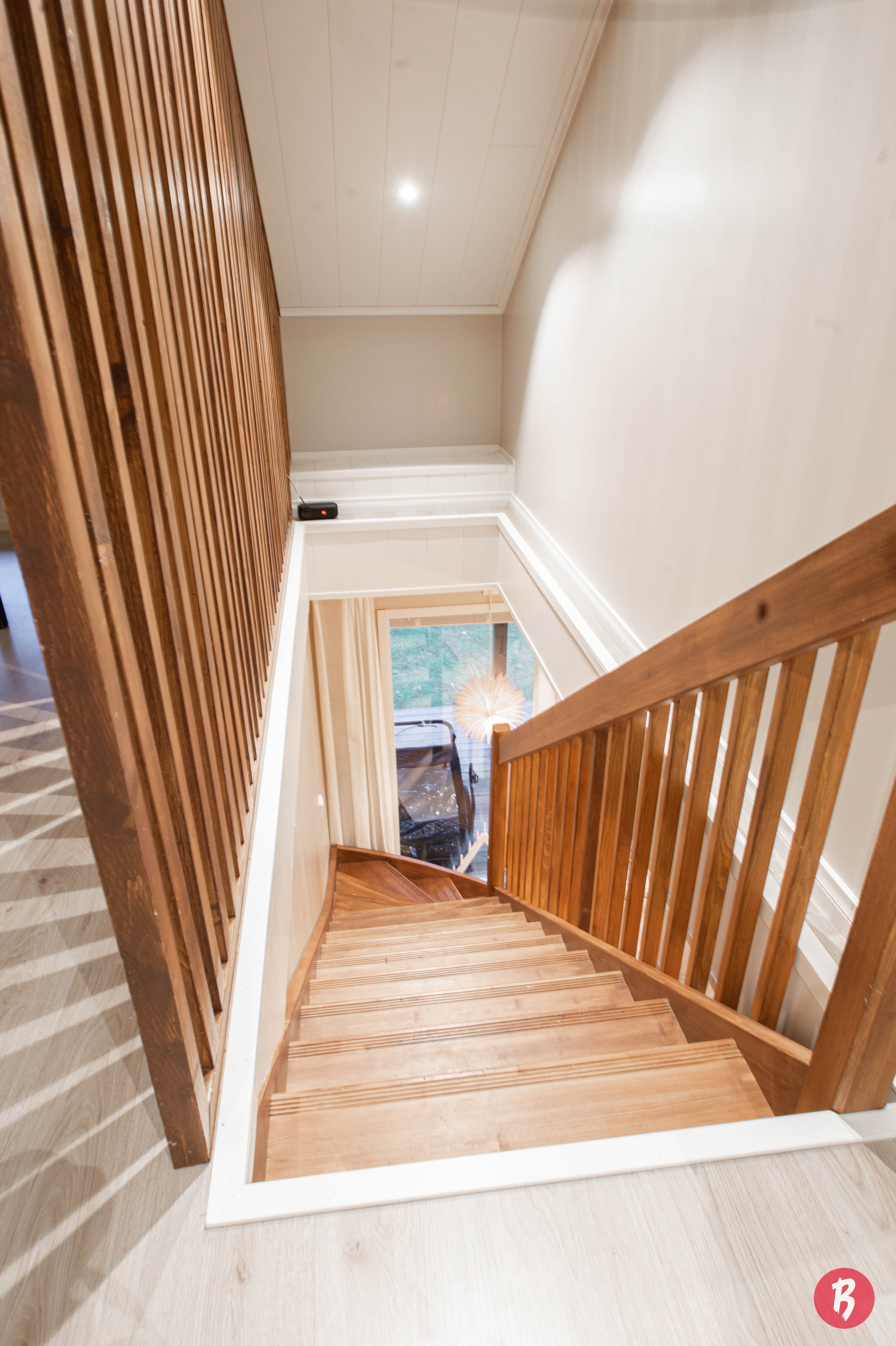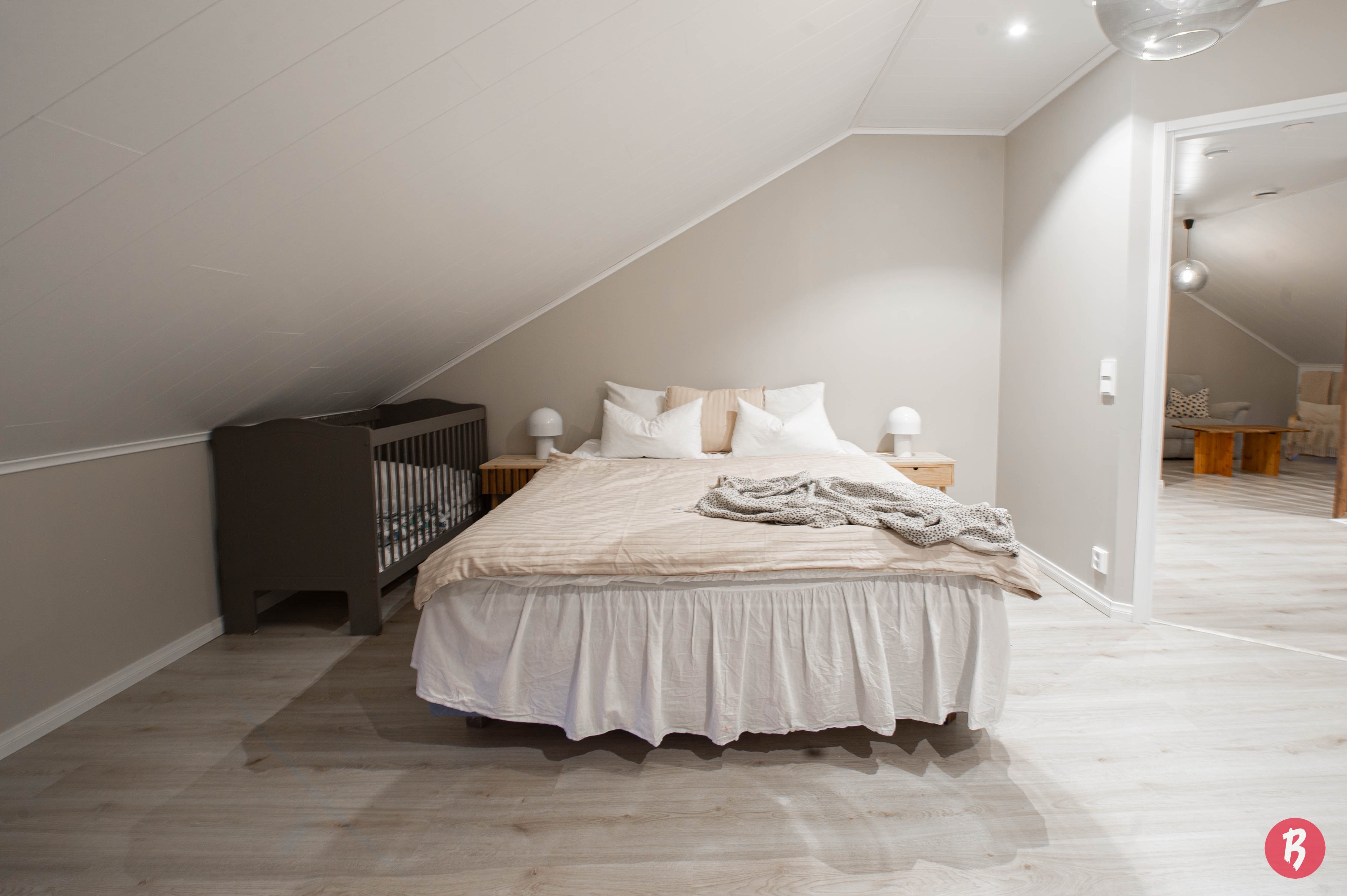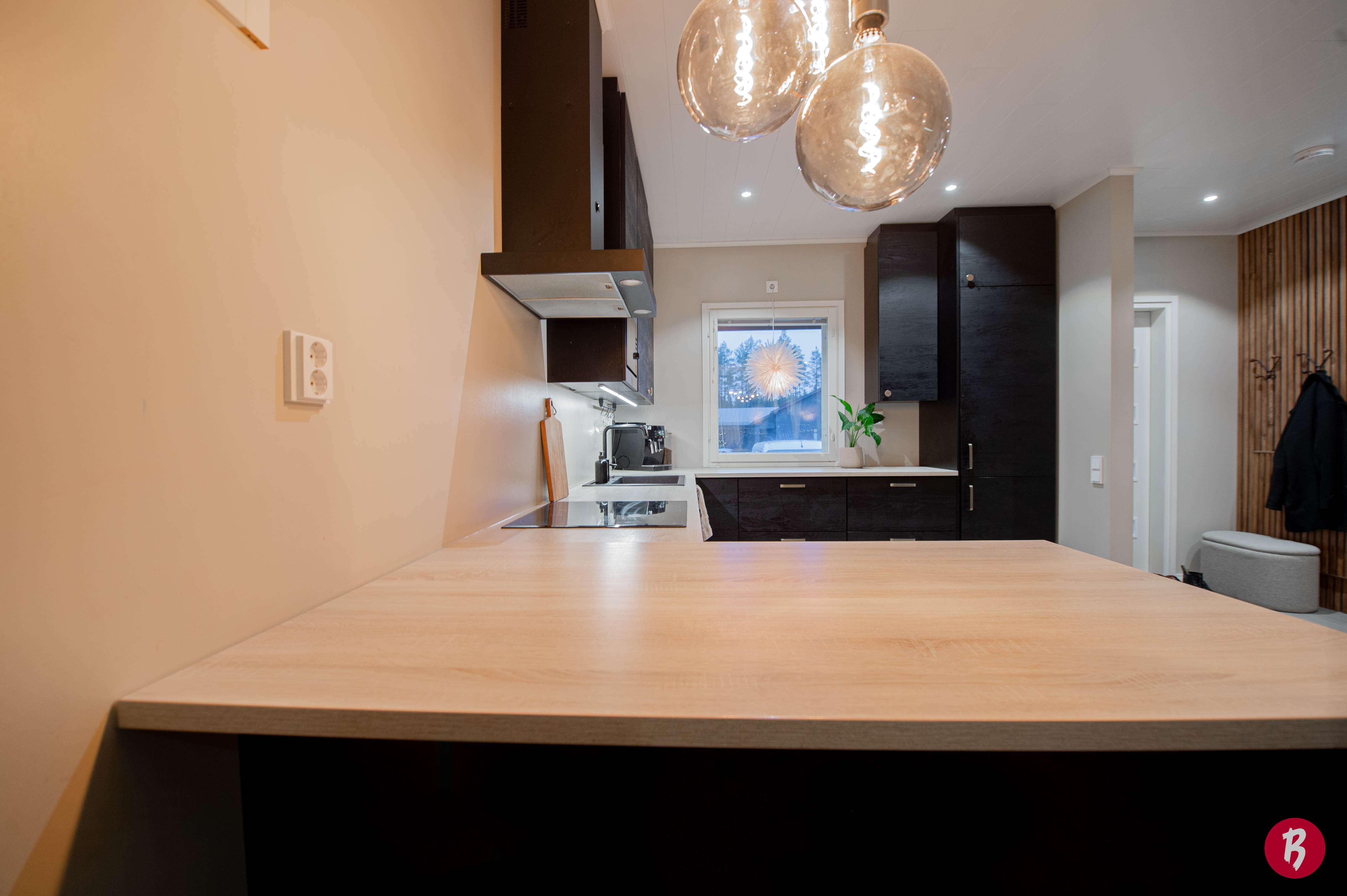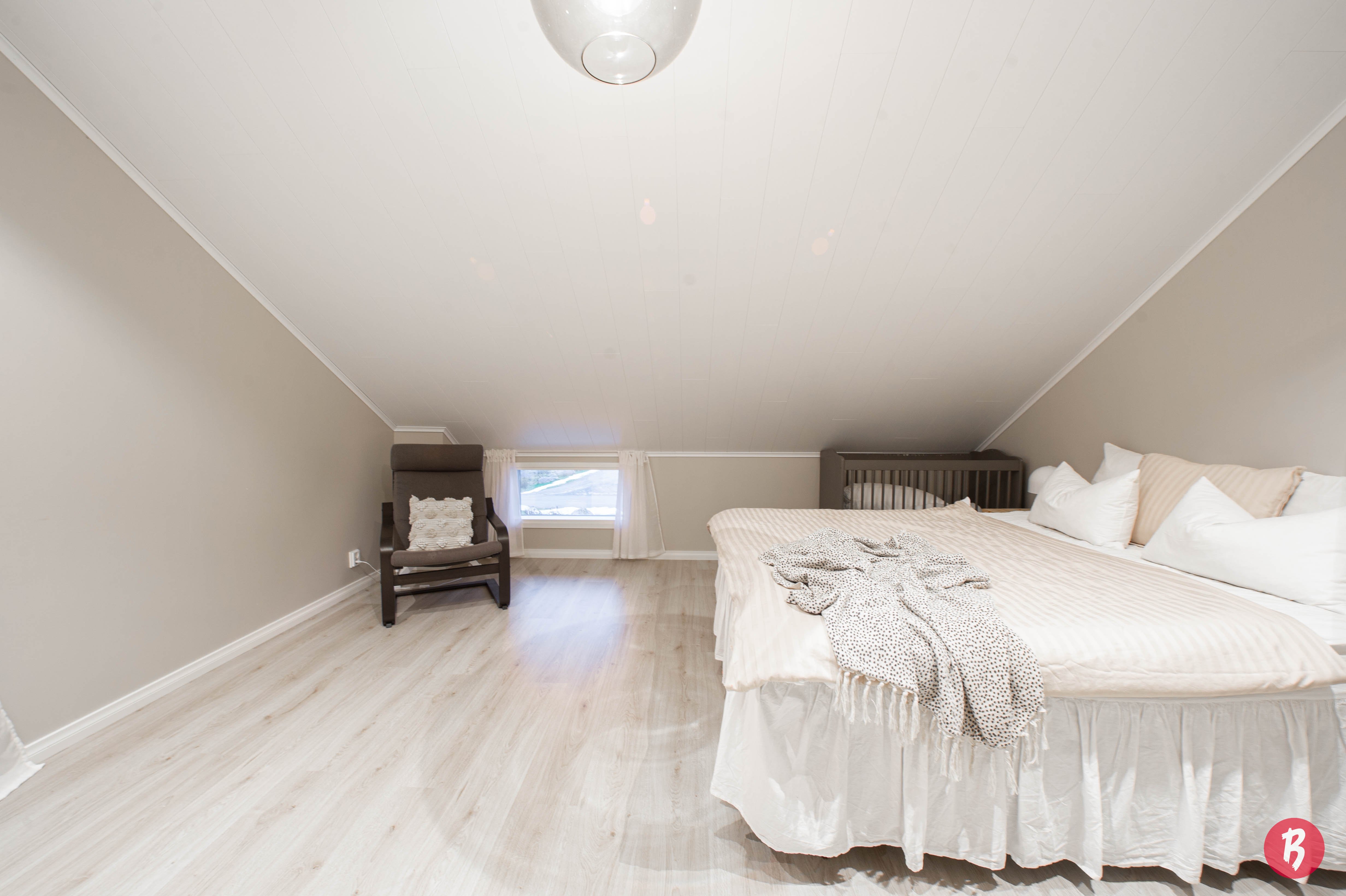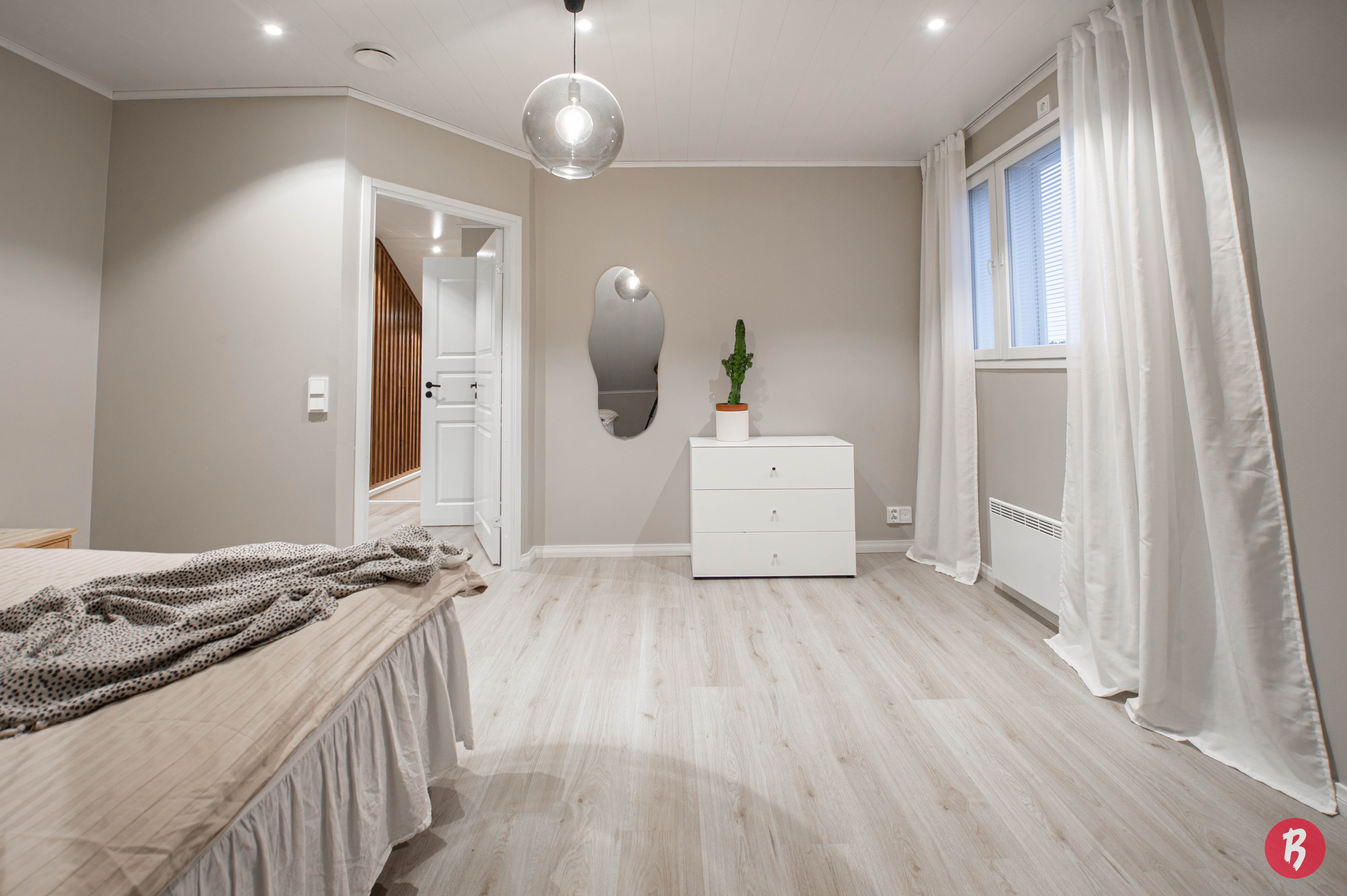 På nedre våningen öppnar sig ett ljust vardagsrum som smälter samman med det moderna köket. Köket är modernt utrustat och försett med induktionsspis och diskmaskin, vilket gör vardagen smidig. Fyra sovrum ger gott om utrymme för familjeliv eller exempelvis ett hemmakontor.
