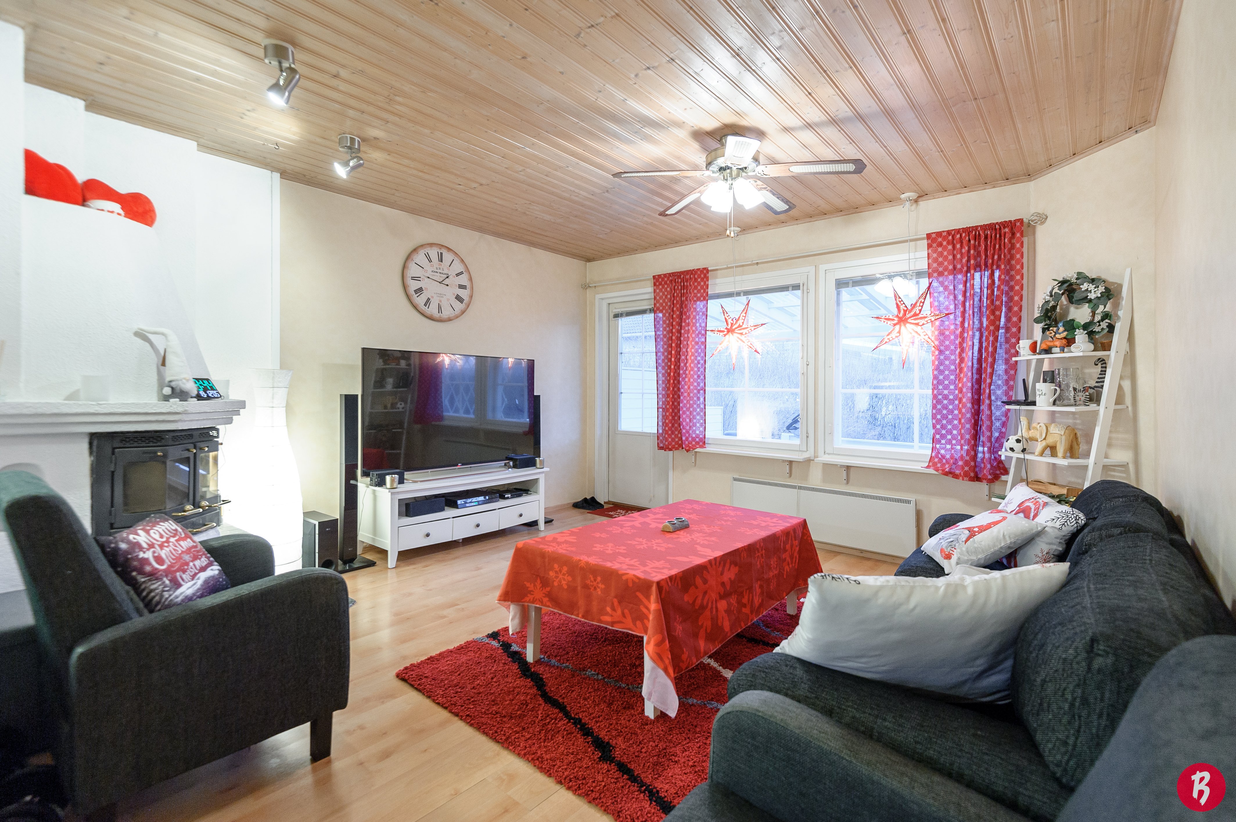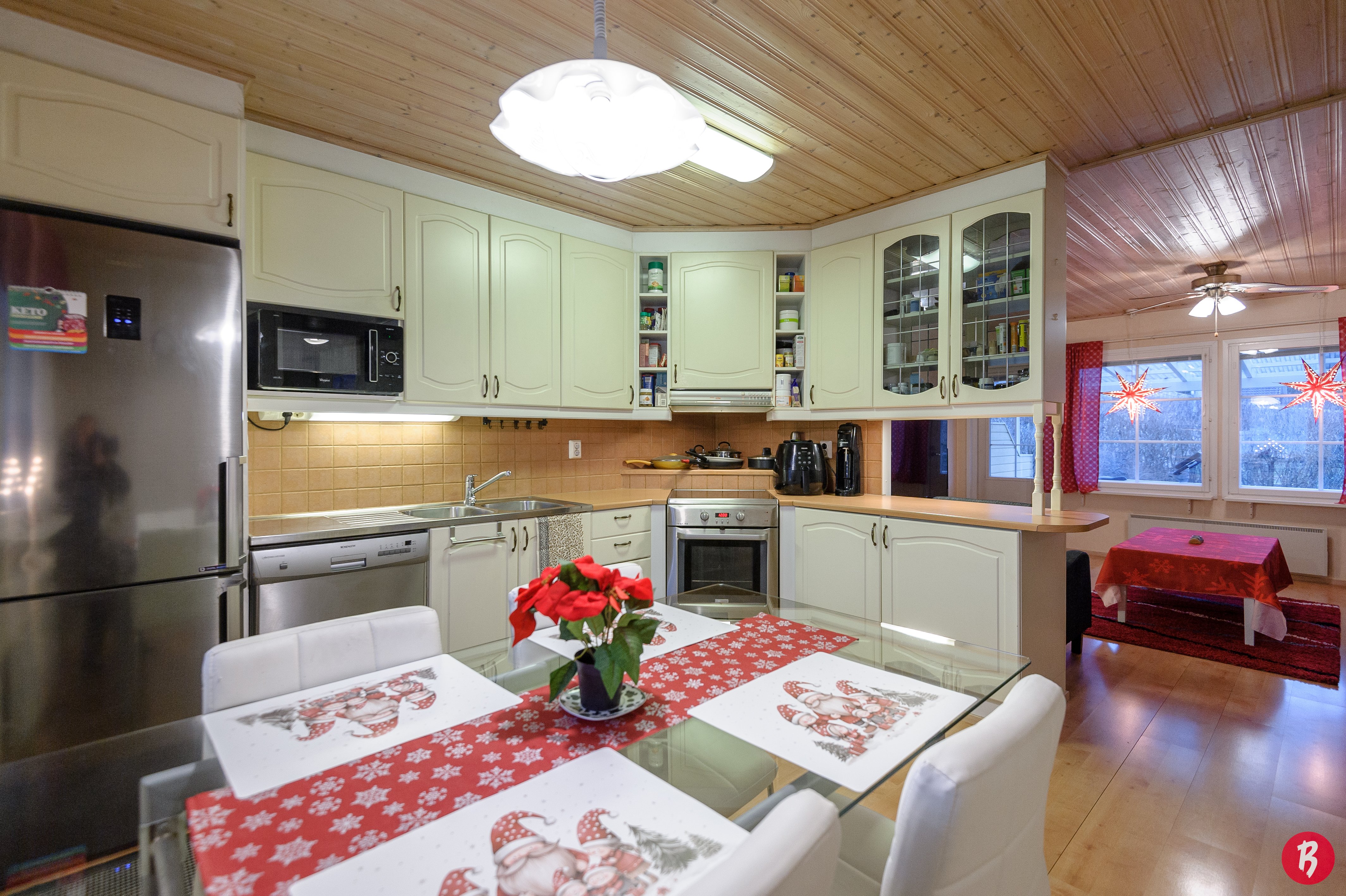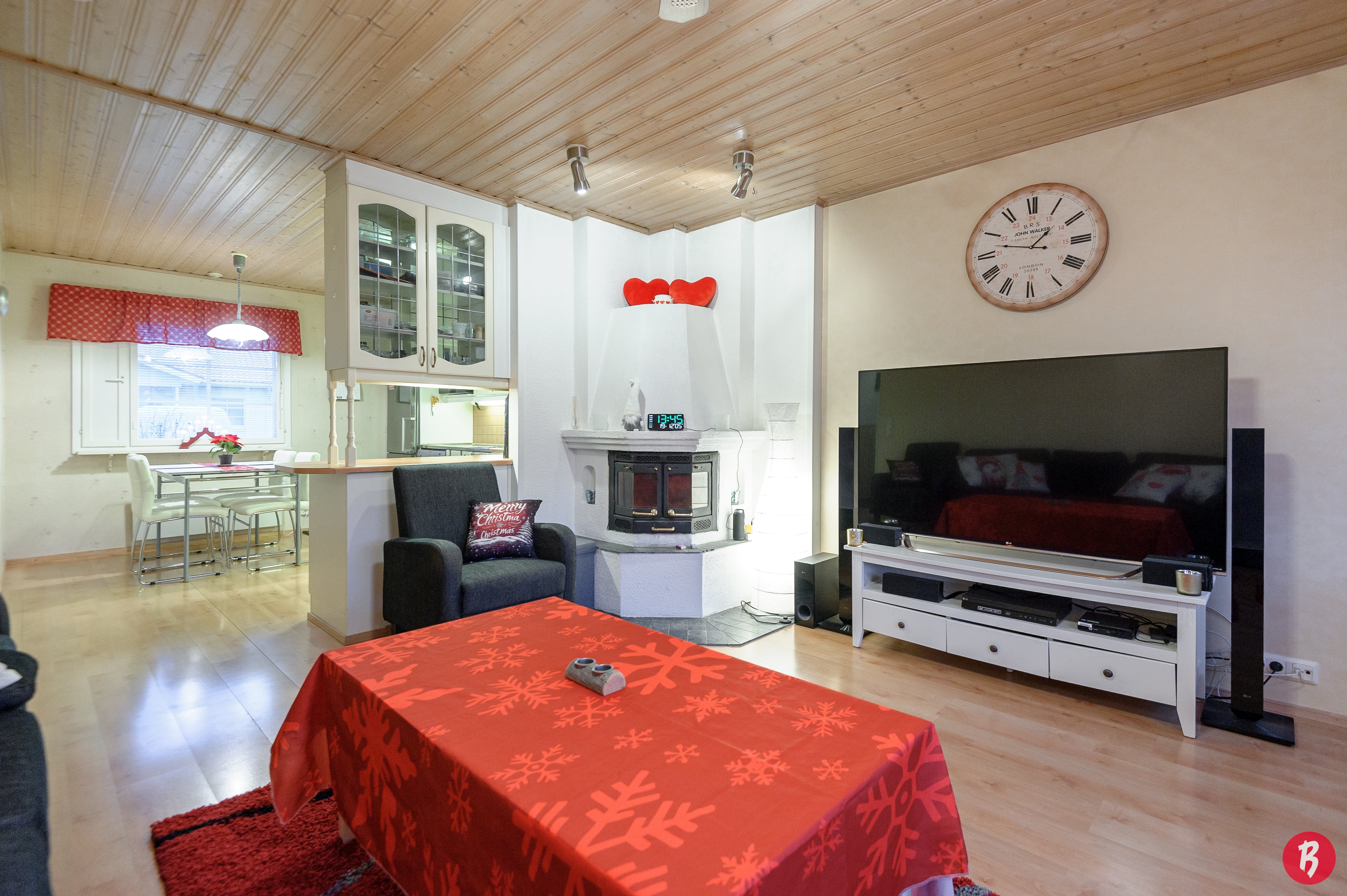 Bostaden, som färdigställdes 1999, har två sovrum, ett rymligt vardagsrum och ett praktiskt kök med moderna hushållsmaskiner. Golvvärmen i badrummet ger extra komfort, och den egna bastun bjuder på avkopplande stunder. Hjälpköket har egen utgång, vilket underlättar vardagen.