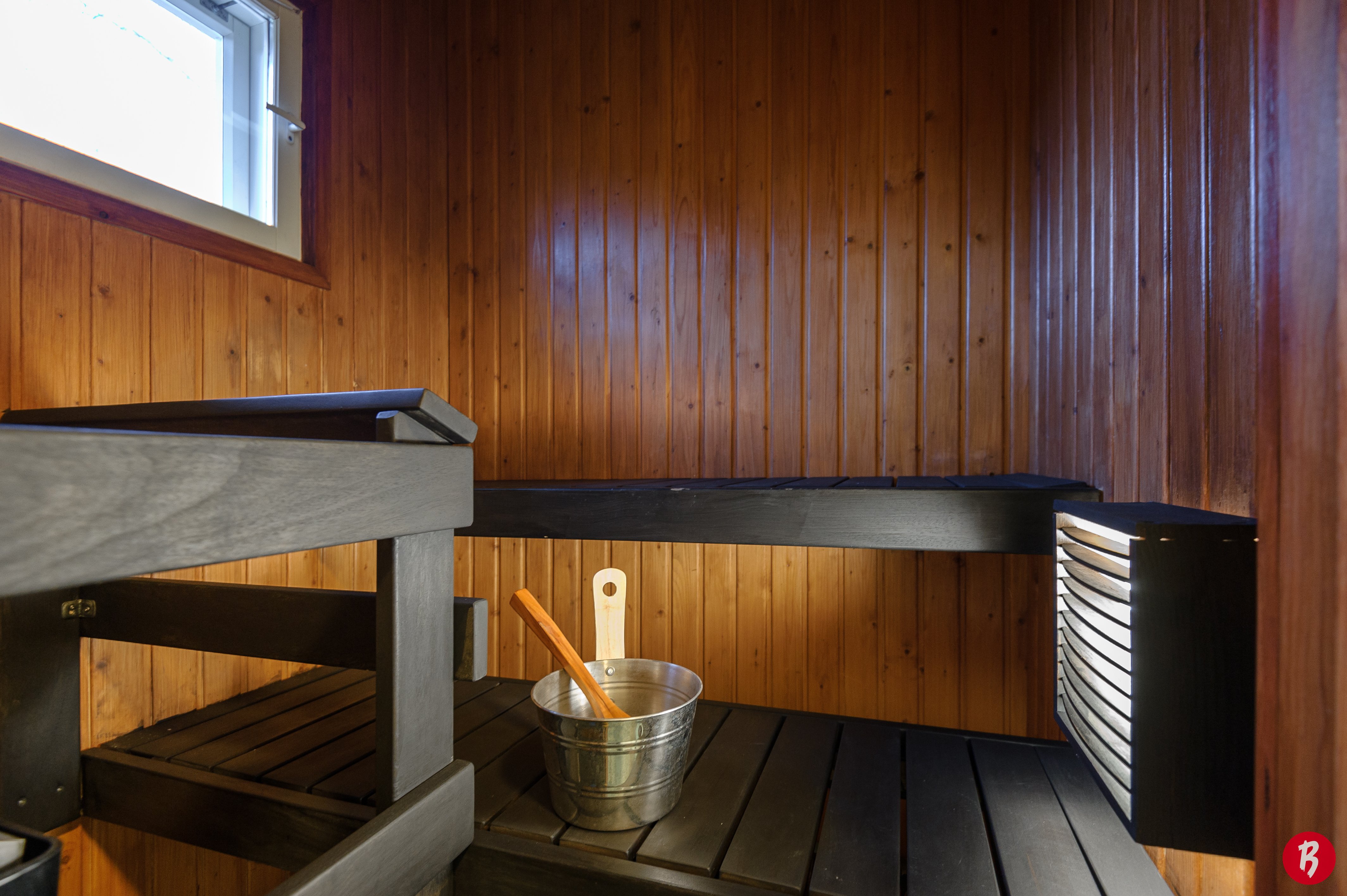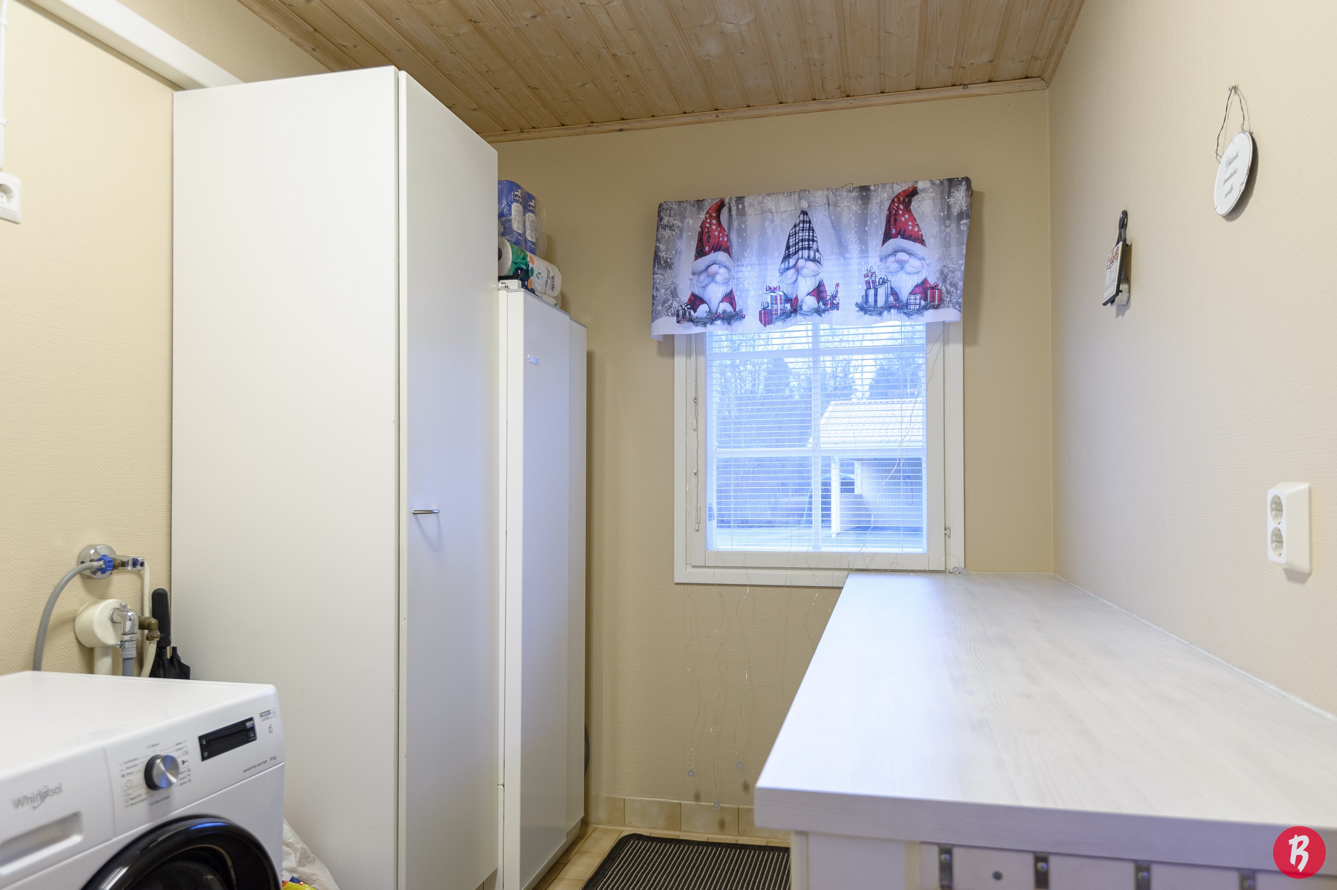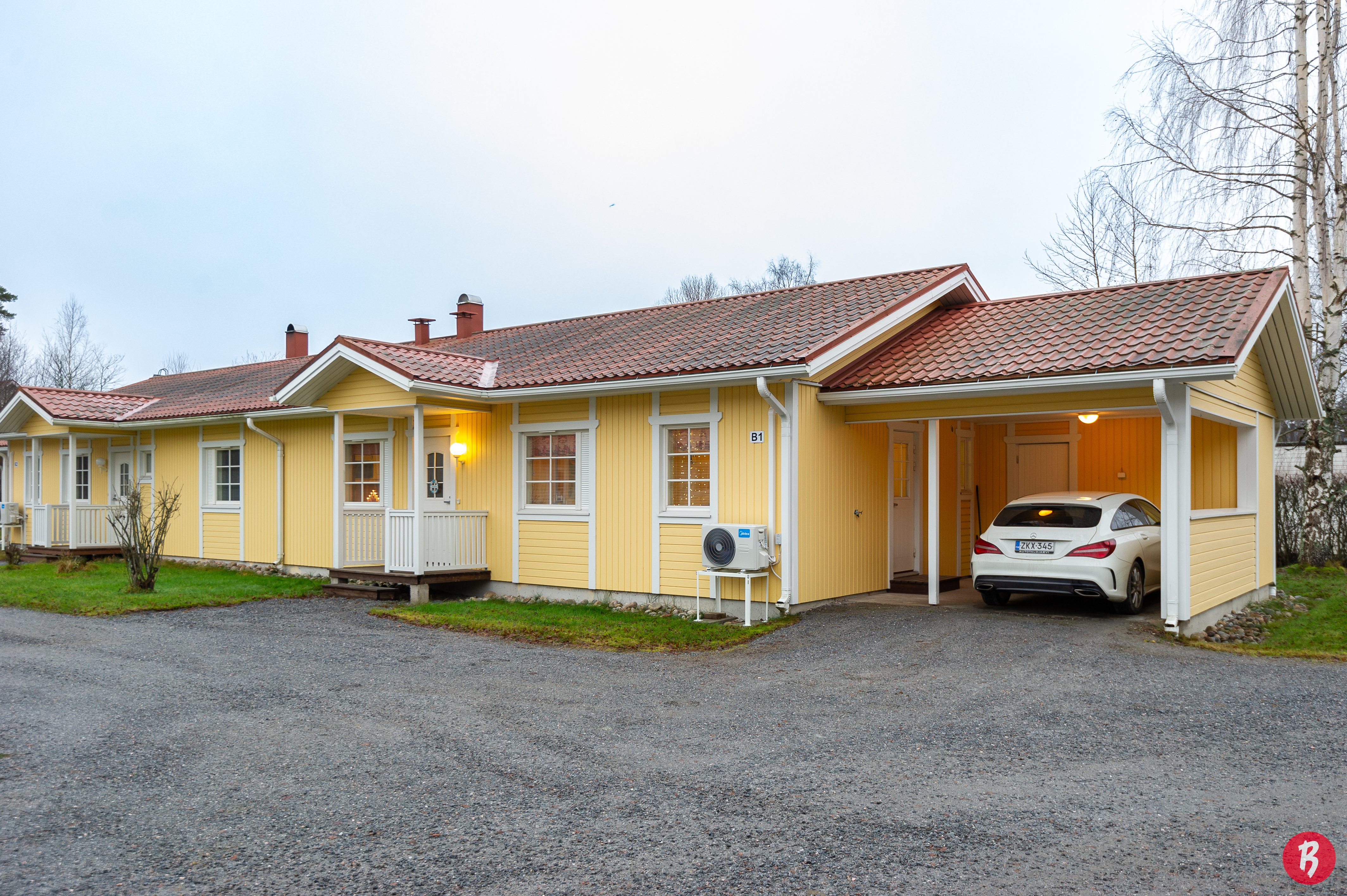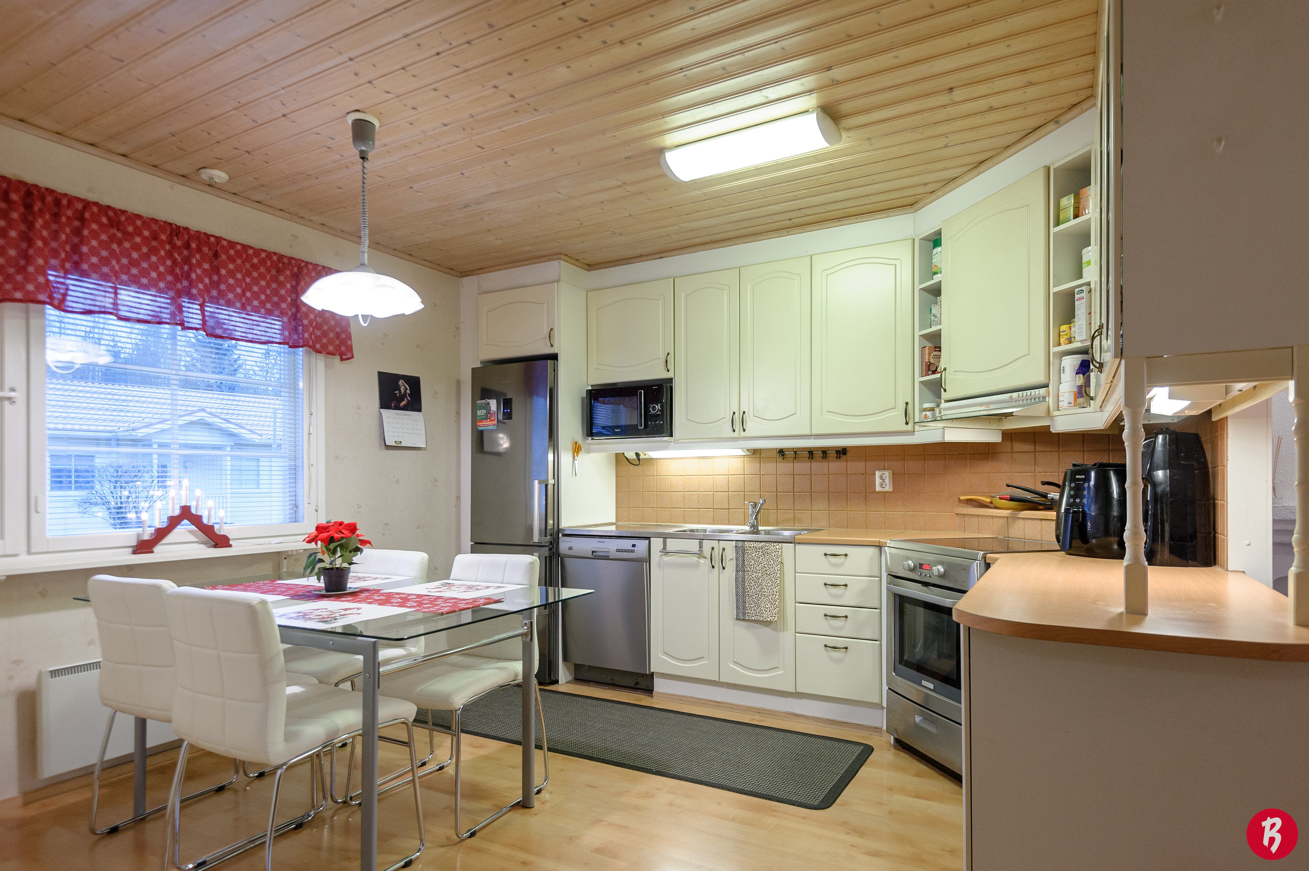 Bostaden, som färdigställdes 1999, har två sovrum, ett rymligt vardagsrum och ett praktiskt kök med moderna hushållsmaskiner. Golvvärmen i badrummet ger extra komfort, och den egna bastun bjuder på avkopplande stunder. Hjälpköket har egen utgång, vilket underlättar vardagen.