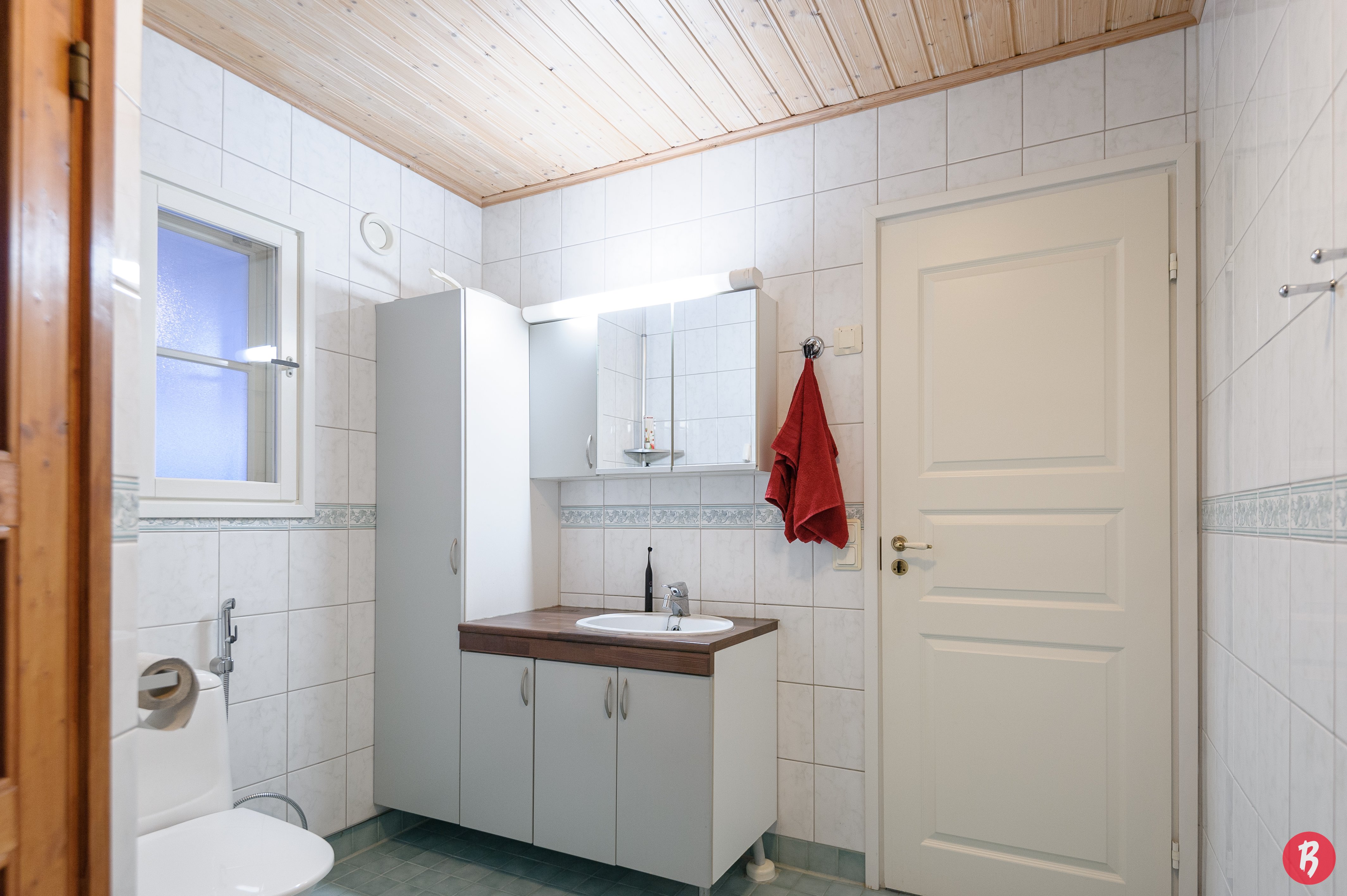 Lattialämmitys, wc-istuin, suihku, pesuallas, allaskaappi ja peilikaappi