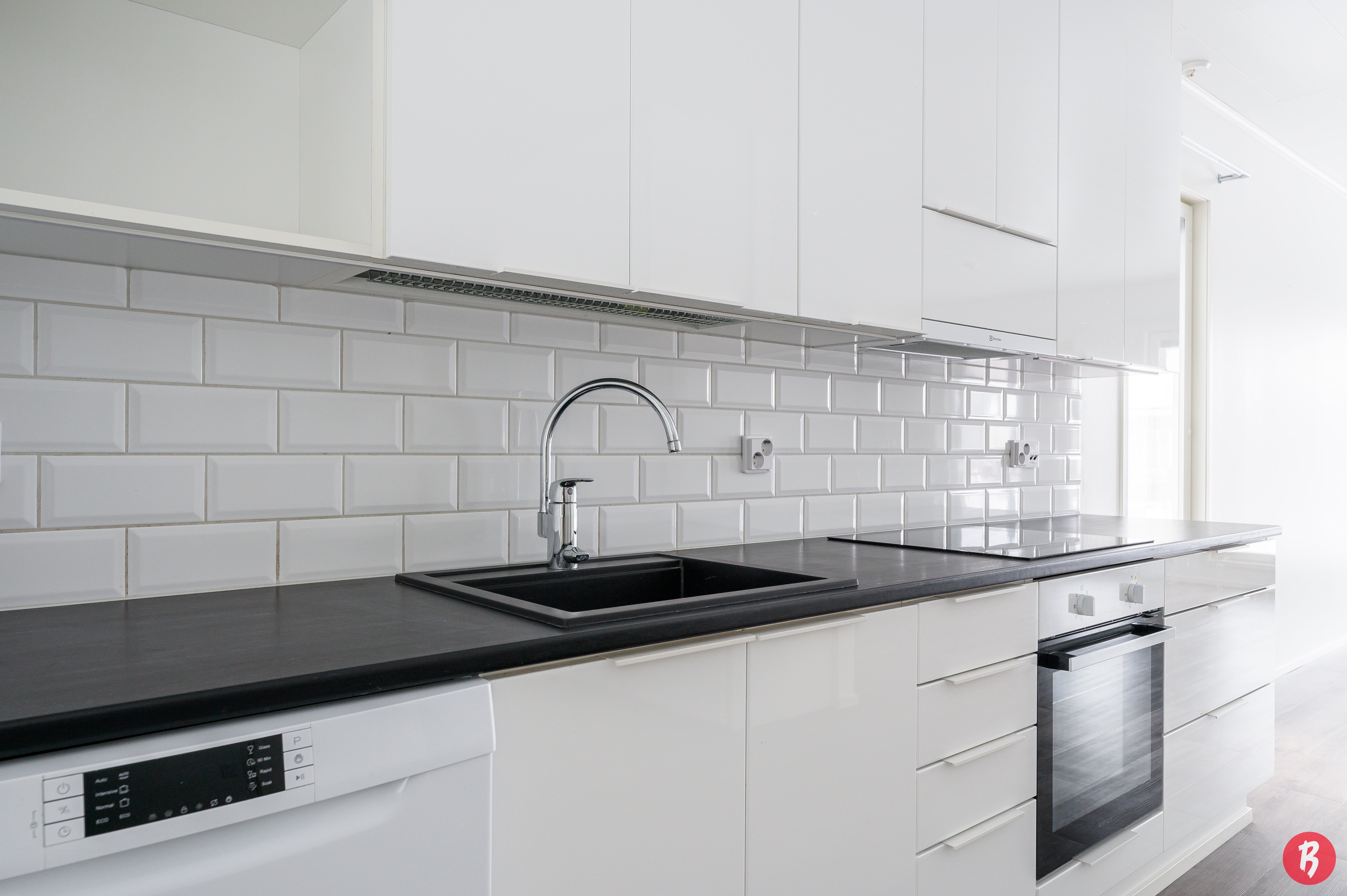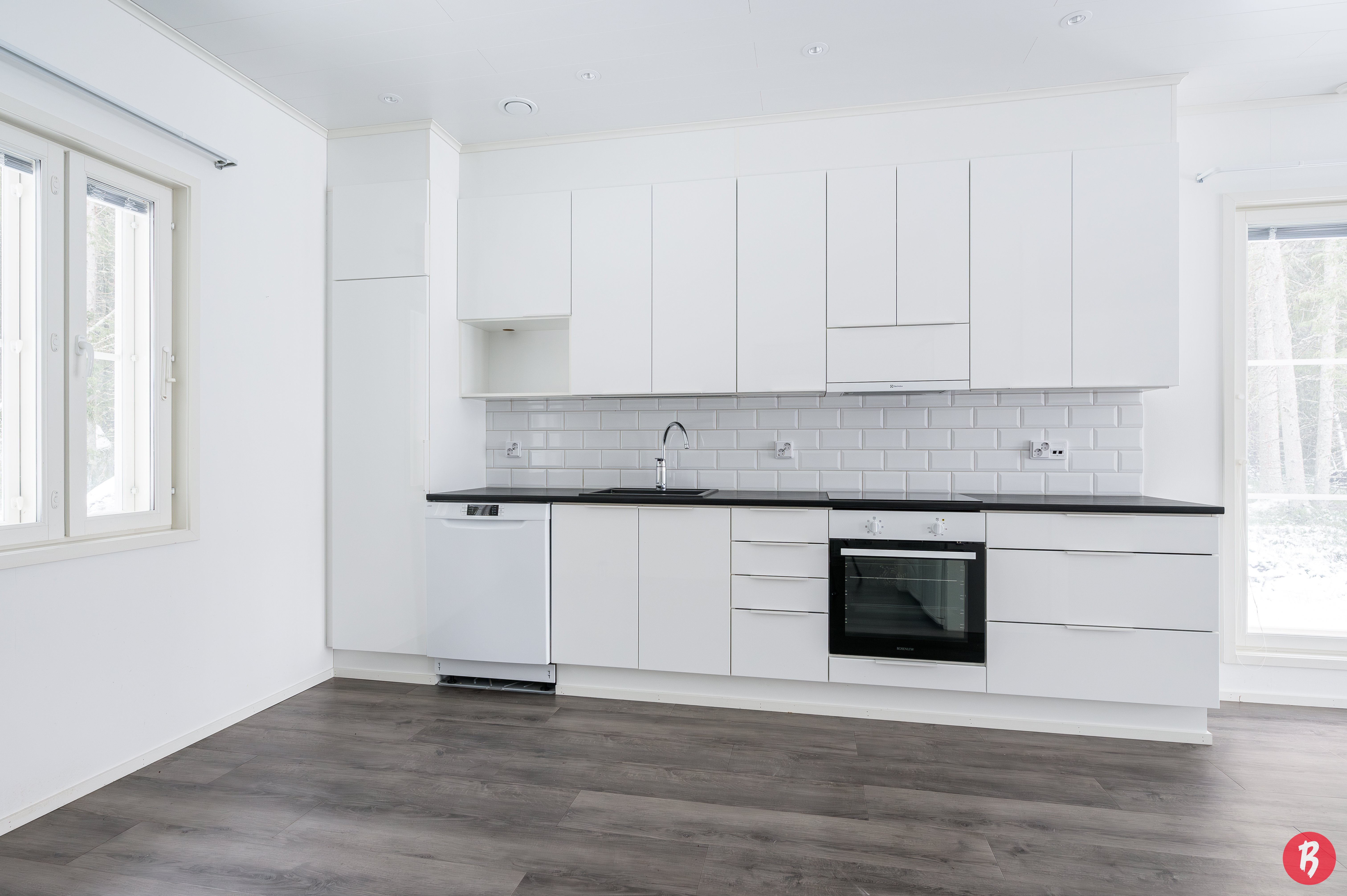 Jääkaappi (kylskåp), erillinen pakastin (frys), uuni (ugn), liesi (spis), liesituuletin (spisfläkt) ja astianpesukone (diskmaskin)