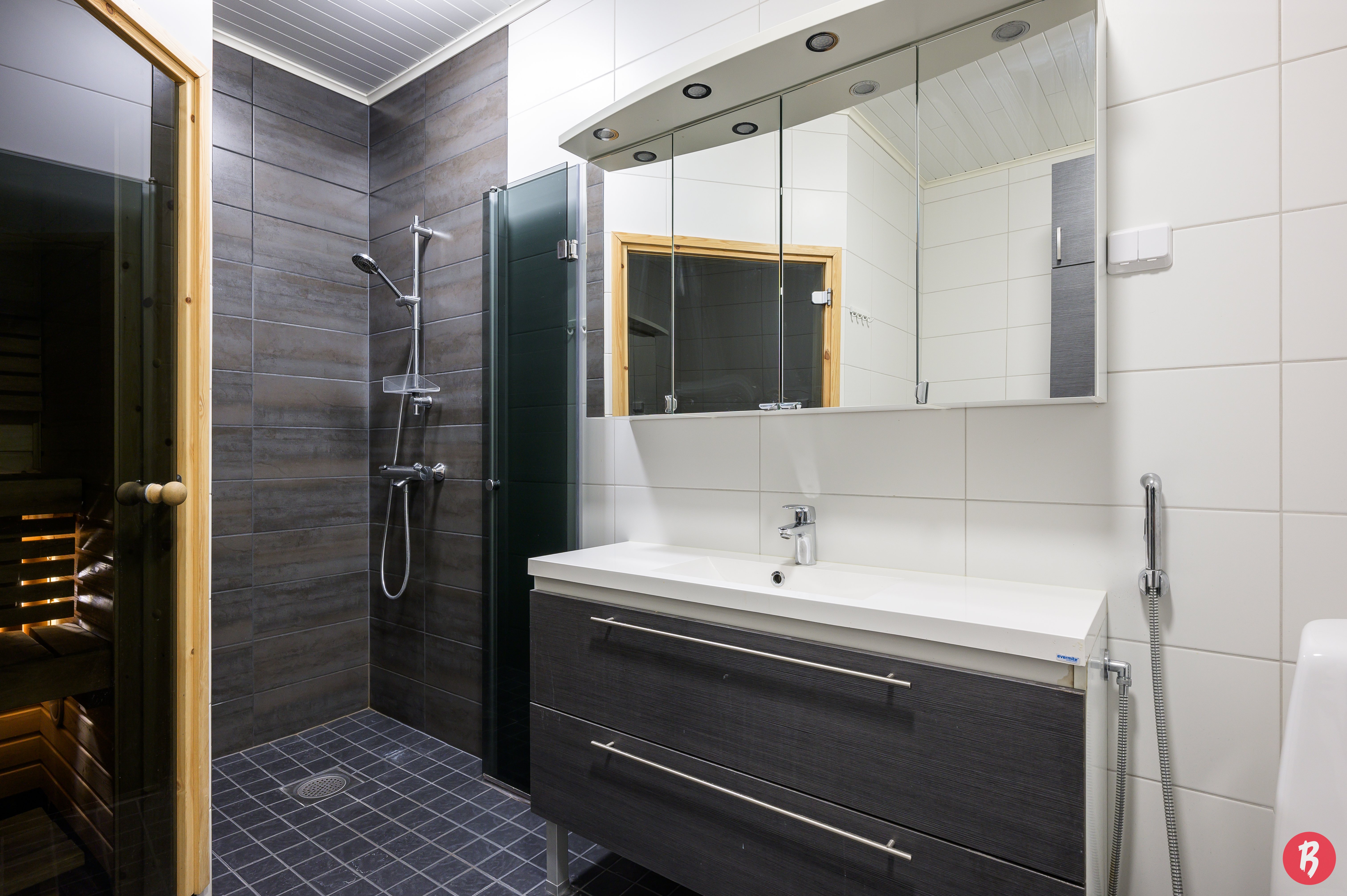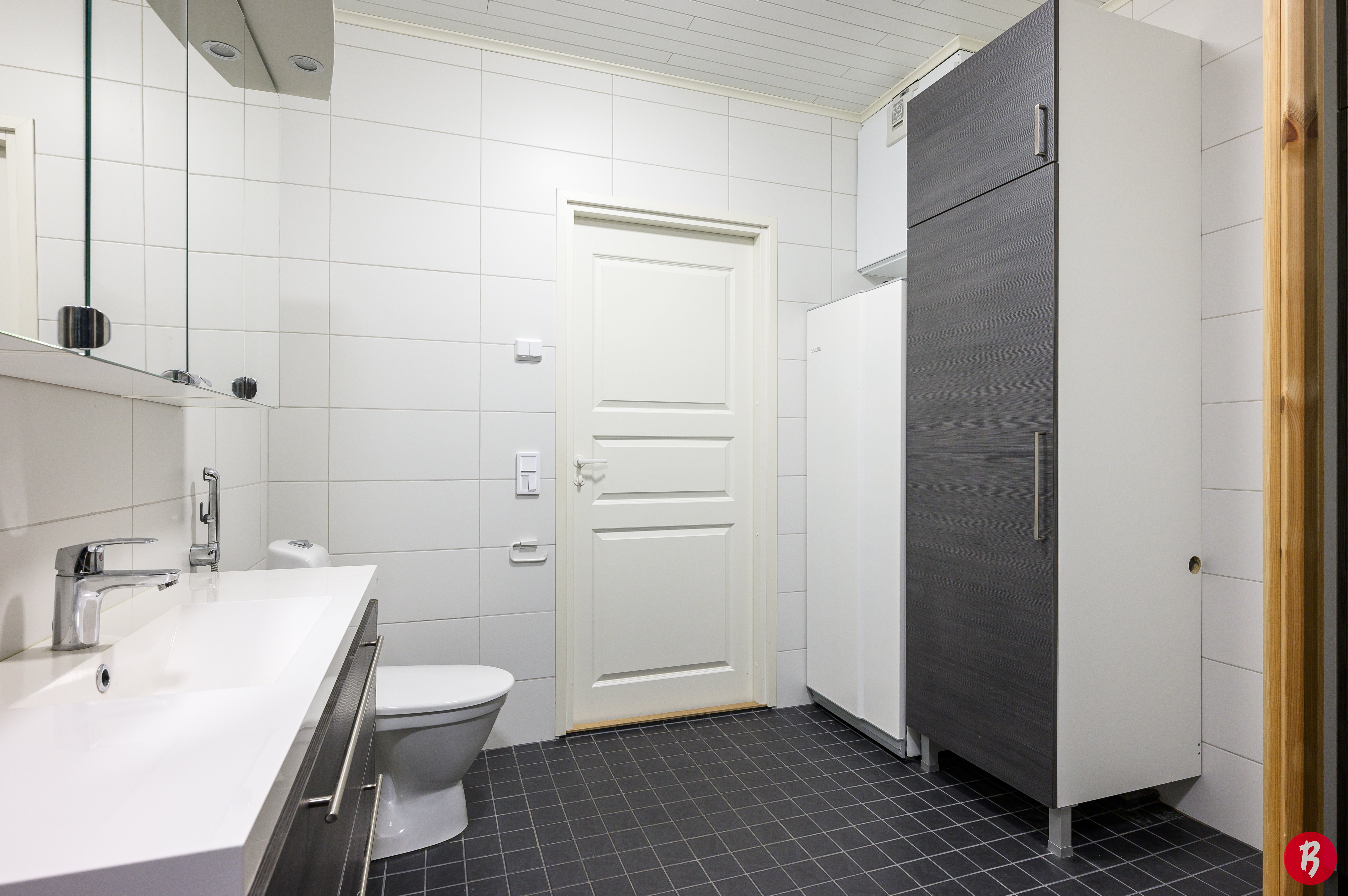 WC-istuin (wc), suihku (dusch), pesukoneliitäntä (tvättmaskinsanslutning) ja pesuallas (handfat)