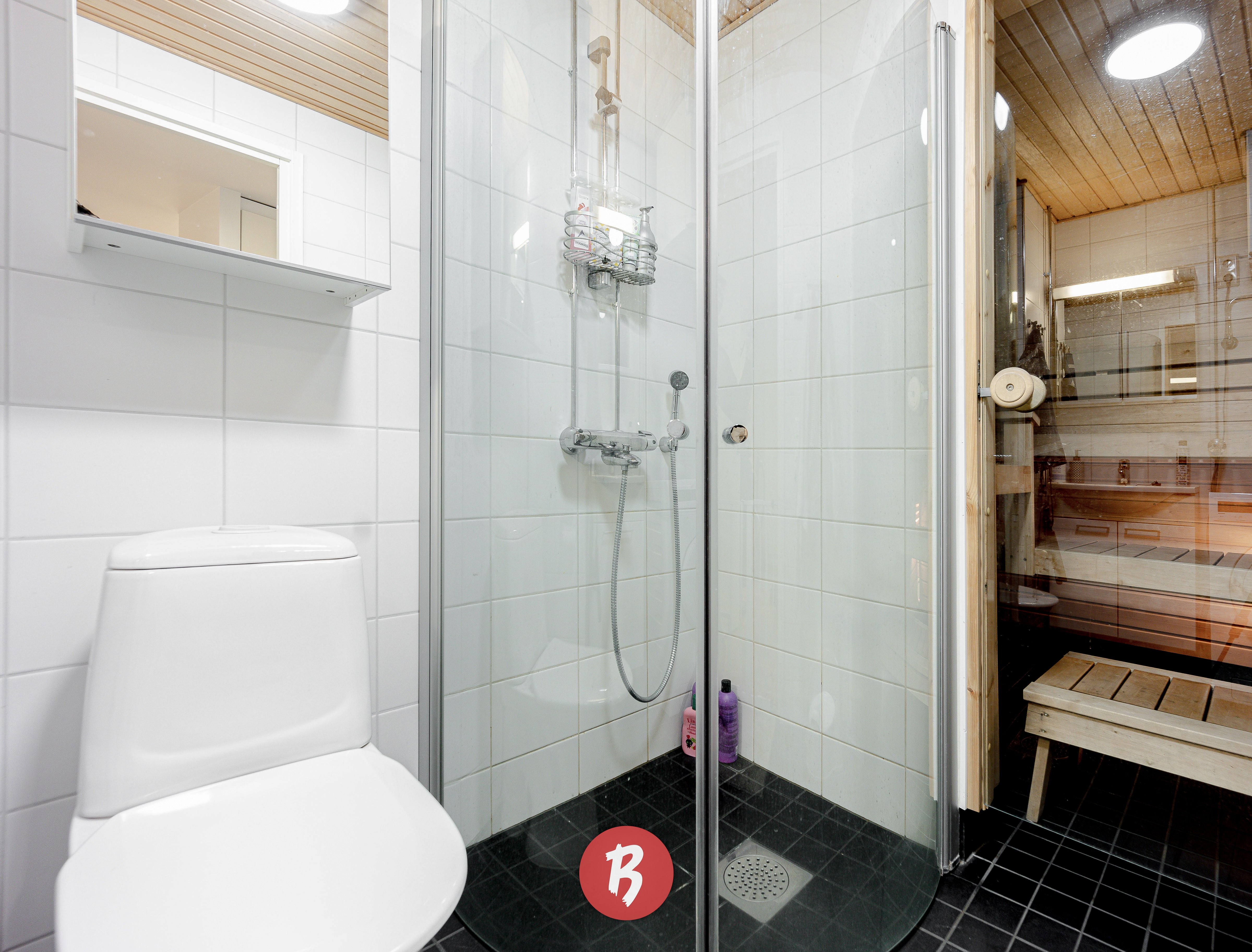 Allaskaappi, pesuallas, lattialämmitys, suihkuseinä, pesukoneliitäntä, wc-istuin ja suihku
