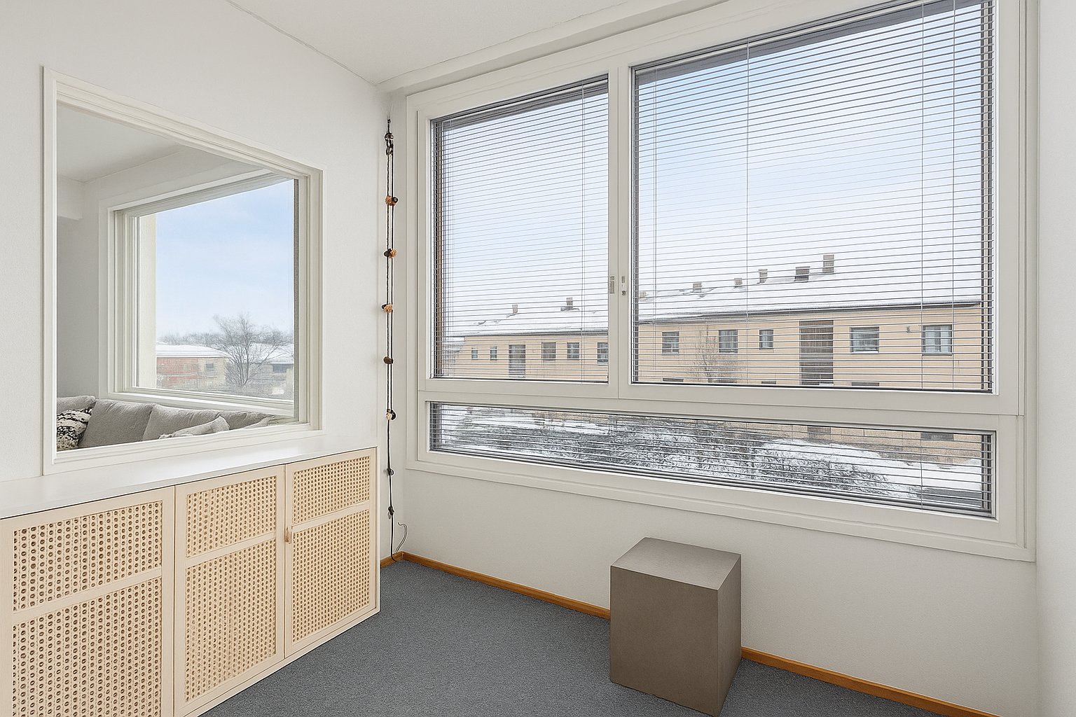 Ljus och välplanerad bostad med det speciella inslaget av en inglasad balkong som ger extra utrymme året runt. Välskött husbolag med hiss, på egen tomt.