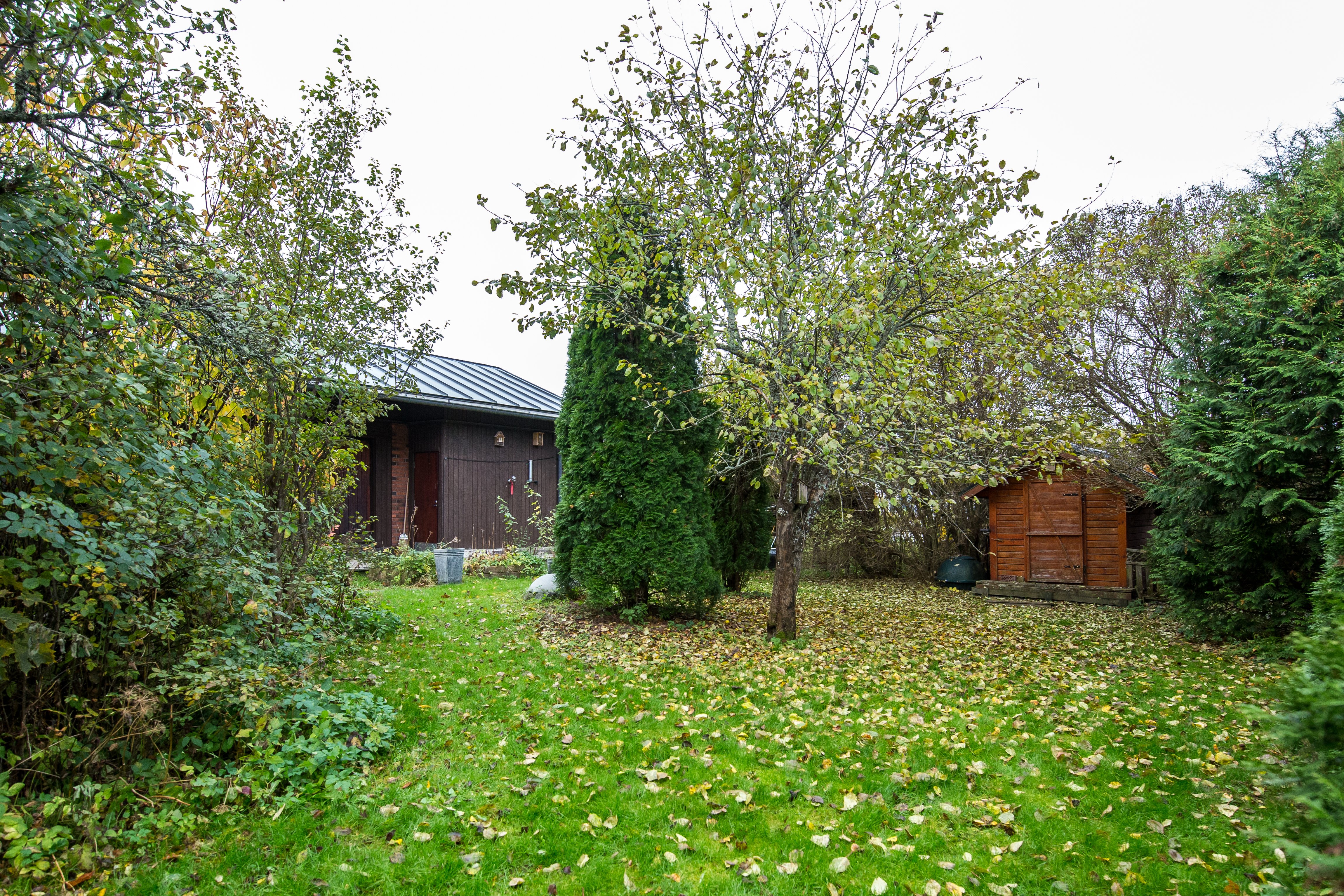 Tomten är skyddad och erbjuder gott om utrymme för både barnens lekar, gårdsspel och trädgårdsintressen.