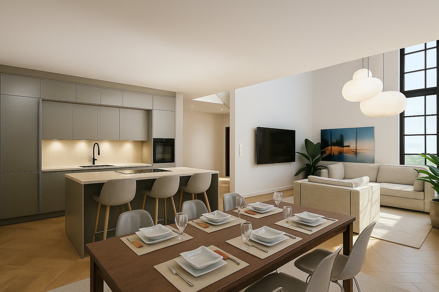 Hjärtat i bostaden är ett rymligt och ljust vardagsrum, vars stora fönster släpper in mängder av naturligt ljus och skapar en koppling till gården. Som en förlängning av vardagsrummet finns en praktiskt matsal, var intill finns det stilrena köket, utrustat med integrerade vitvaror och induktionsspis - en perfekt plats för vardagsmatlagning såväl som för större middagsbjudningar.