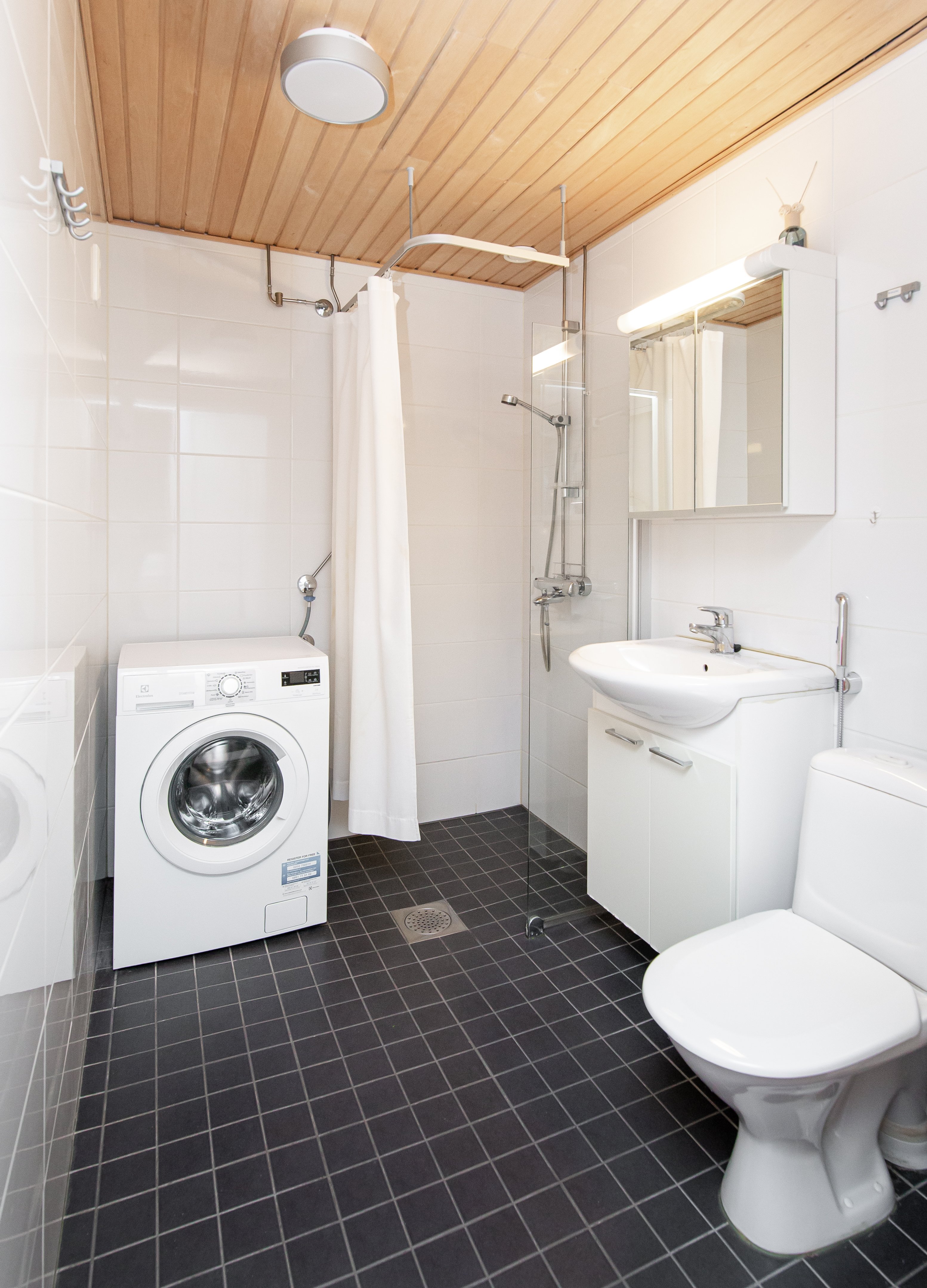 WC-istuin, suihku, pesukoneliitäntä, lattialämmitys, pesuallas, allaskaappi, bidee-suihku ja peilikaappi