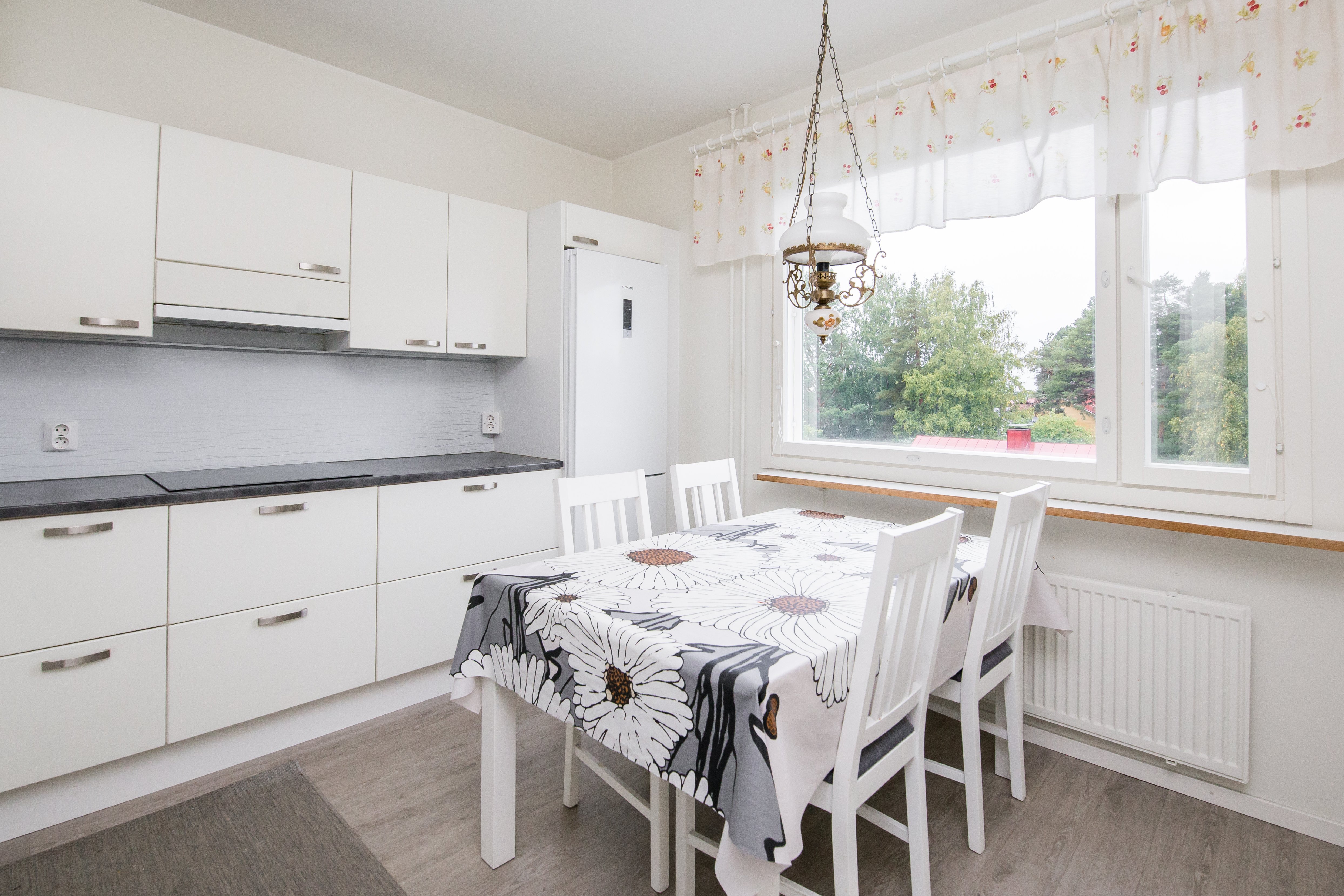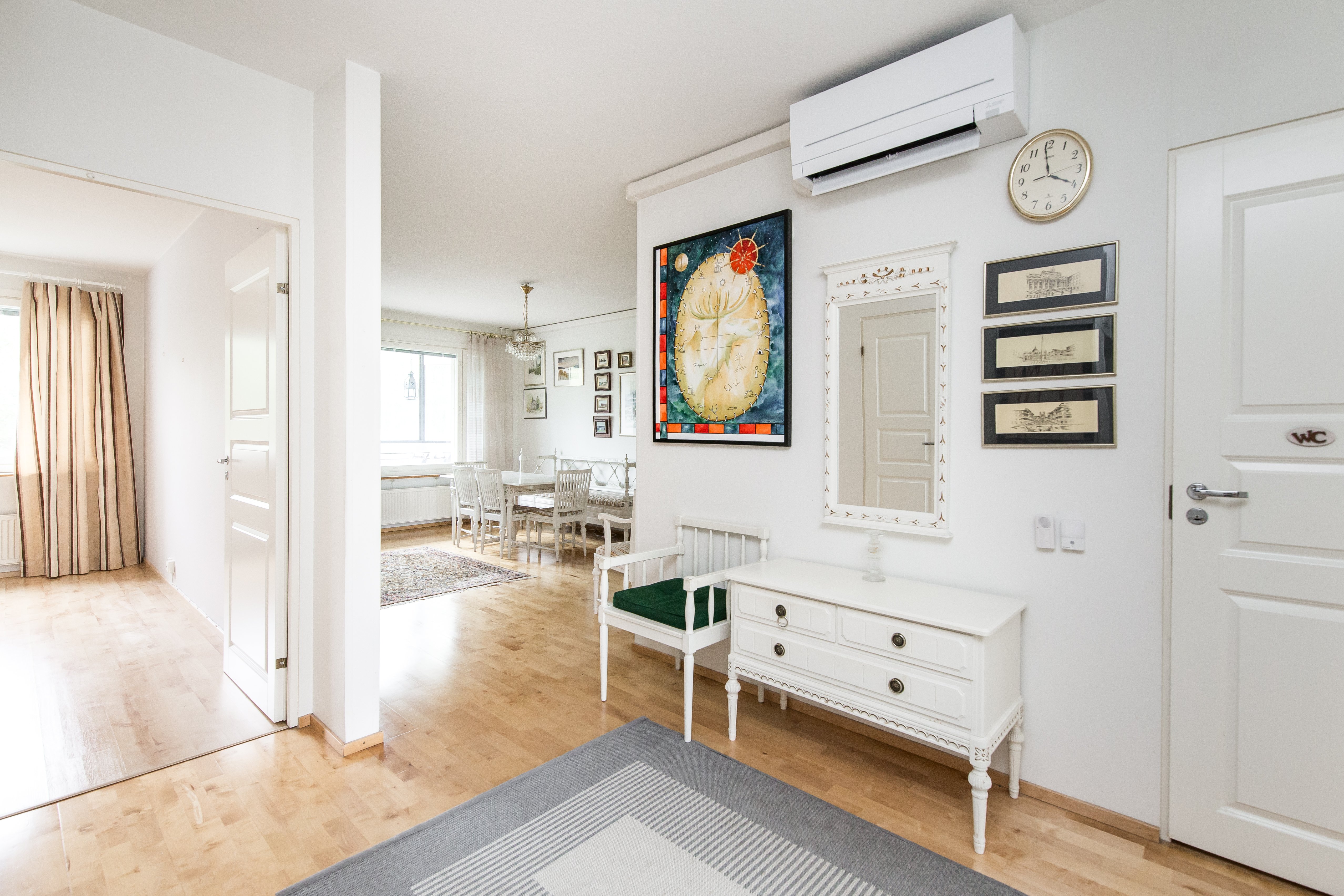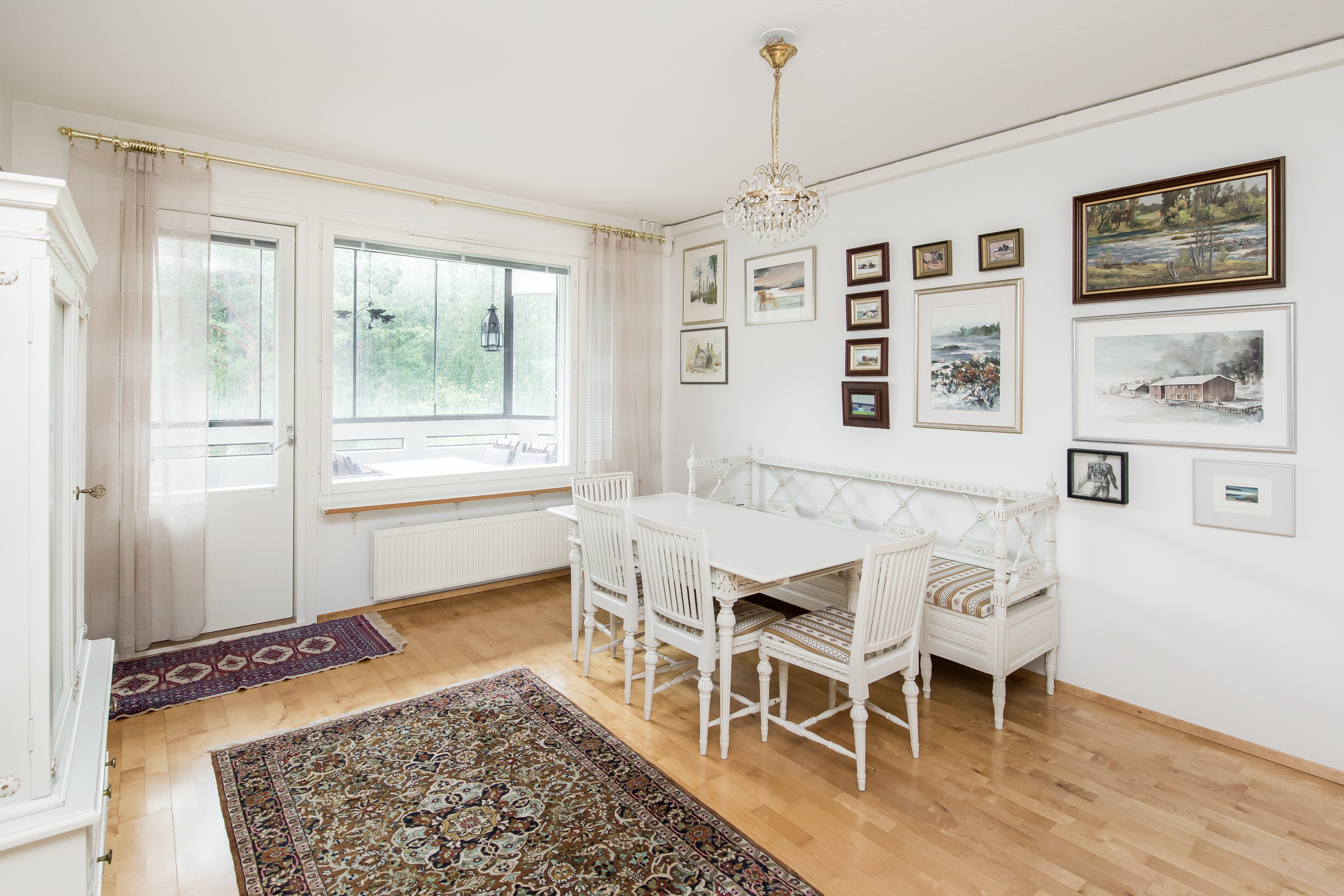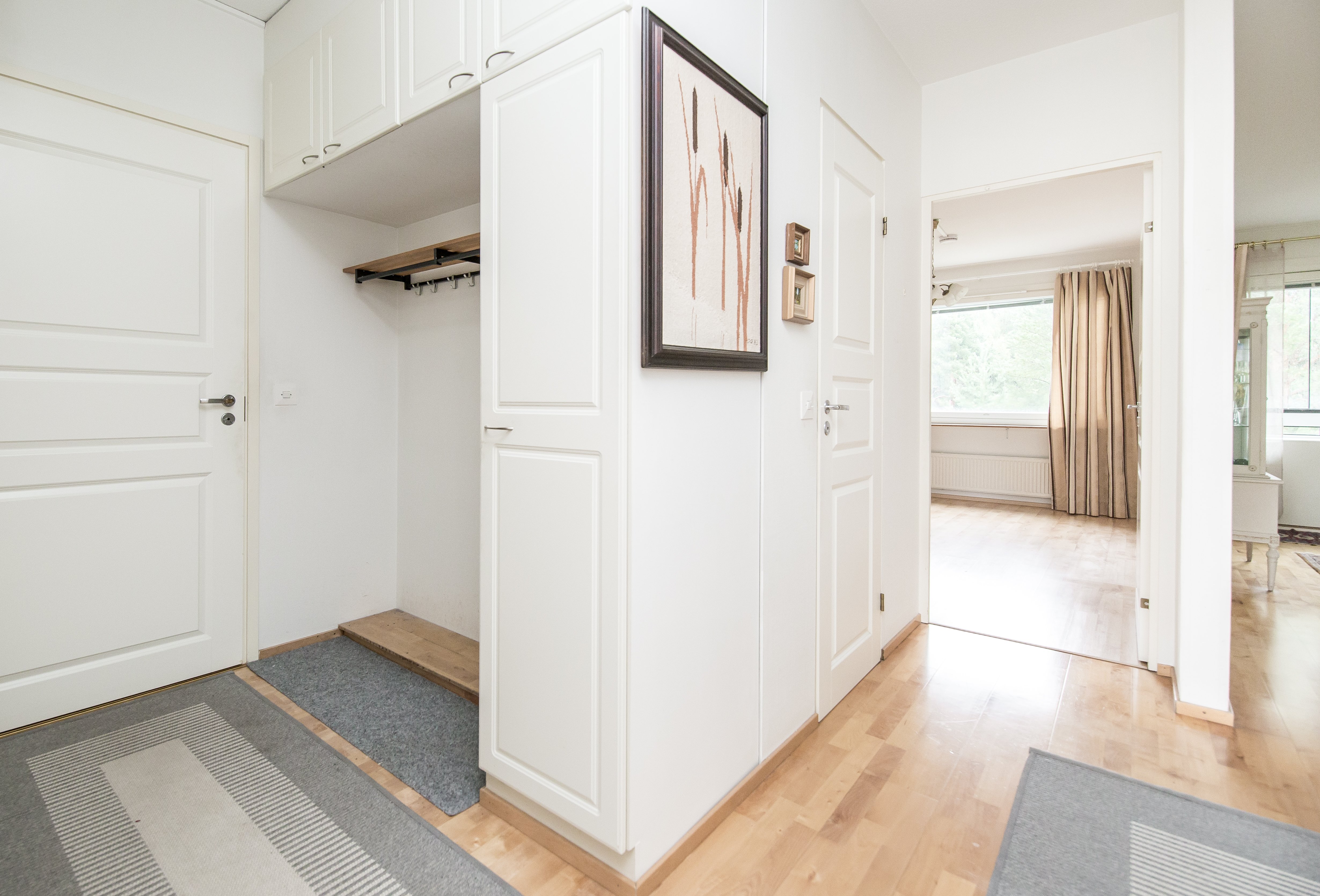 Denna lägenhet som sträcker sig genom hela huset, har en bra och funktionell planlösning och gott om förvaringsutrymmen. Köket är tillräckligt stort, även för ett rymligt matbord och det finns gott om avlastningsytor. Från vardagsrummet kommer man ut till en en egen mysig och solig söderbalkong, där man kan t.ex. grilla och umgås med familj och vänner. Tvättutrymmet är i bra skick. Och där finns även en egen bastu. Bostaden har även en luftvärmepump som ger svalka under de varmaste sommardagarna.