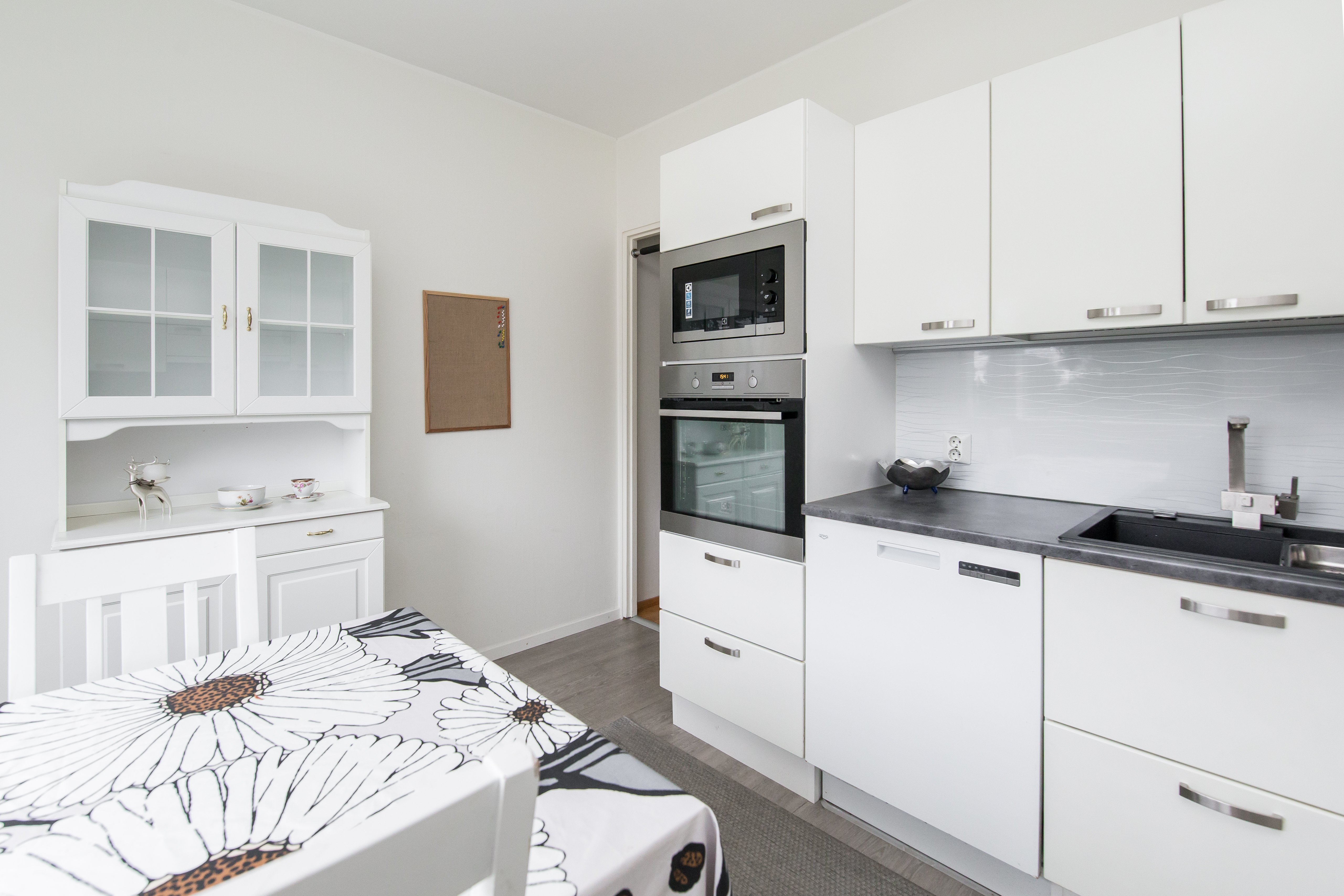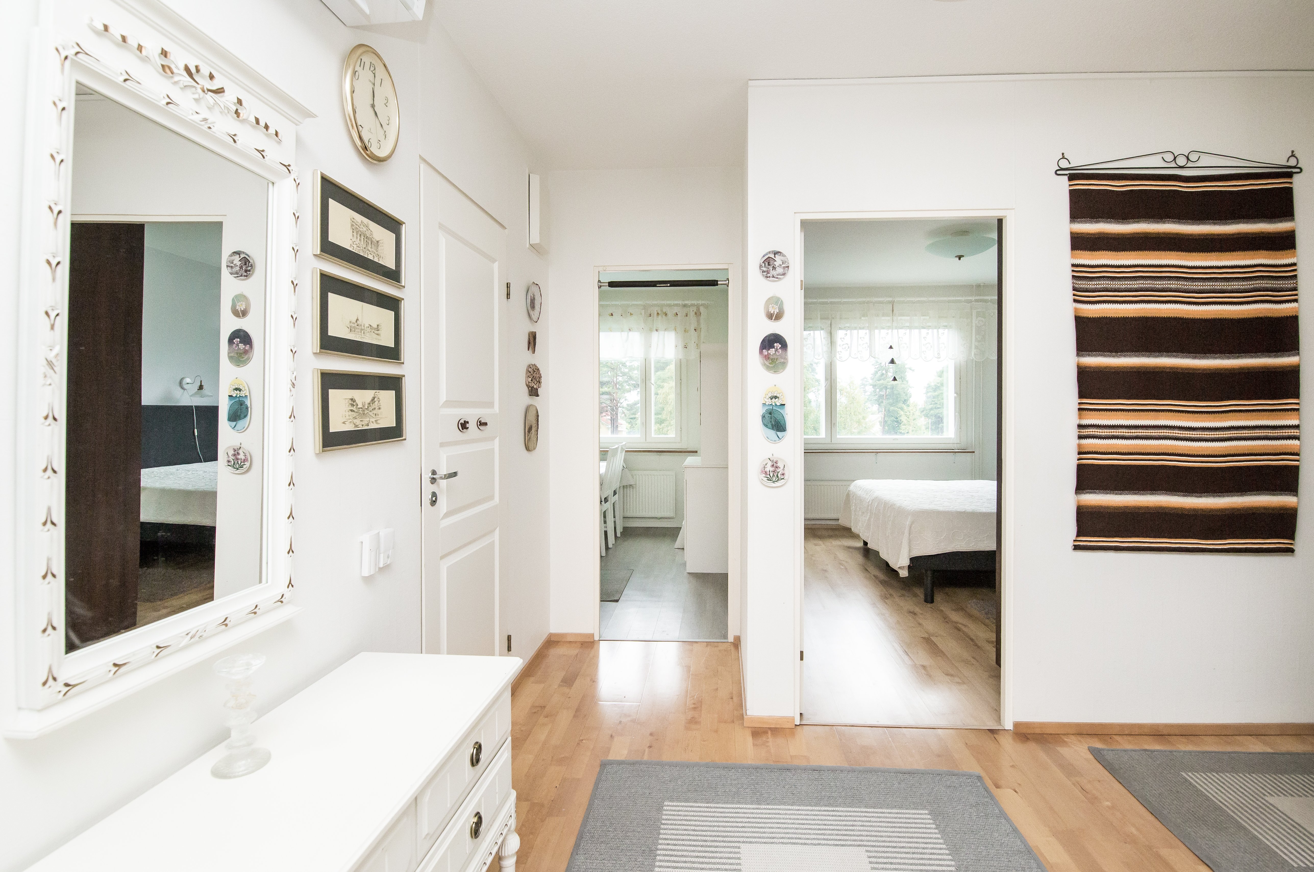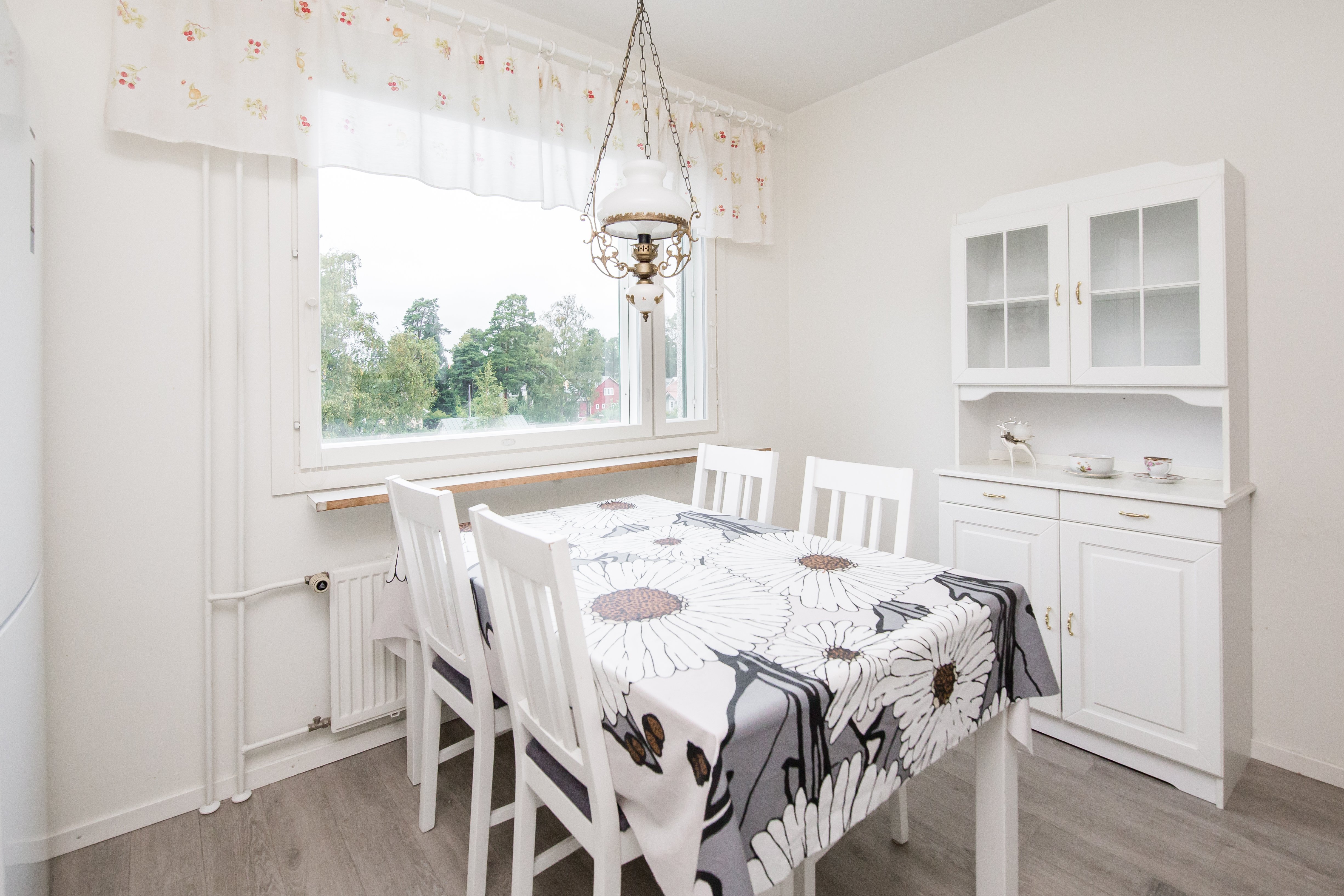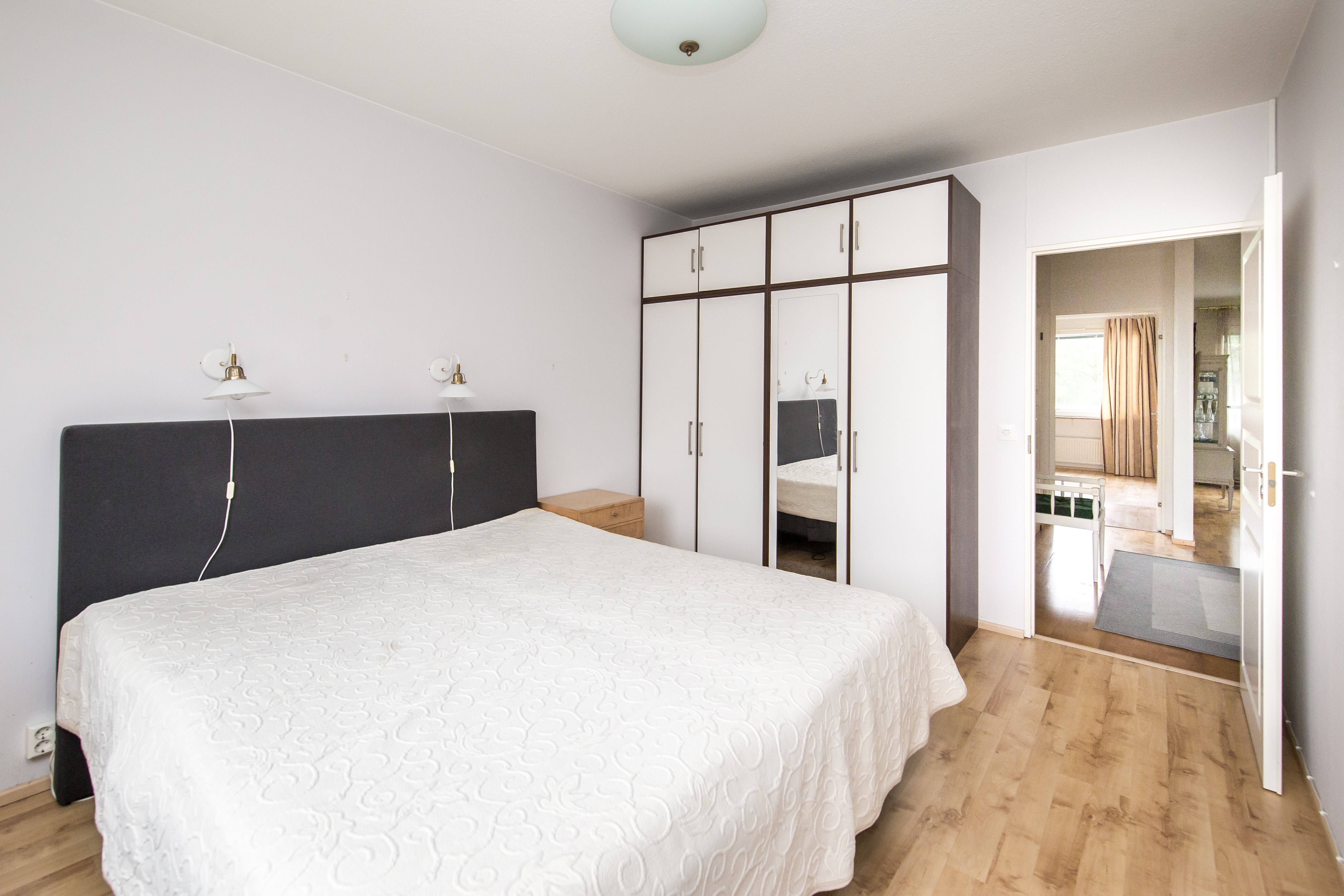 Denna lägenhet som sträcker sig genom hela huset, har en bra och funktionell planlösning och gott om förvaringsutrymmen. Köket är tillräckligt stort, även för ett rymligt matbord och det finns gott om avlastningsytor. Från vardagsrummet kommer man ut till en en egen mysig och solig söderbalkong, där man kan t.ex. grilla och umgås med familj och vänner. Tvättutrymmet är i bra skick. Och där finns även en egen bastu. Bostaden har även en luftvärmepump som ger svalka under de varmaste sommardagarna.