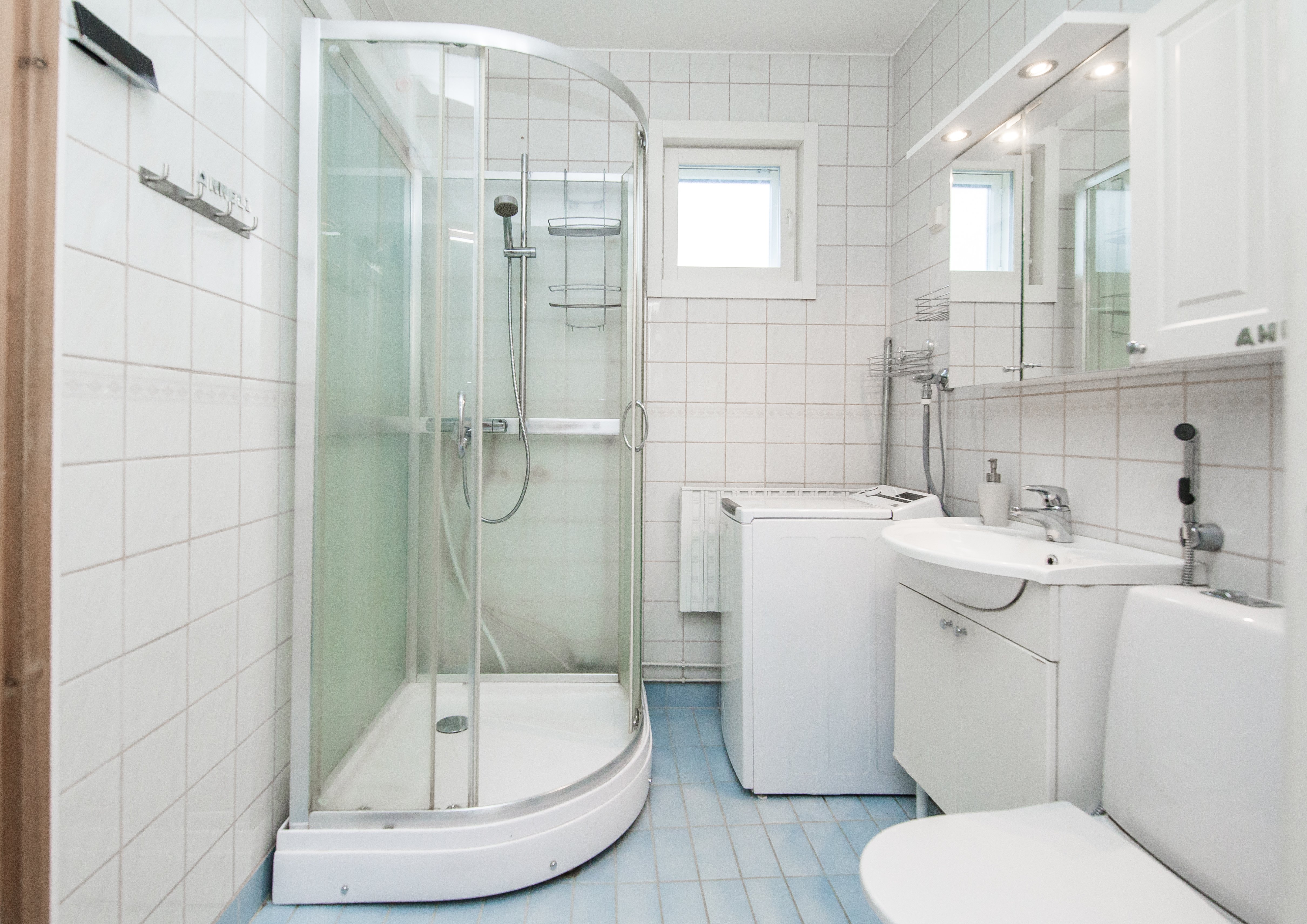 WC-istuin, suihku, suihkukaappi, pesukoneliitäntä, peilikaappi, pesuallas, allaskaappi ja bidee-suihku