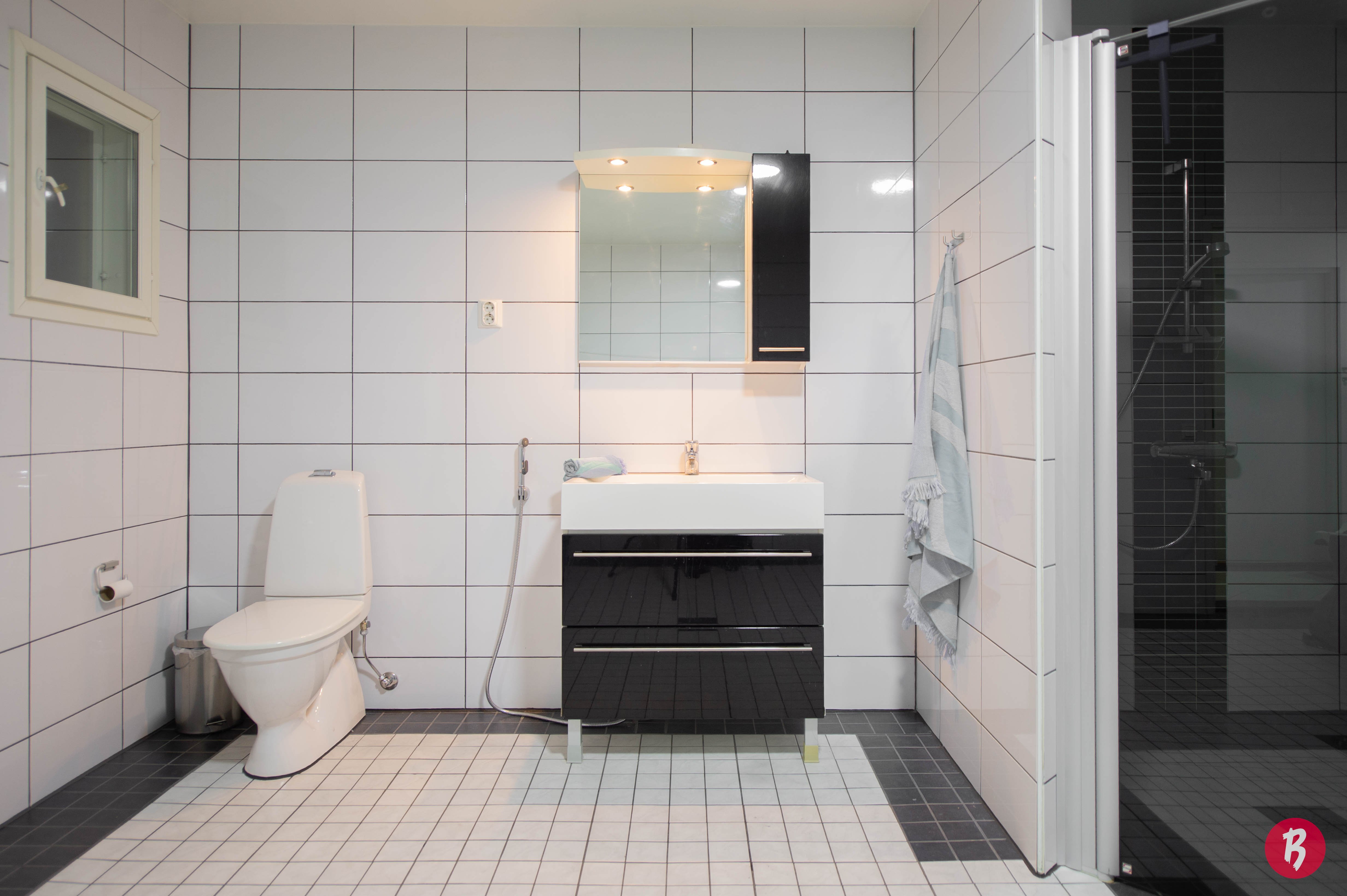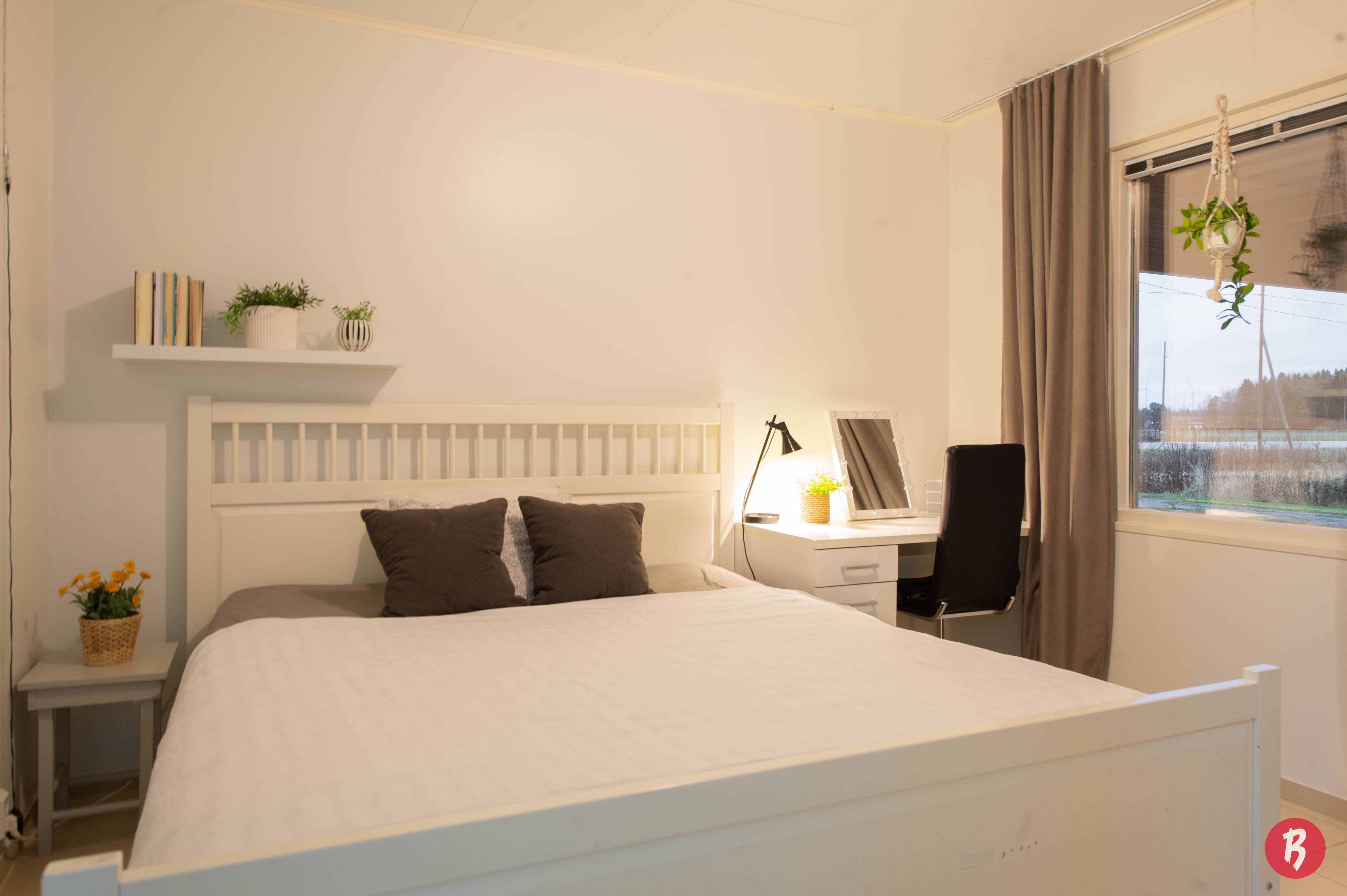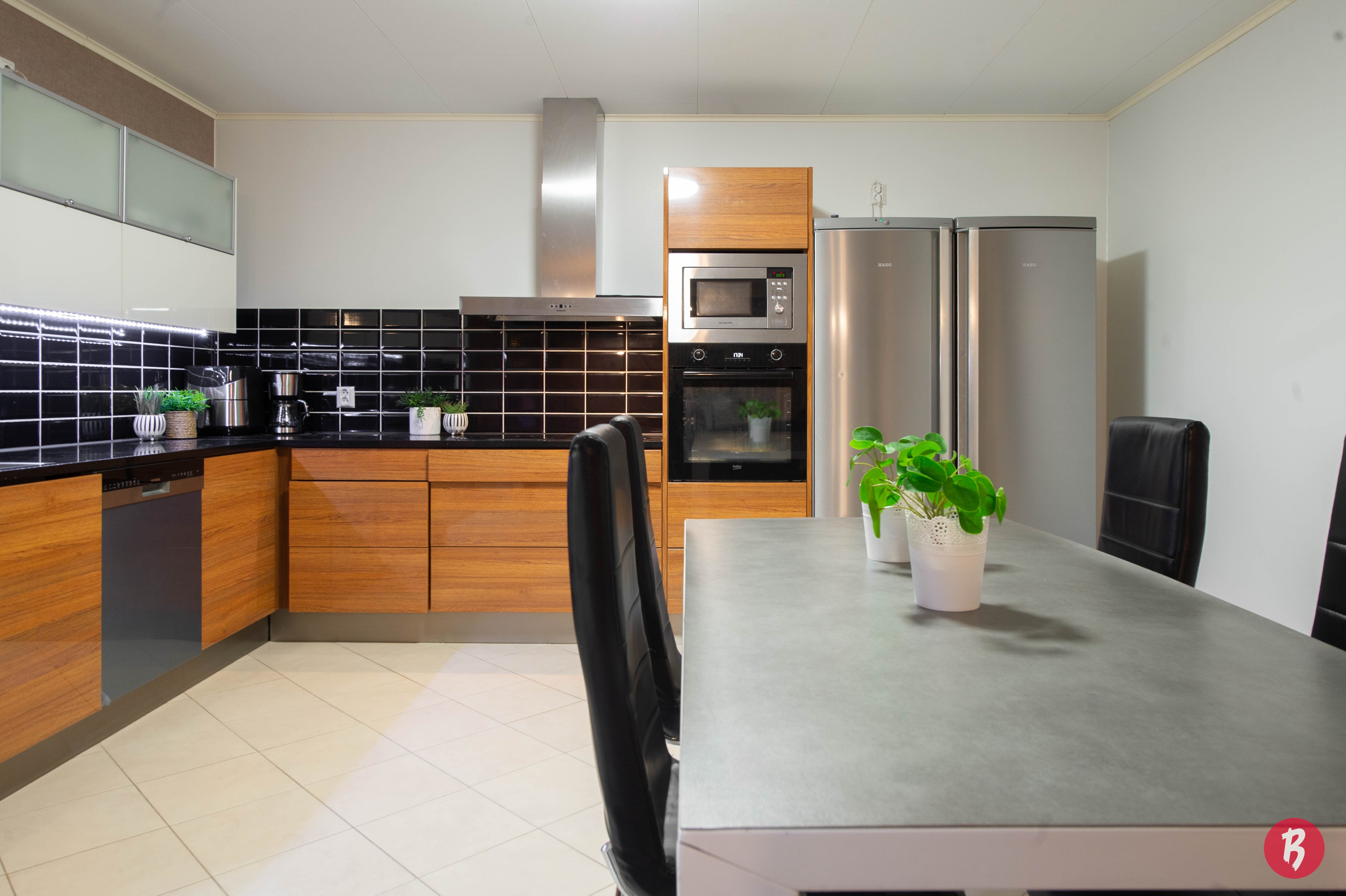 Keittiö on varusteltu nykyaikaisilla laitteilla, kuten keraamisella liedellä ja jääkaappi-pakastimella, ja sauna tarjoaa rentouttavat löylyt päivän päätteeksi. Kylpyhuoneet ovat käytännöllisiä ja tyylikkäitä, ja säilytystilaa löytyy runsaasti kaapistoista.