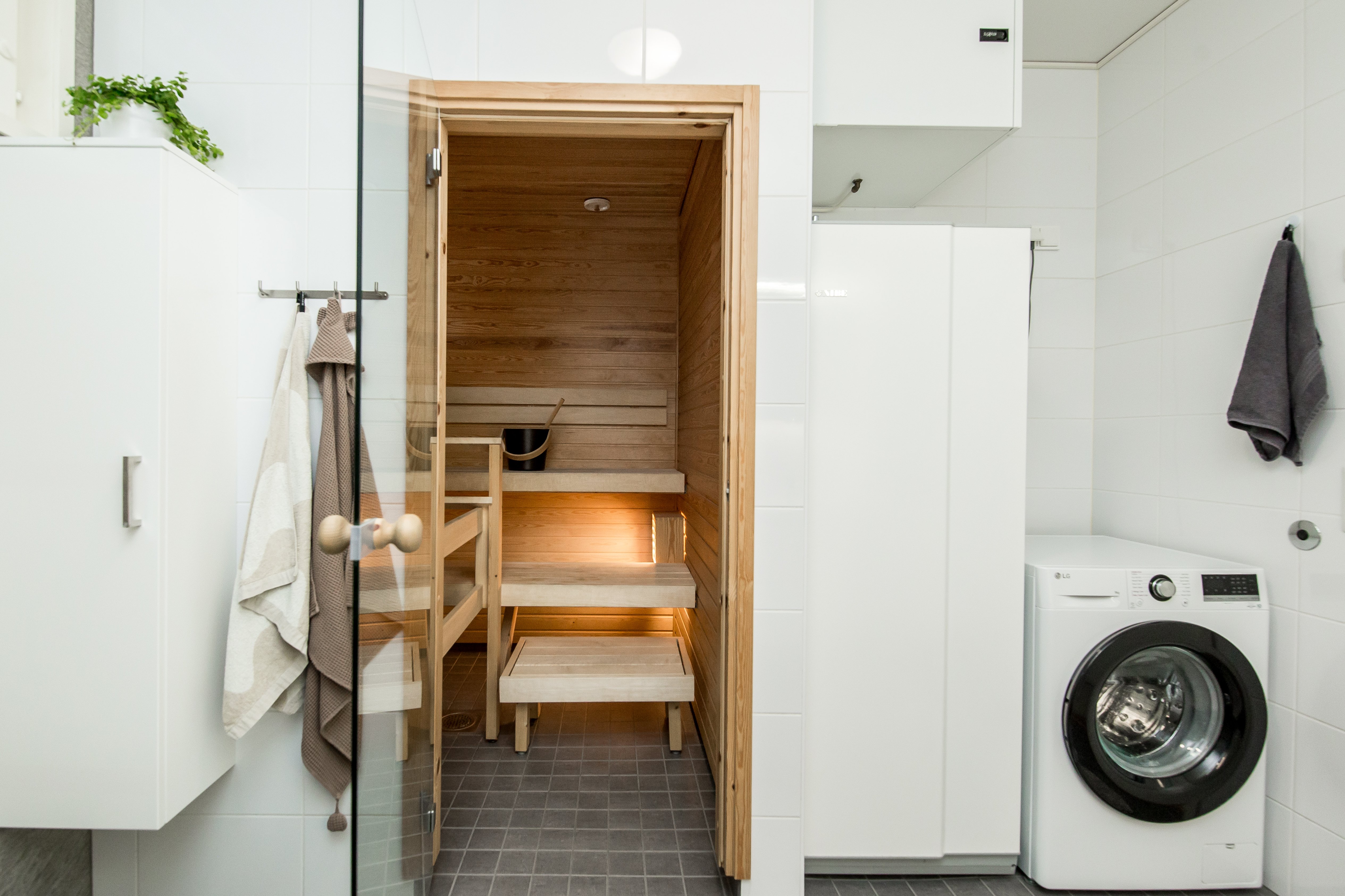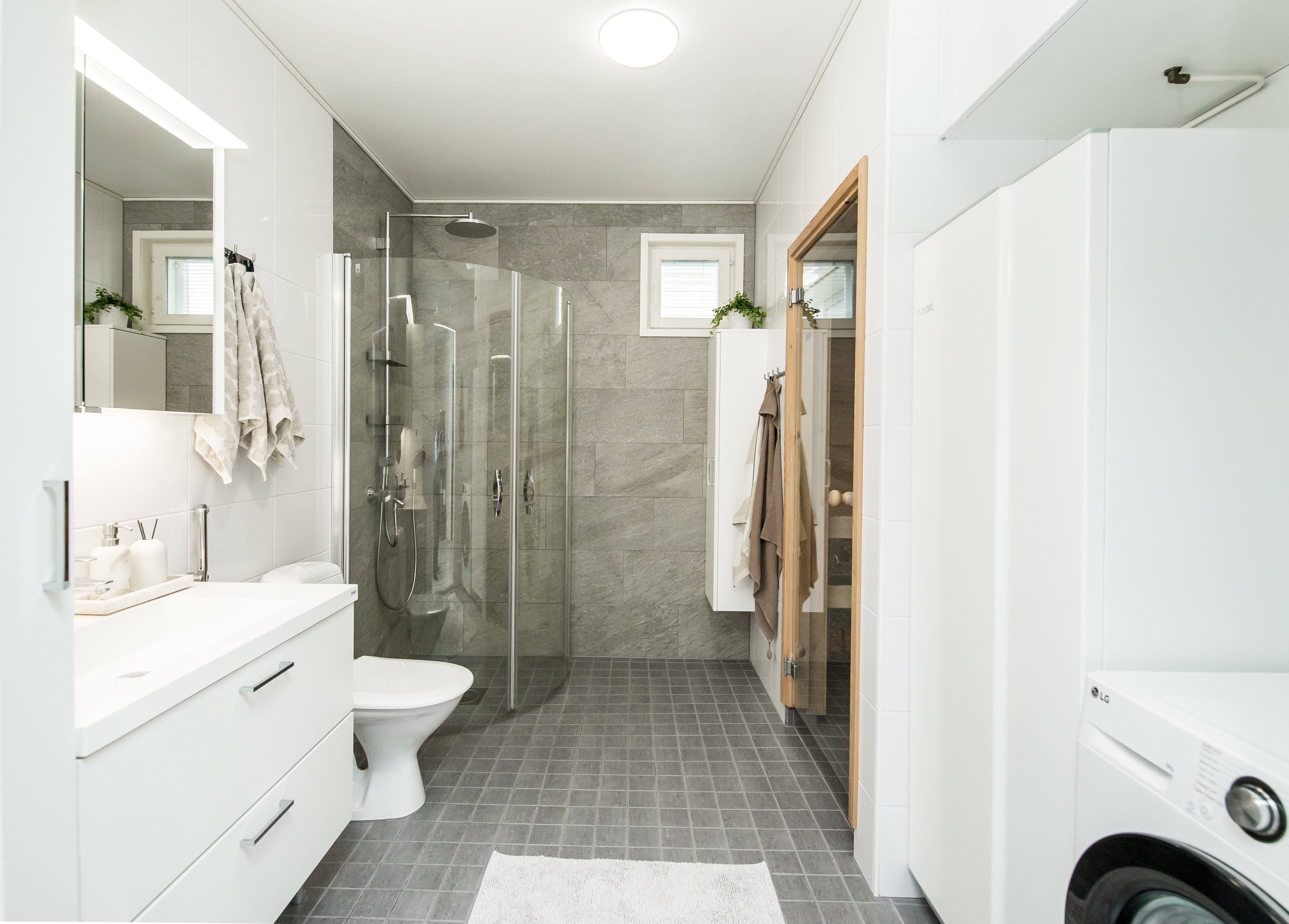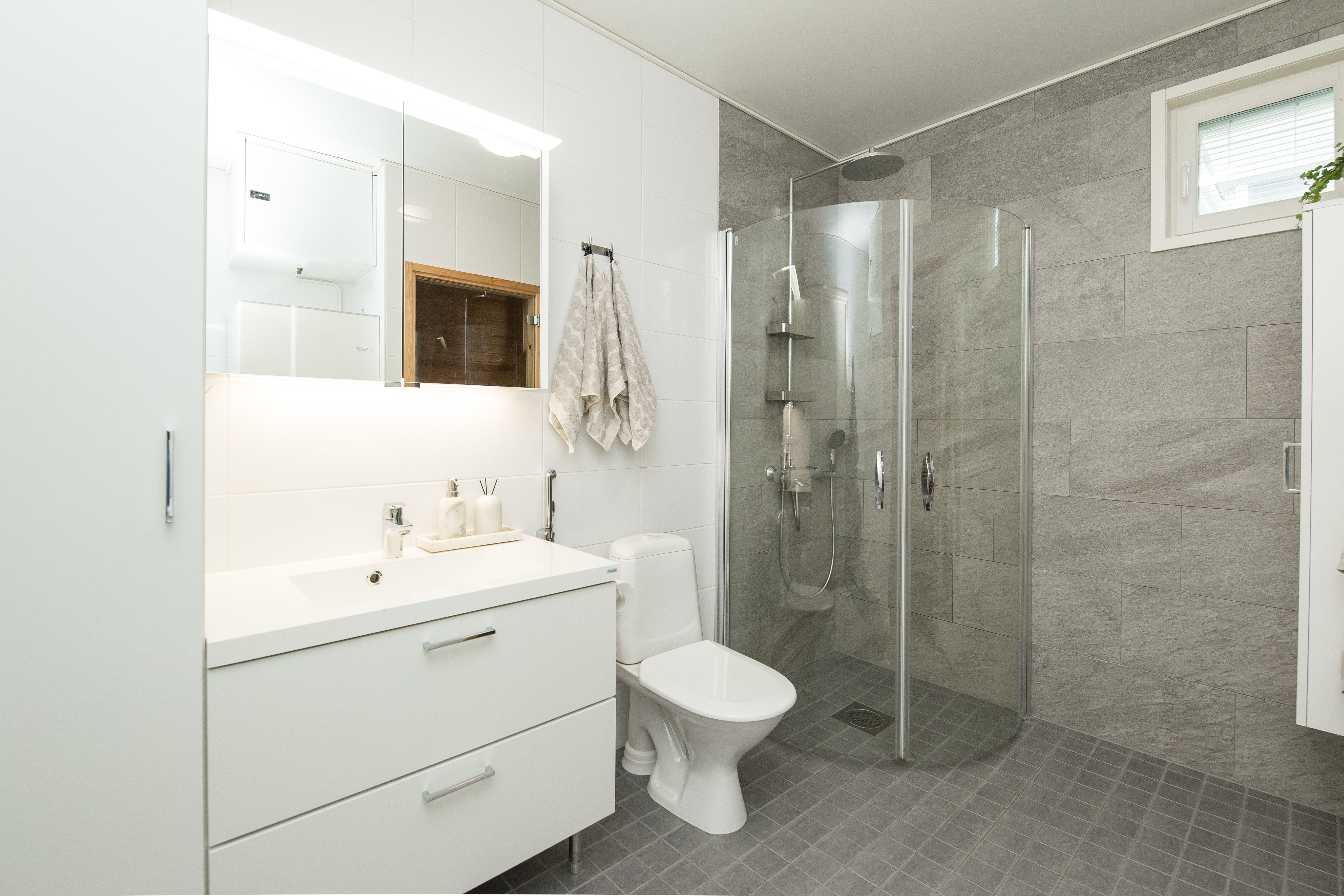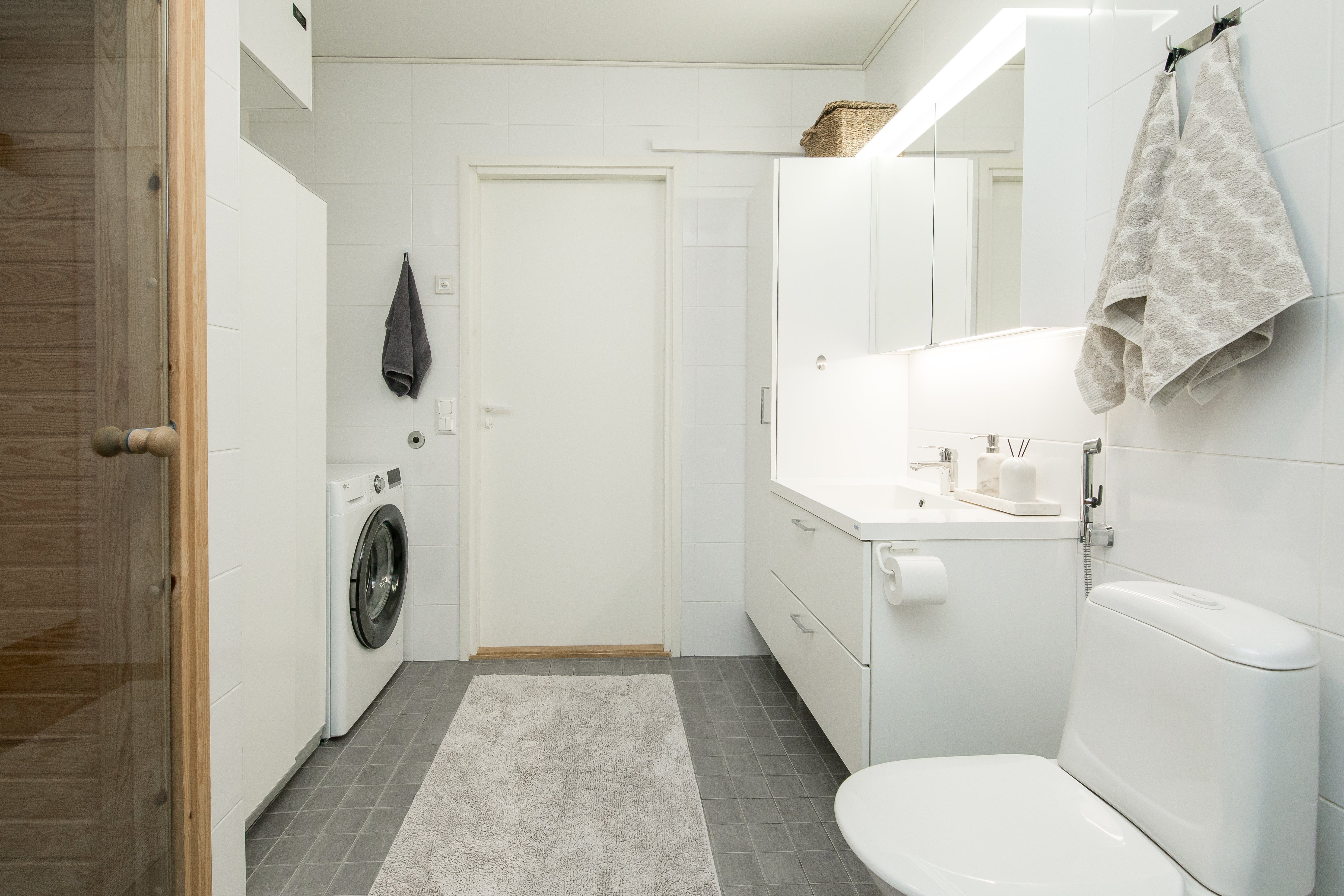 WC-istuin, suihku, lattialämmitys, bidee-suihku, allaskaappi, pesukoneliitäntä, peilikaappi, pesuallas ja suihkuseinä