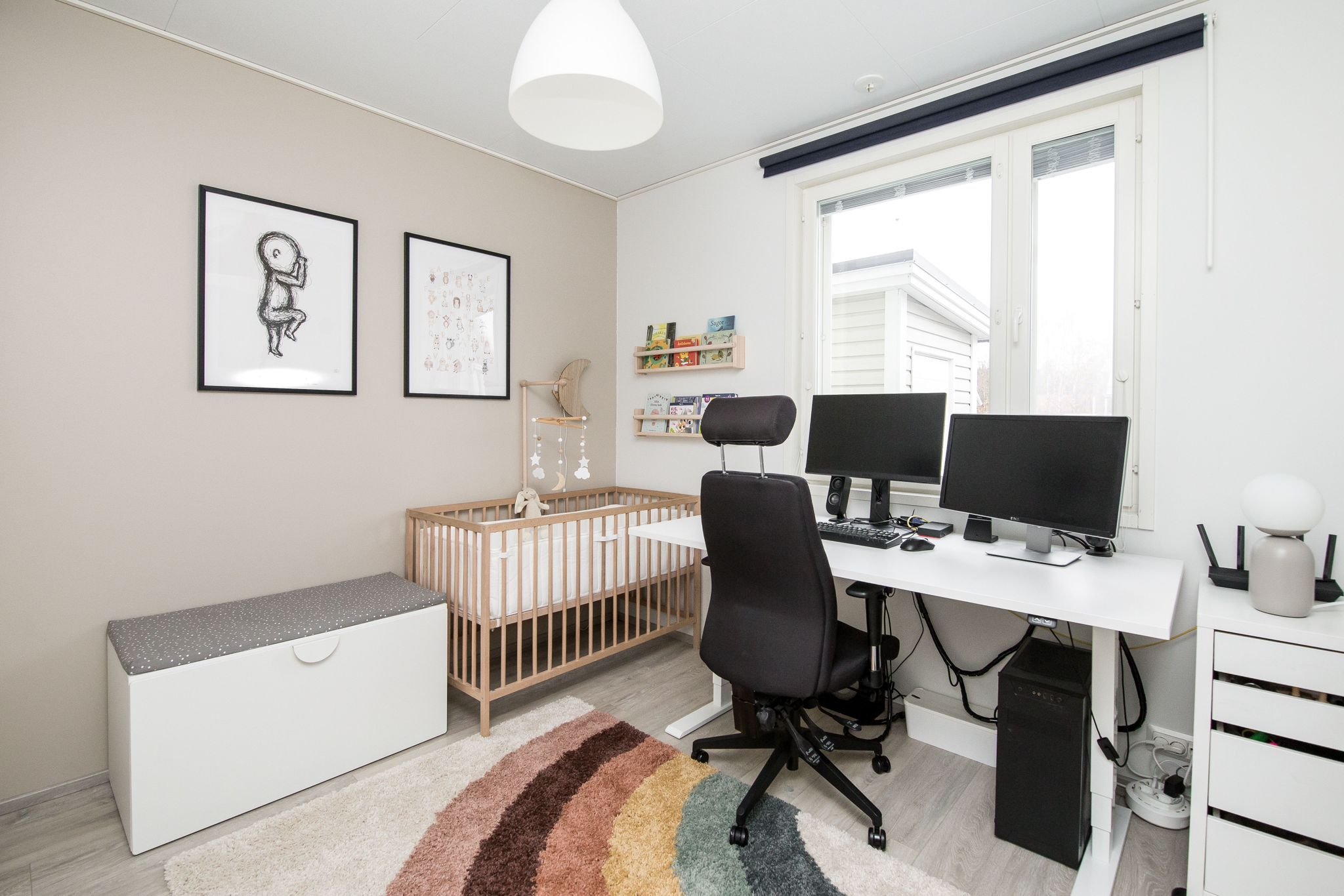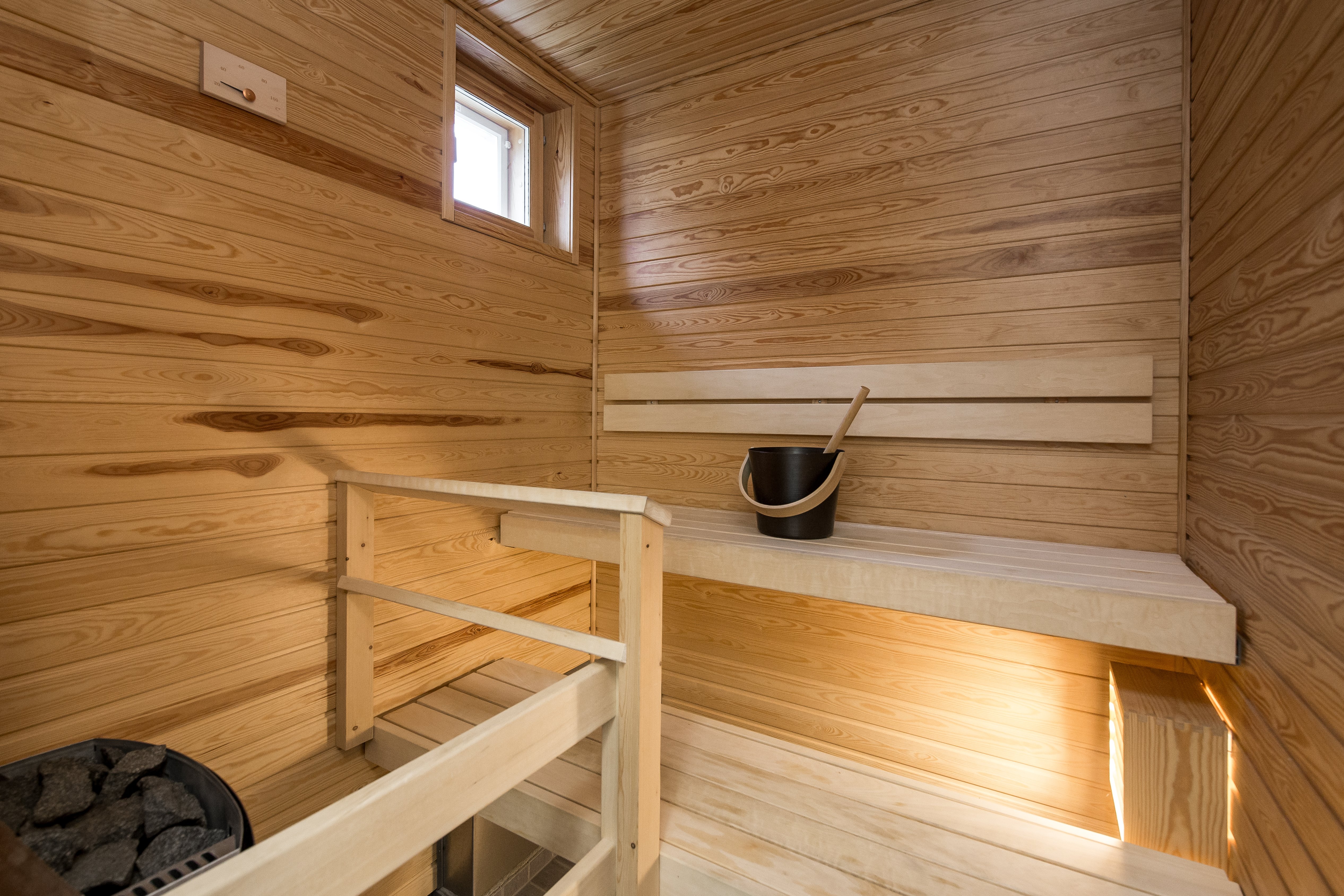 Bostaden har två sovrum, ett rymligt vardagsrum och ett välutrustat kök med allt som behövs även för den mer krävande kocken. I badrummet finns golvvärme, och bastun erbjuder sköna stunder av avkoppling efter en lång dag. Den egna terrassen ger en trivsam plats att njuta av den friska luften och den vackra omgivningen. De skandinaviska materialvalen skapar ett modernt och fräscht intryck.