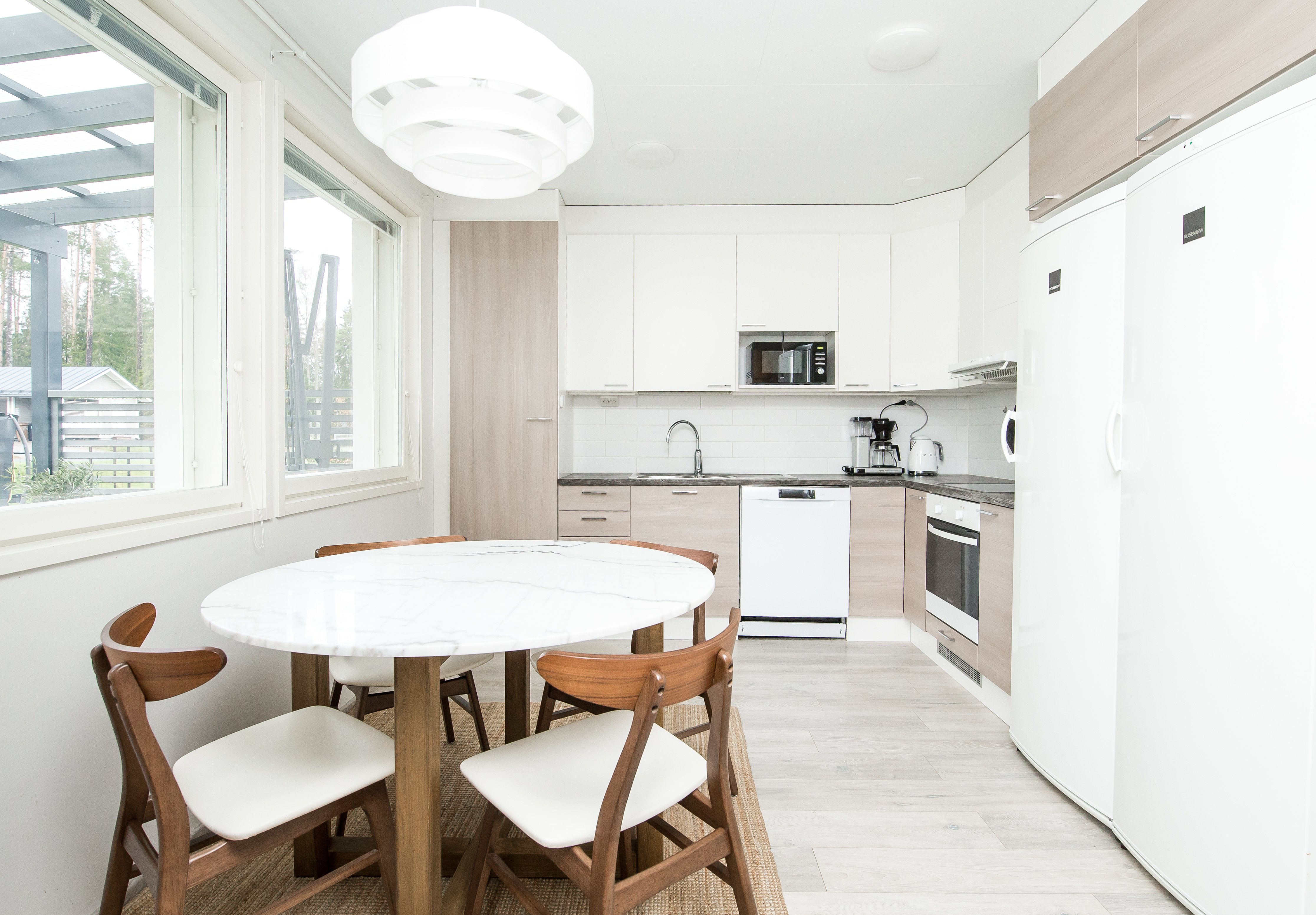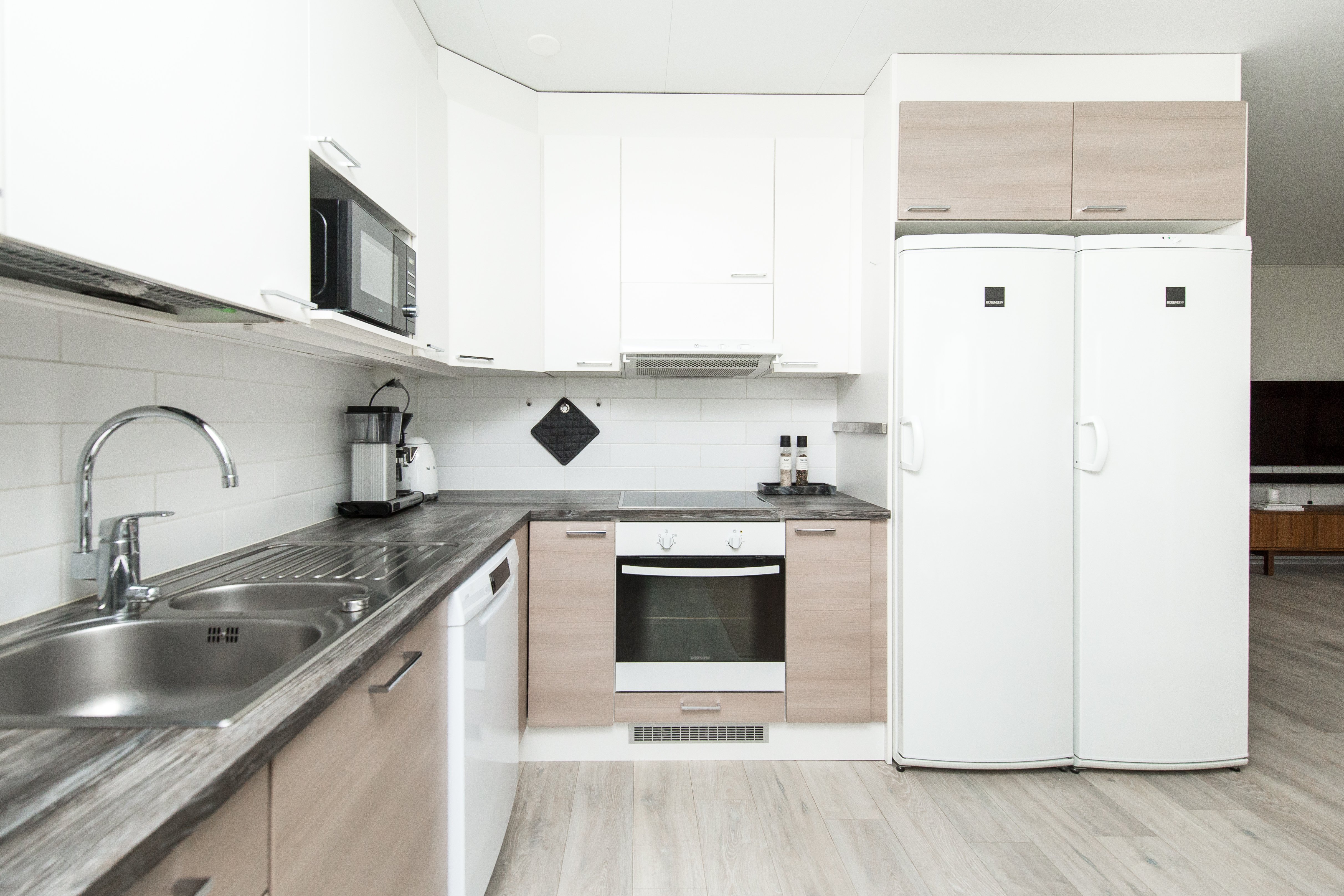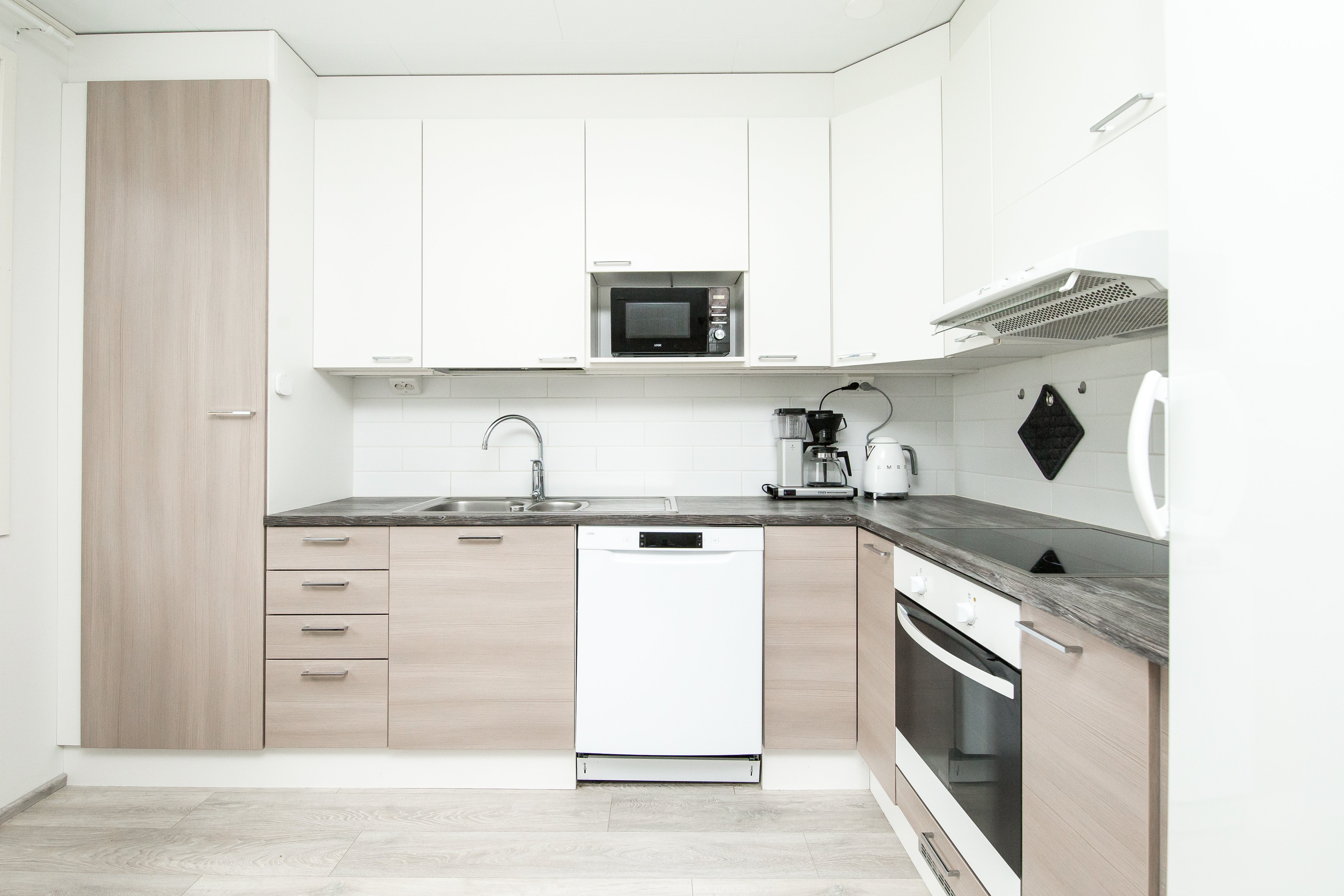 Jääkaappi, erillinen pakastin, uuni, liesi, liesituuletin ja astianpesukone
