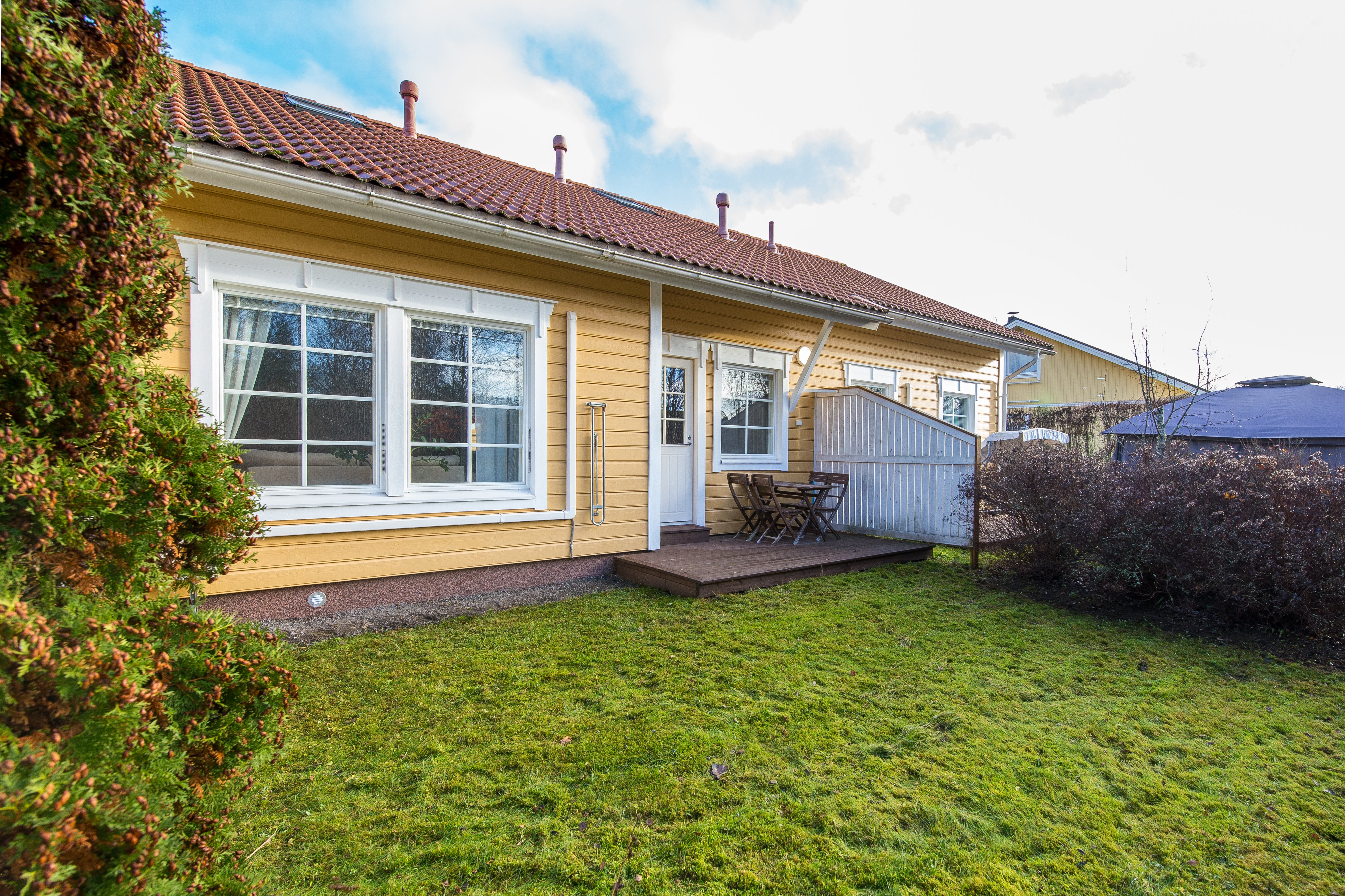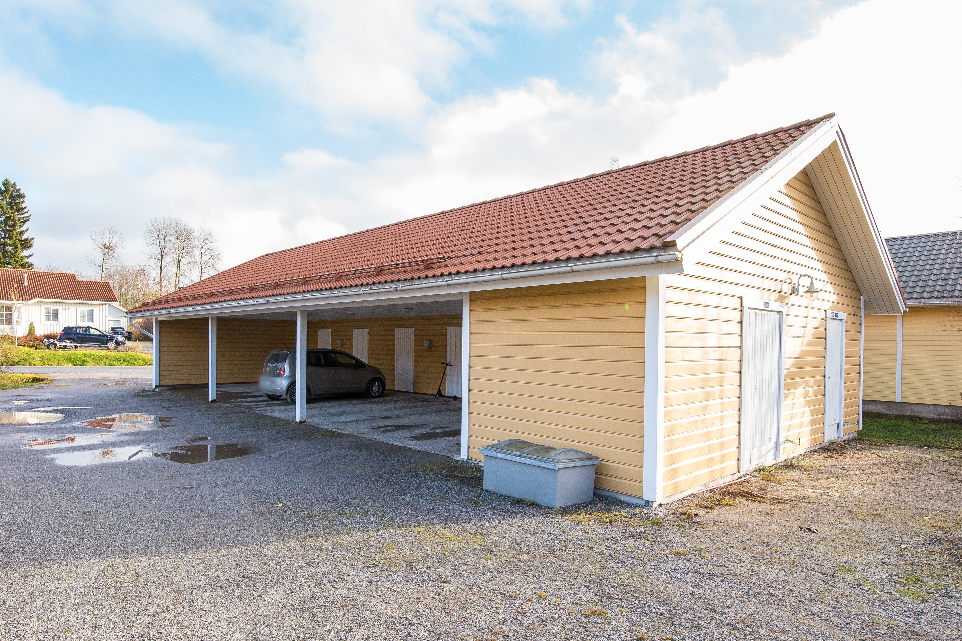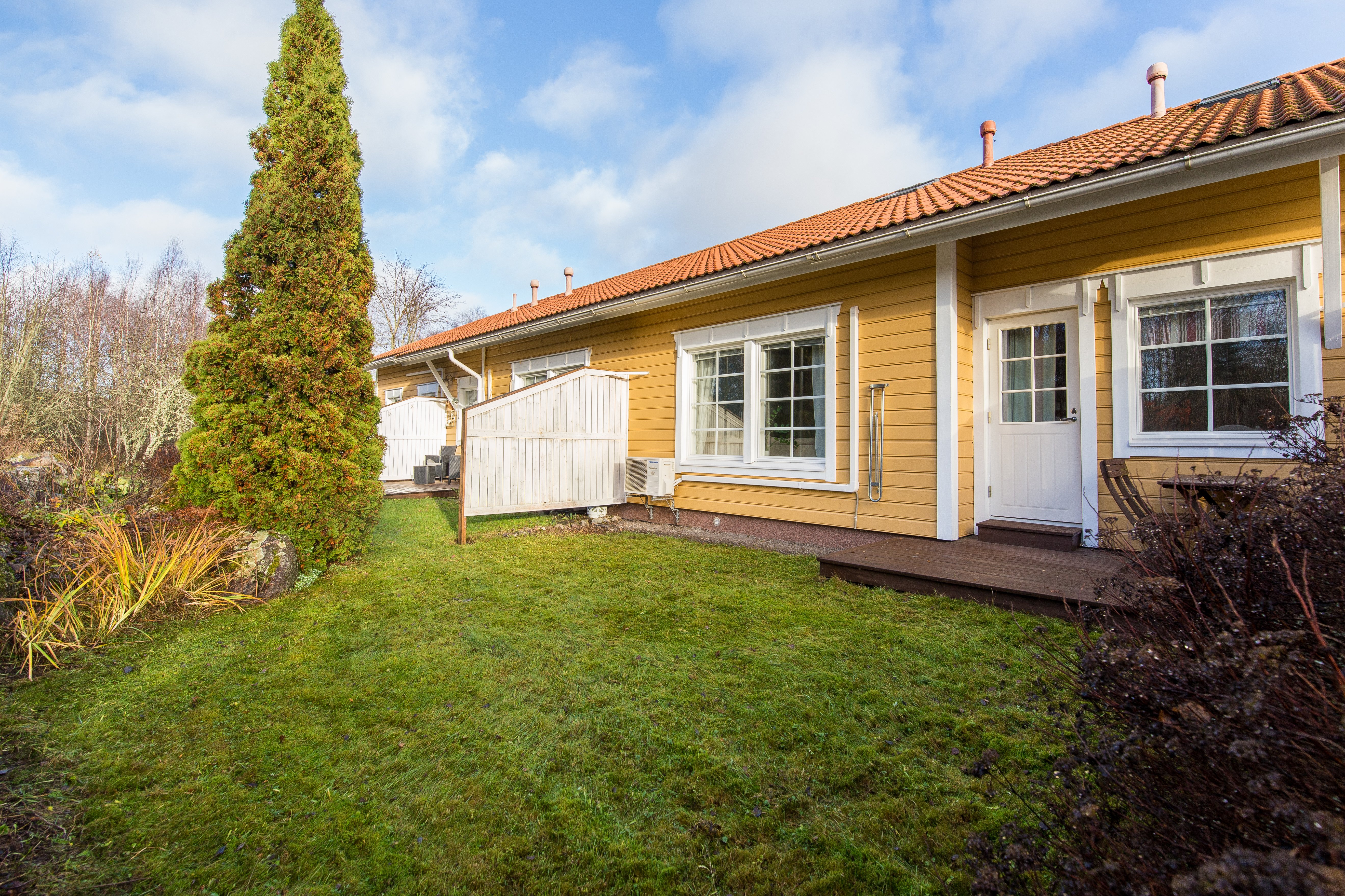 Radhuset, byggt 2003, har hållits i gott skick. Varje bostad har en egen biltakplats- och bilplats med elstolpe. I anslutning till biltaksplatsen finns ett rymligt uteförråd. Bostaden har gott om plats även för en större familj. Ett eget soligt gårdsområde ger extra utrymme för utomhusaktiviteter och avkoppling.