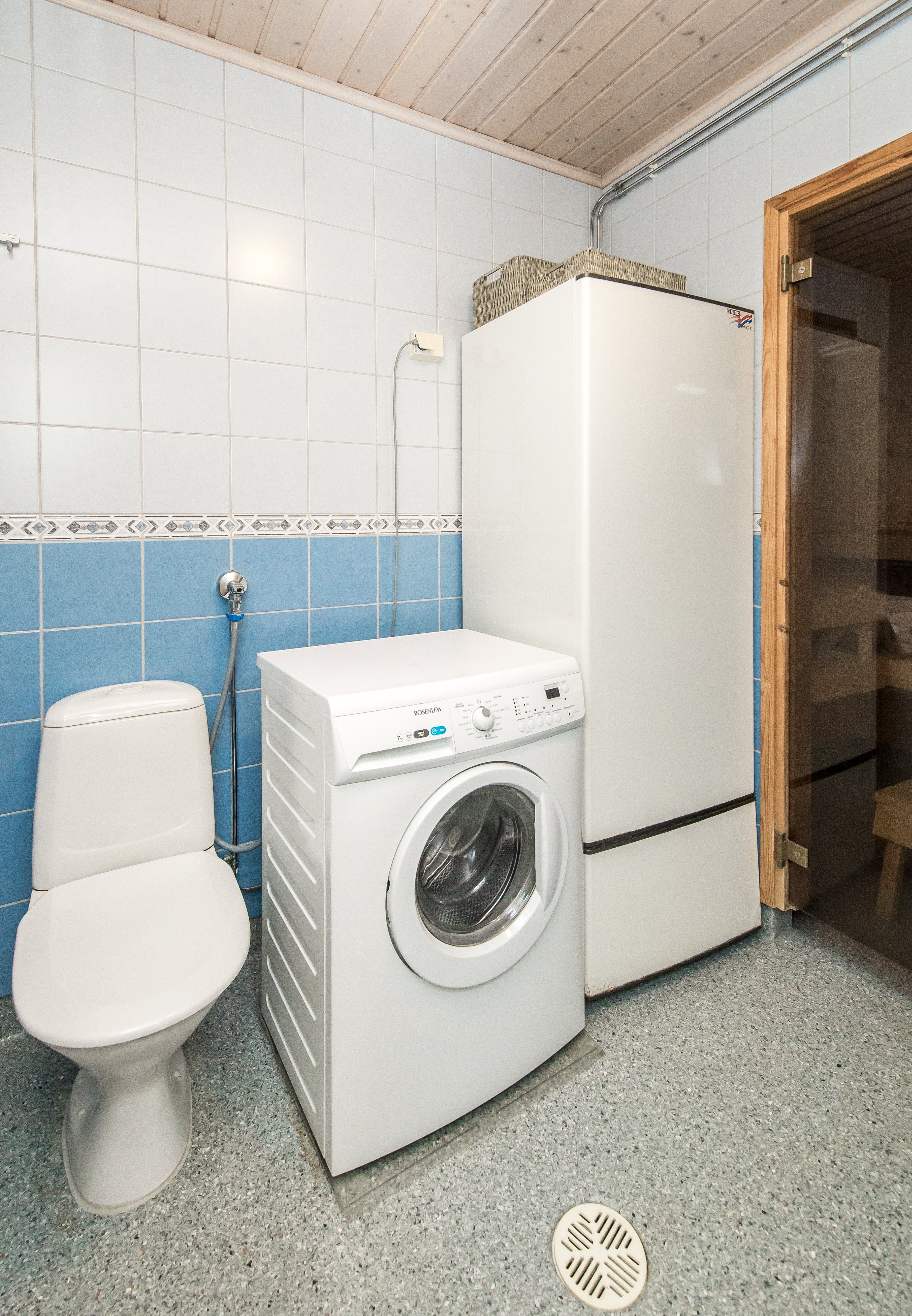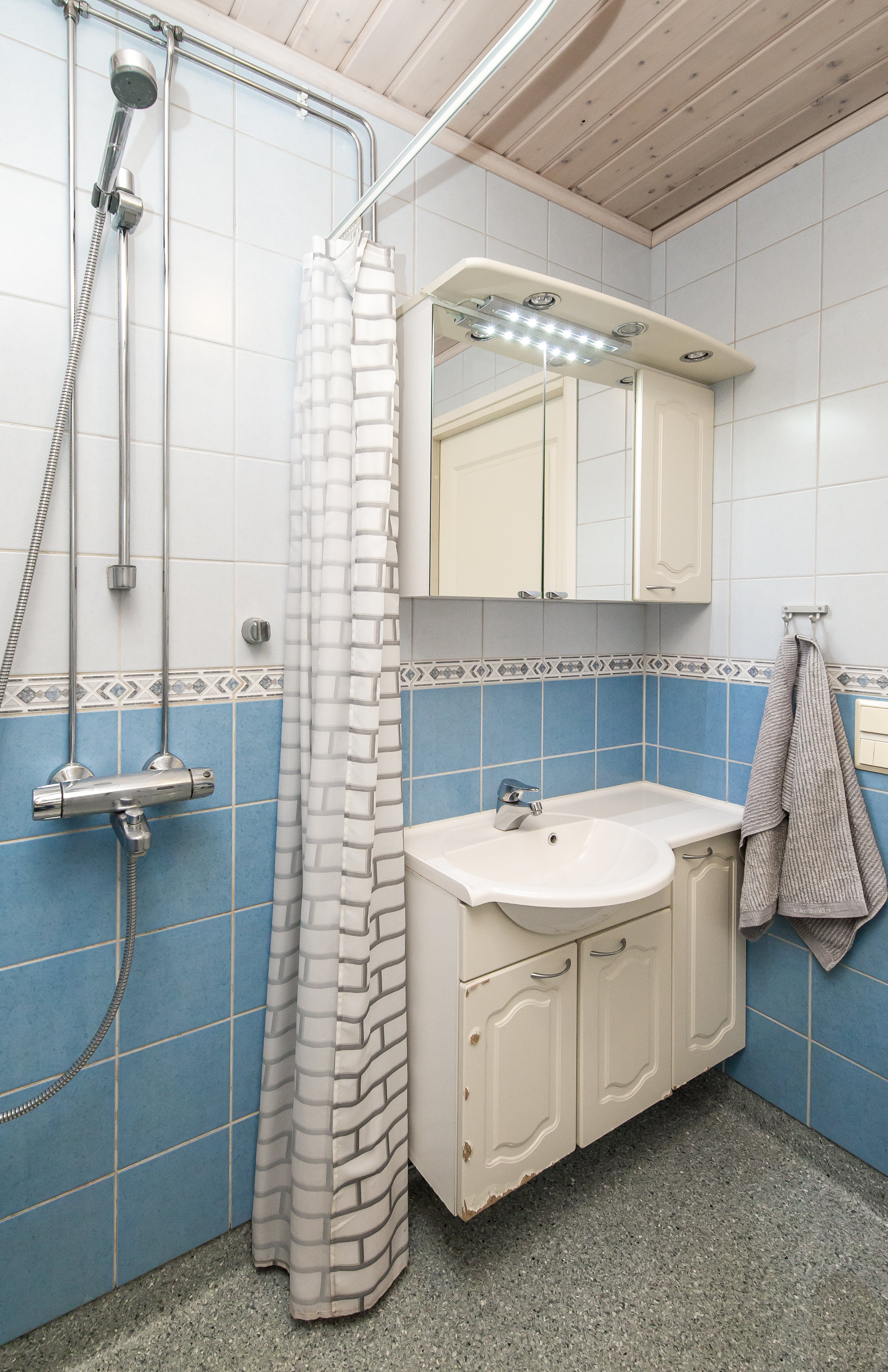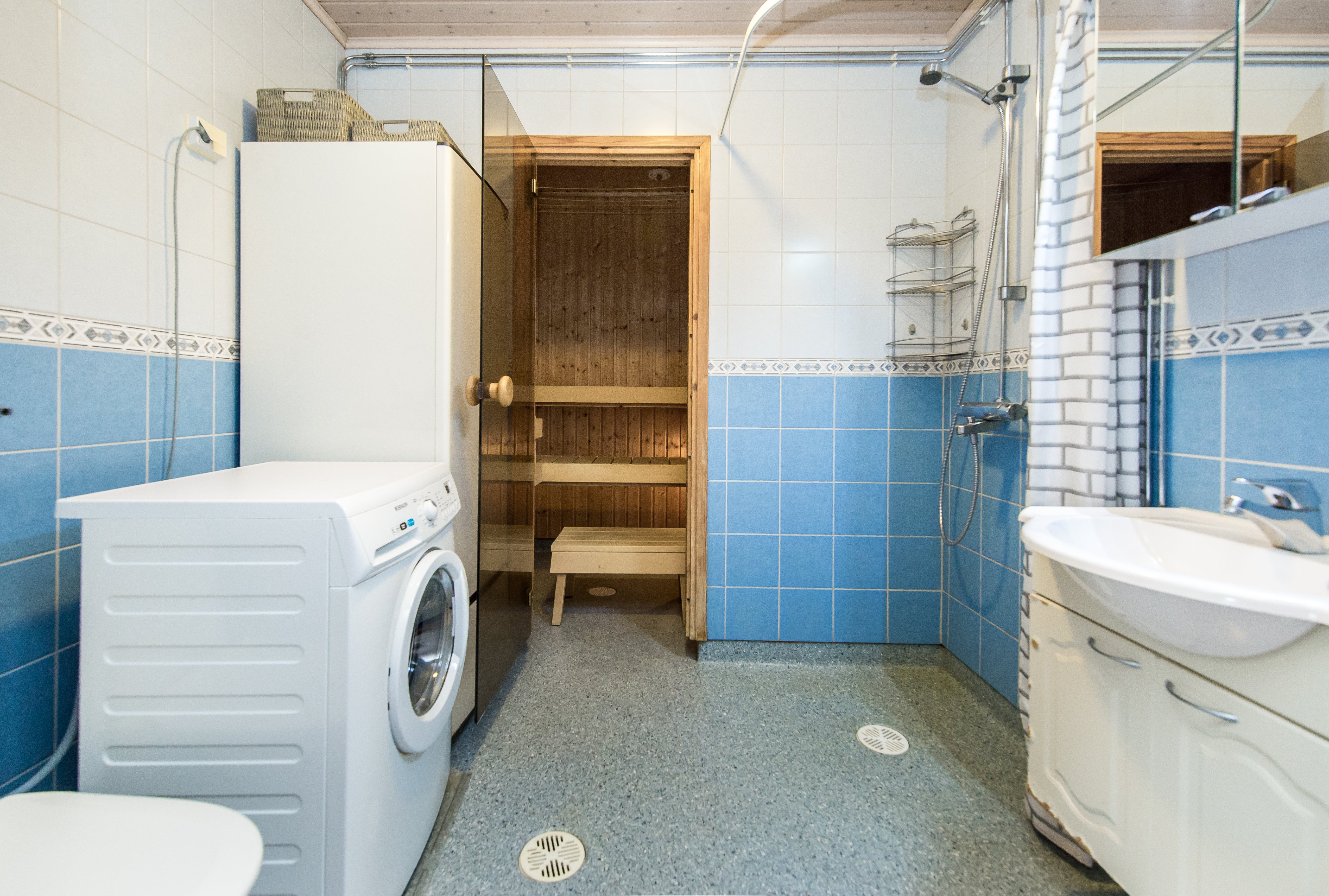 WC-istuin, suihku, pesukoneliitäntä, lattialämmitys, peilikaappi, pesuallas ja allaskaappi