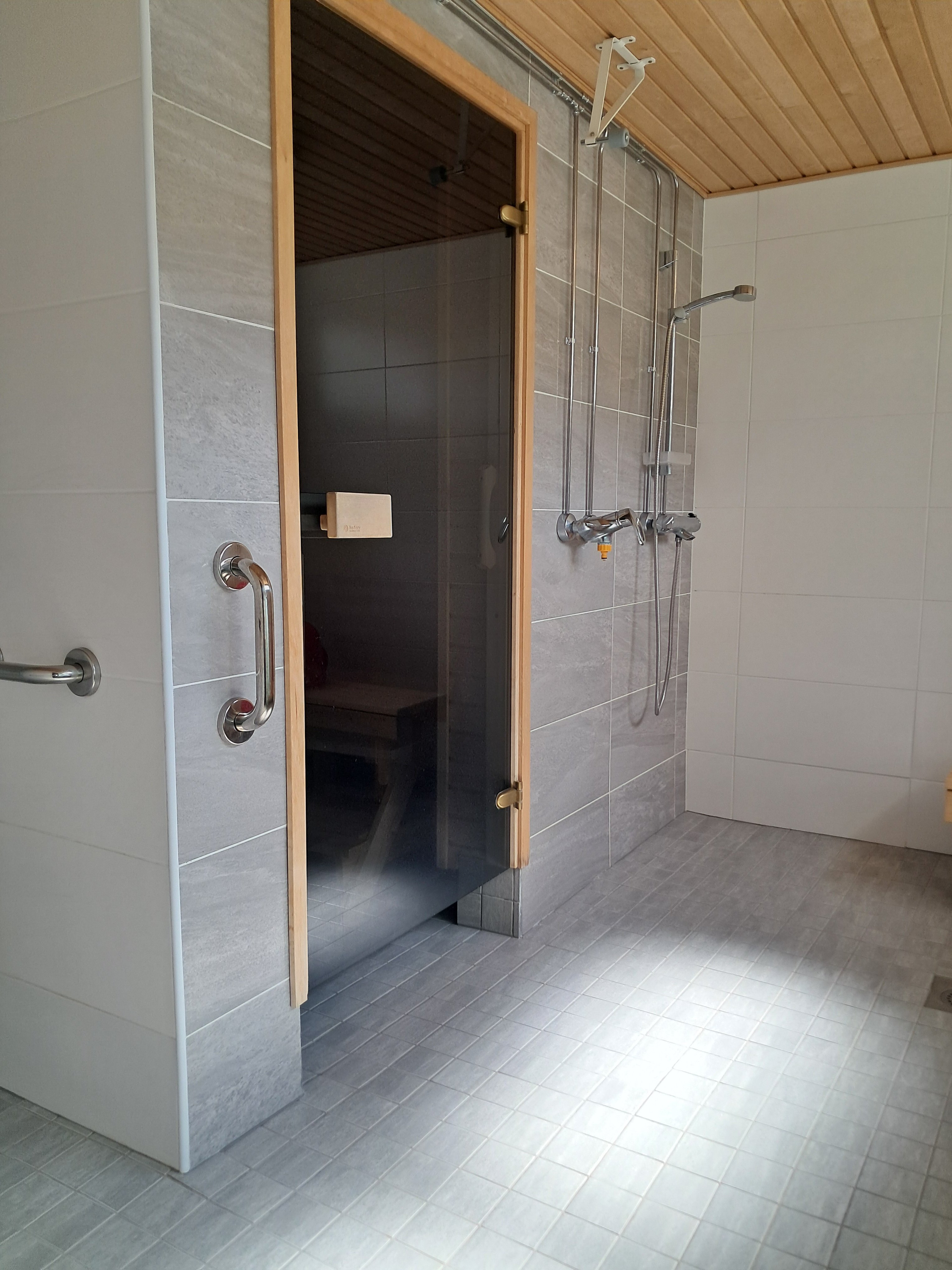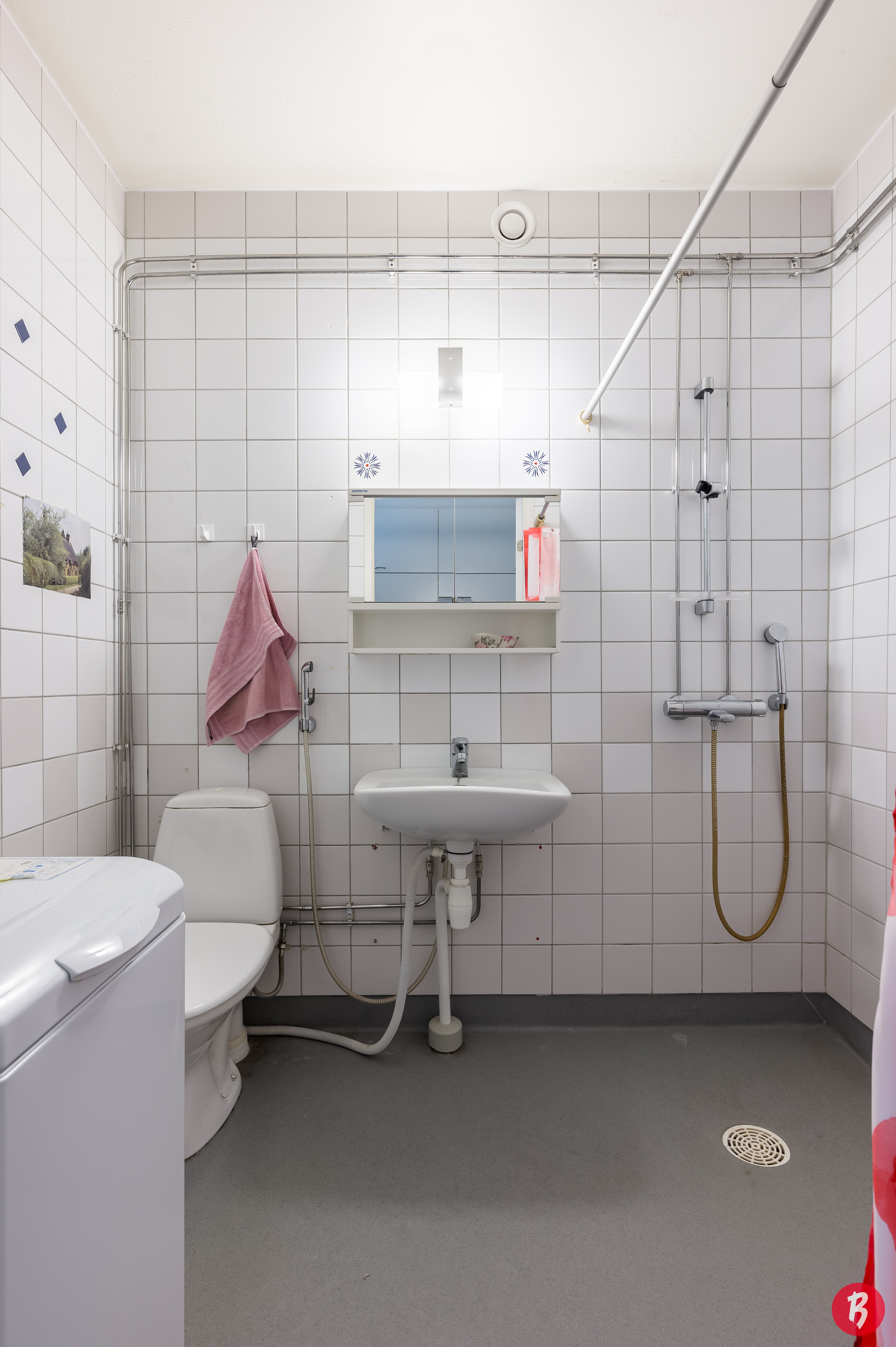 WC-istuin, pesukoneliitäntä, pesuallas, allaskaappi, peili, bidee-suihku ja suihku