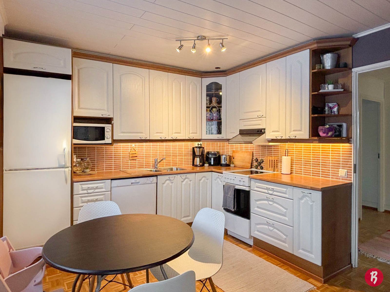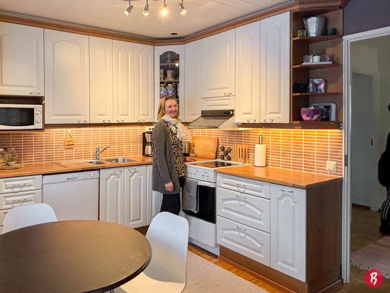 Keittiössä on hyvin laskutilaa. Olohuoneseen ja aulaan avautuvassa keittiössä on helppo kulkea. Olohuoneen ja keittiön välissä on liukuovi, jolla saat tehtyä tilasta erillisemmän.