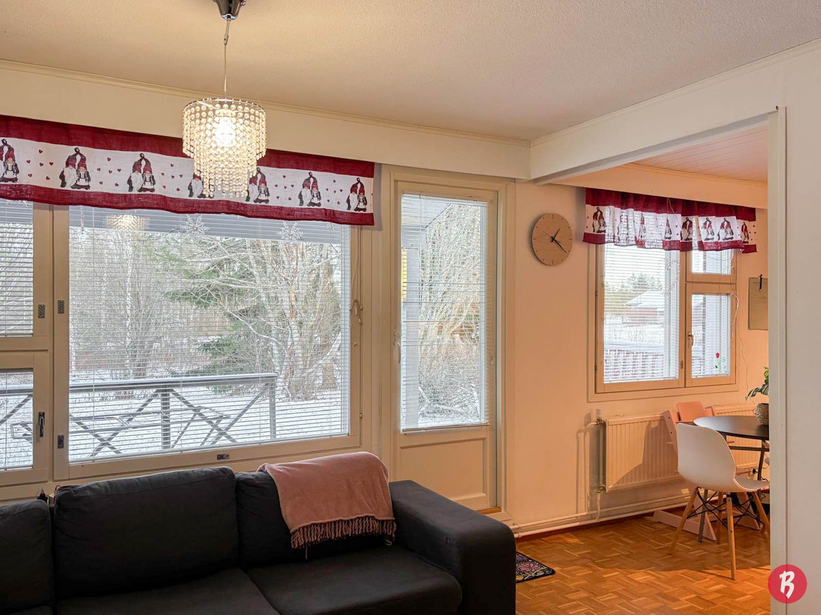 Koskipuhdossa kaukolämmössä oleva rivitalo kolmio. Asunto sijaitsee ulkoilureitin läheisyydessä ja takapiha rajoittuu Kalajokeen asti ulottuvaan peltoalueeseen. Ulkovarasto sekä autokatos omassa pihassa. Tilava kylpyhuone toimii myös kodihoitohuoneena, auttaen arjen pyöritystä. Tilaa löytyy pesutornille ja kaapistoja ja laskutilaa on sopivasti.