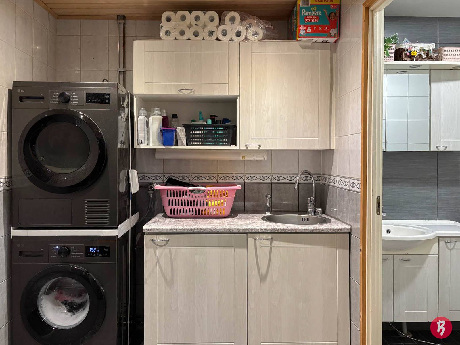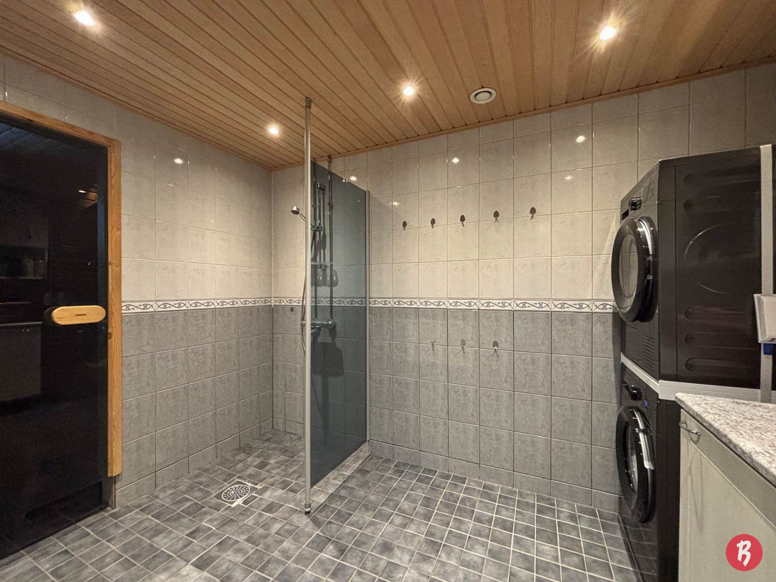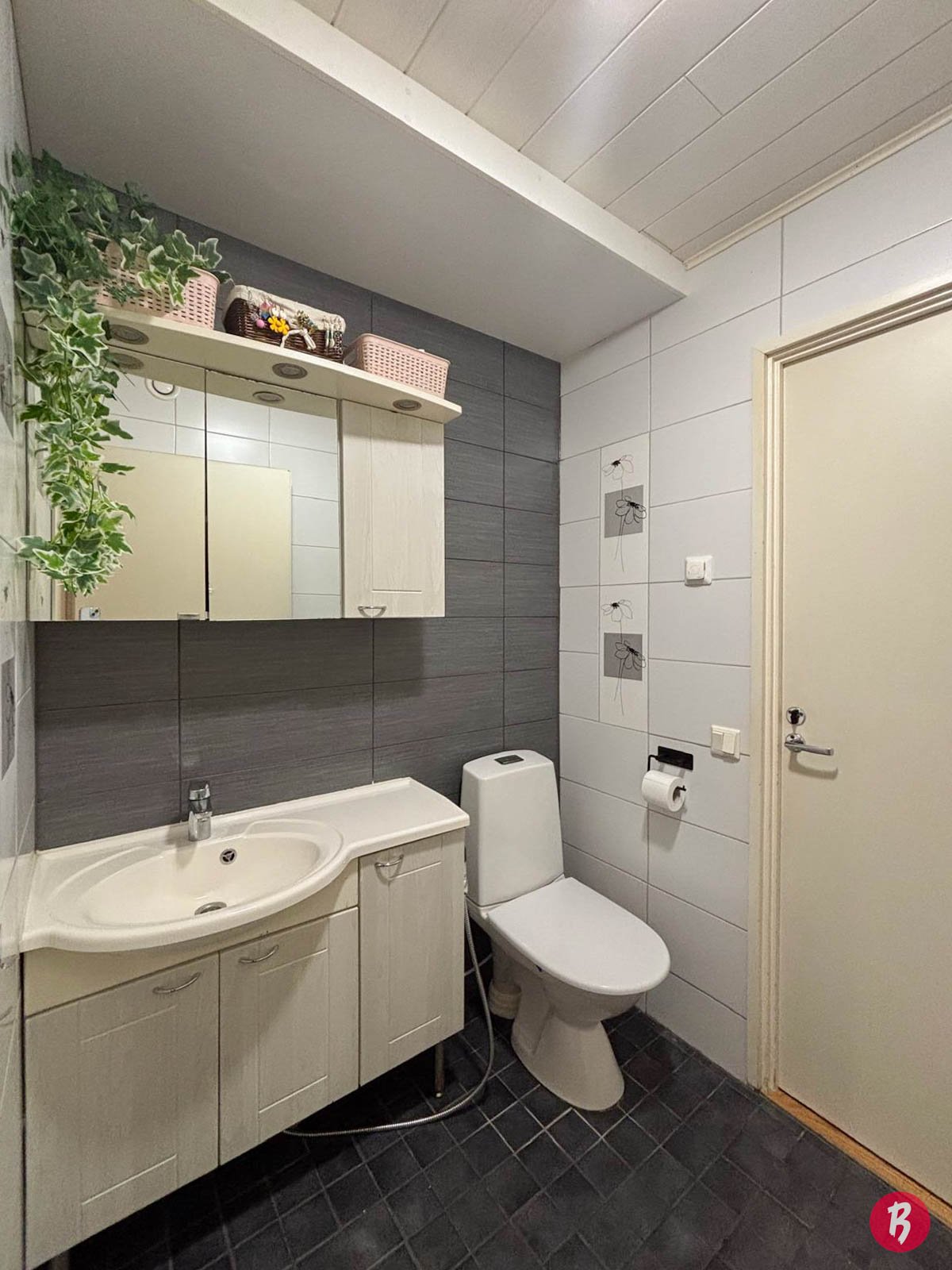 Pesukoneliitäntä (tila pesutornille), lattialämmitys (mukavuuslämmitys säädettävissä), suihku, suihkuseinä, allaskaappi, pesuallas ja kaapistot ja pesuallas