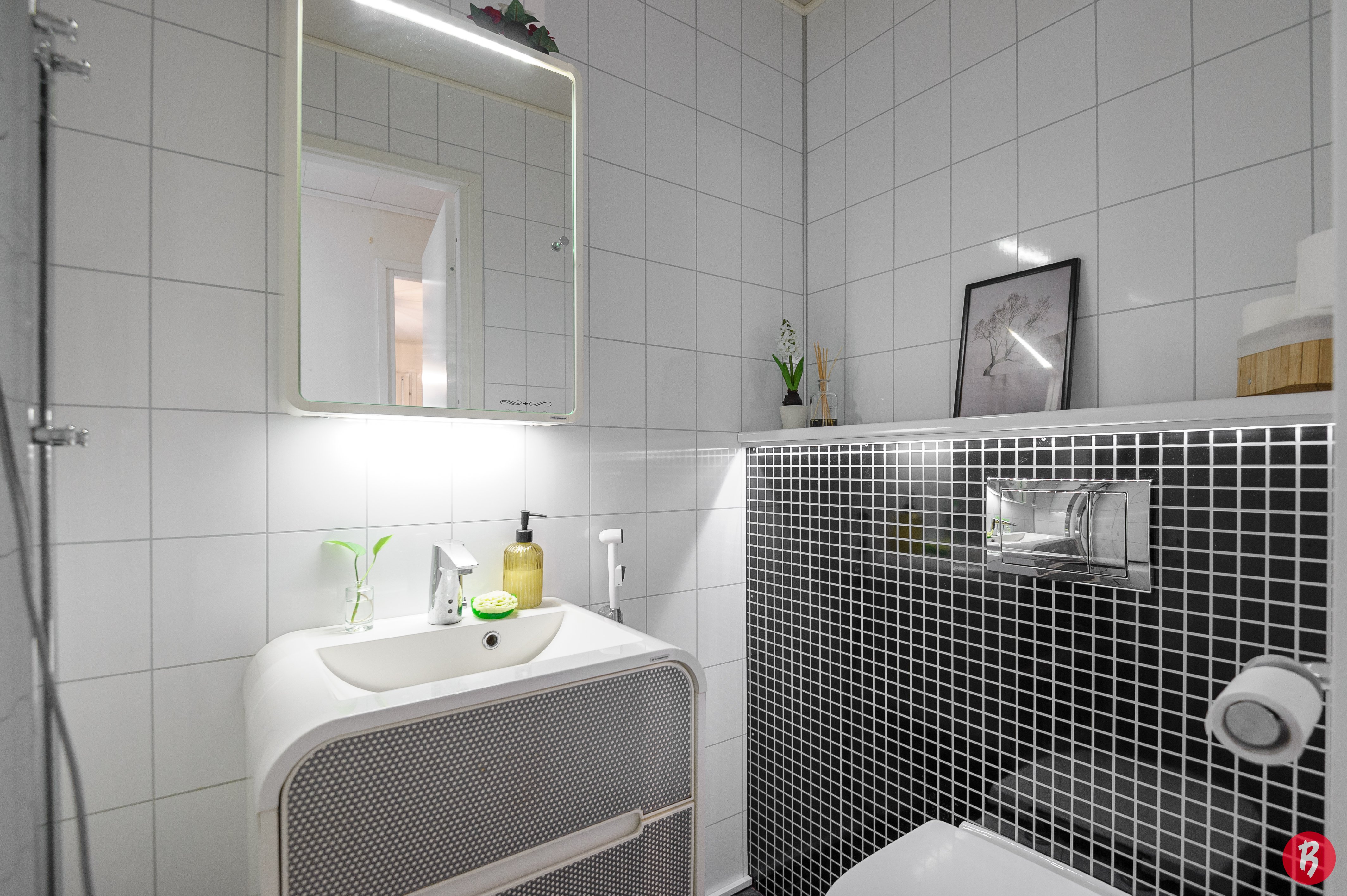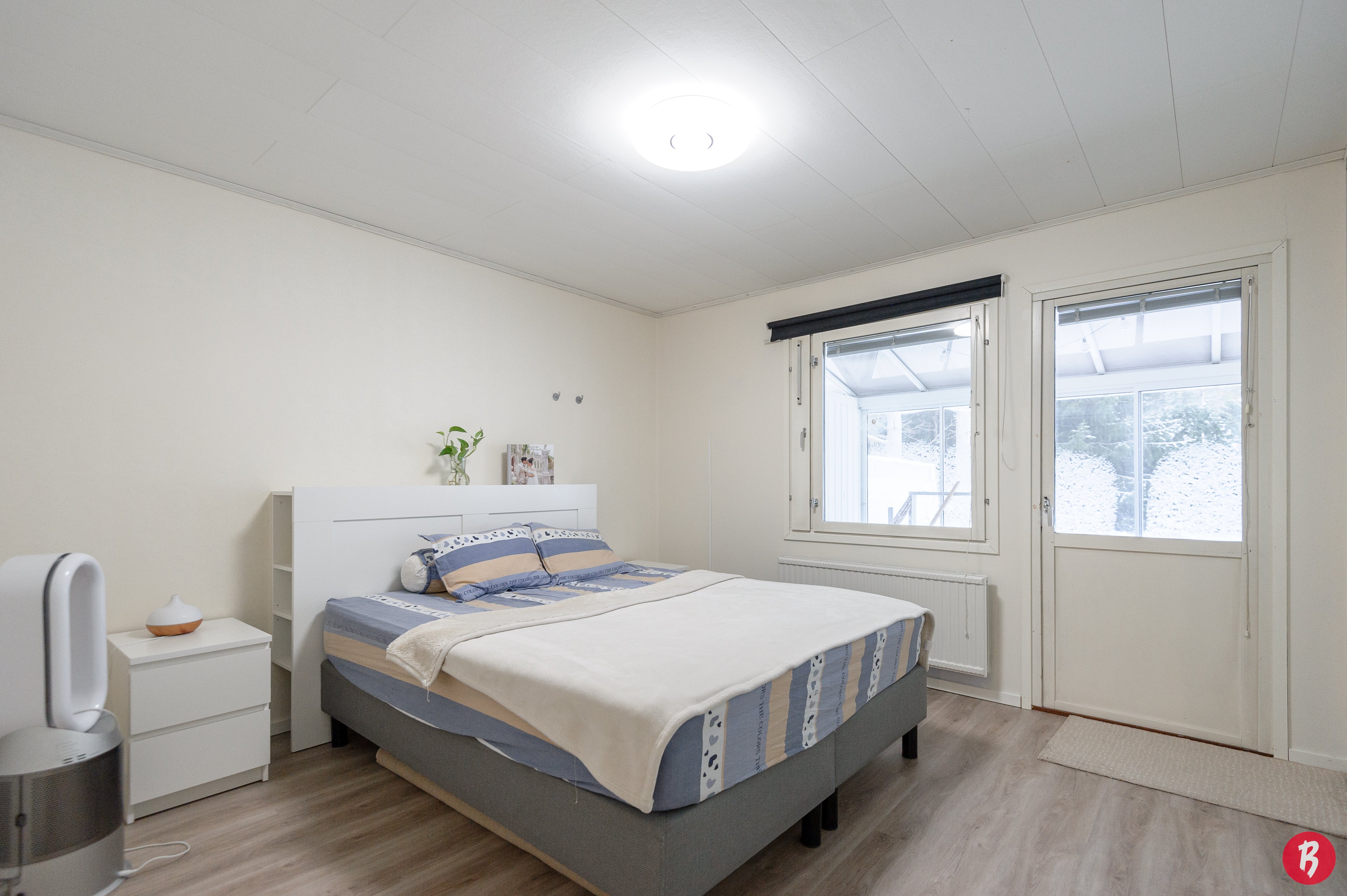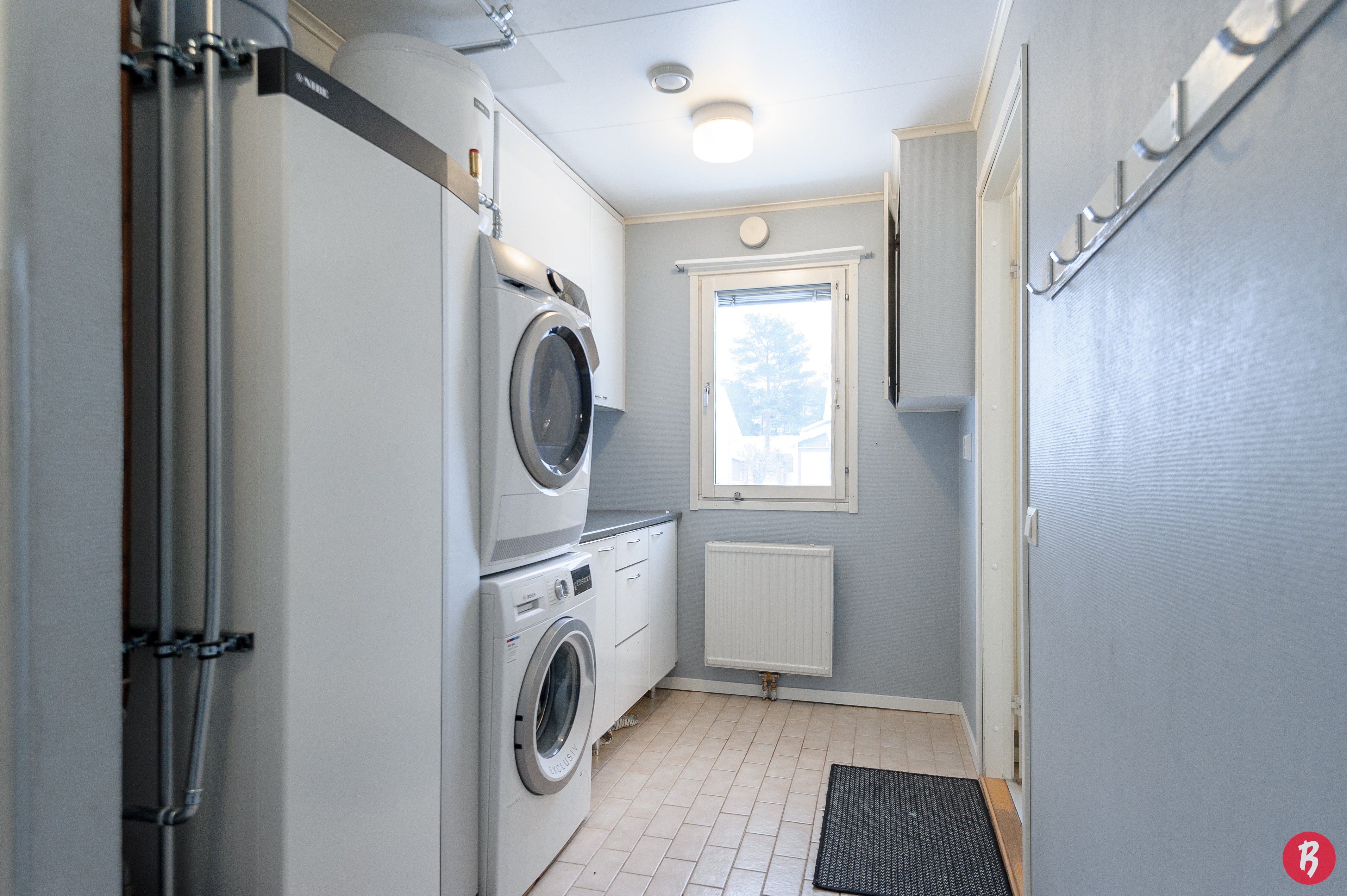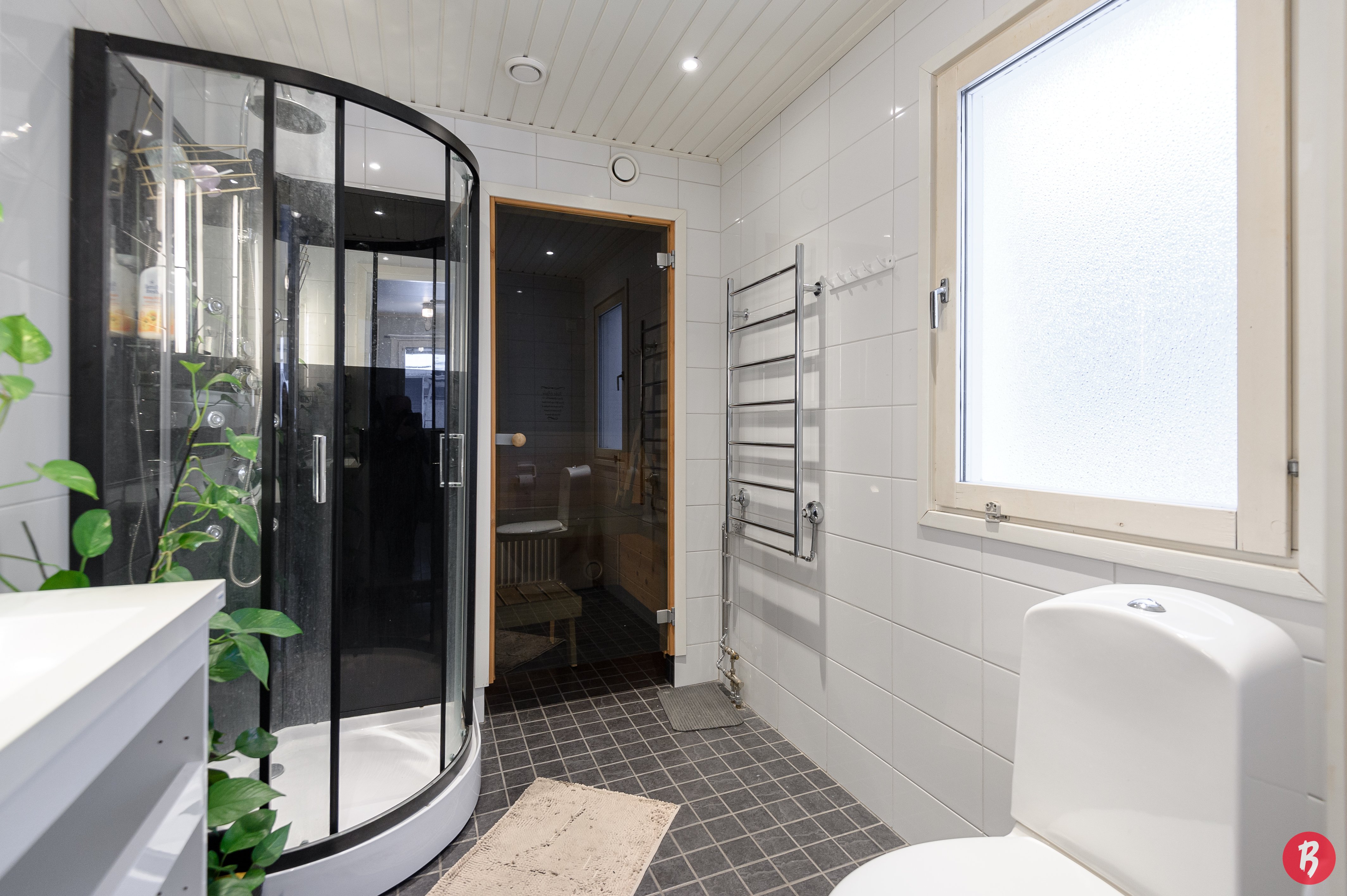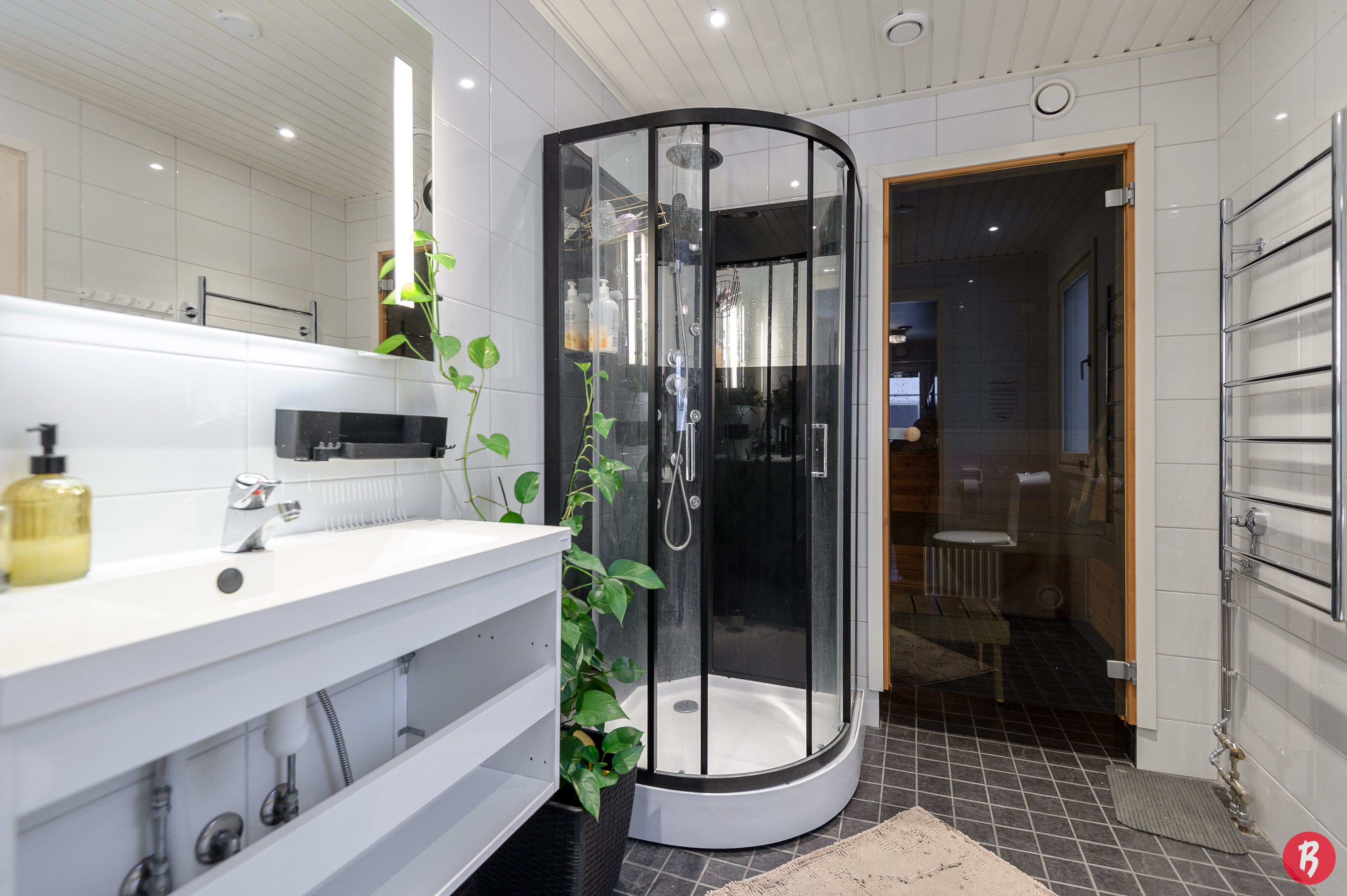 Kylpyhuoneessa on lattialämmitys ja suihkukaappi on uusittu vuonna 2025. Kodinhoitohuoneessa on oma uloskäynti, mikä tekee arjen askareista sujuvampia. Oma sauna tarjoaa rentouttavat löylyt pitkän päivän päätteeksi.