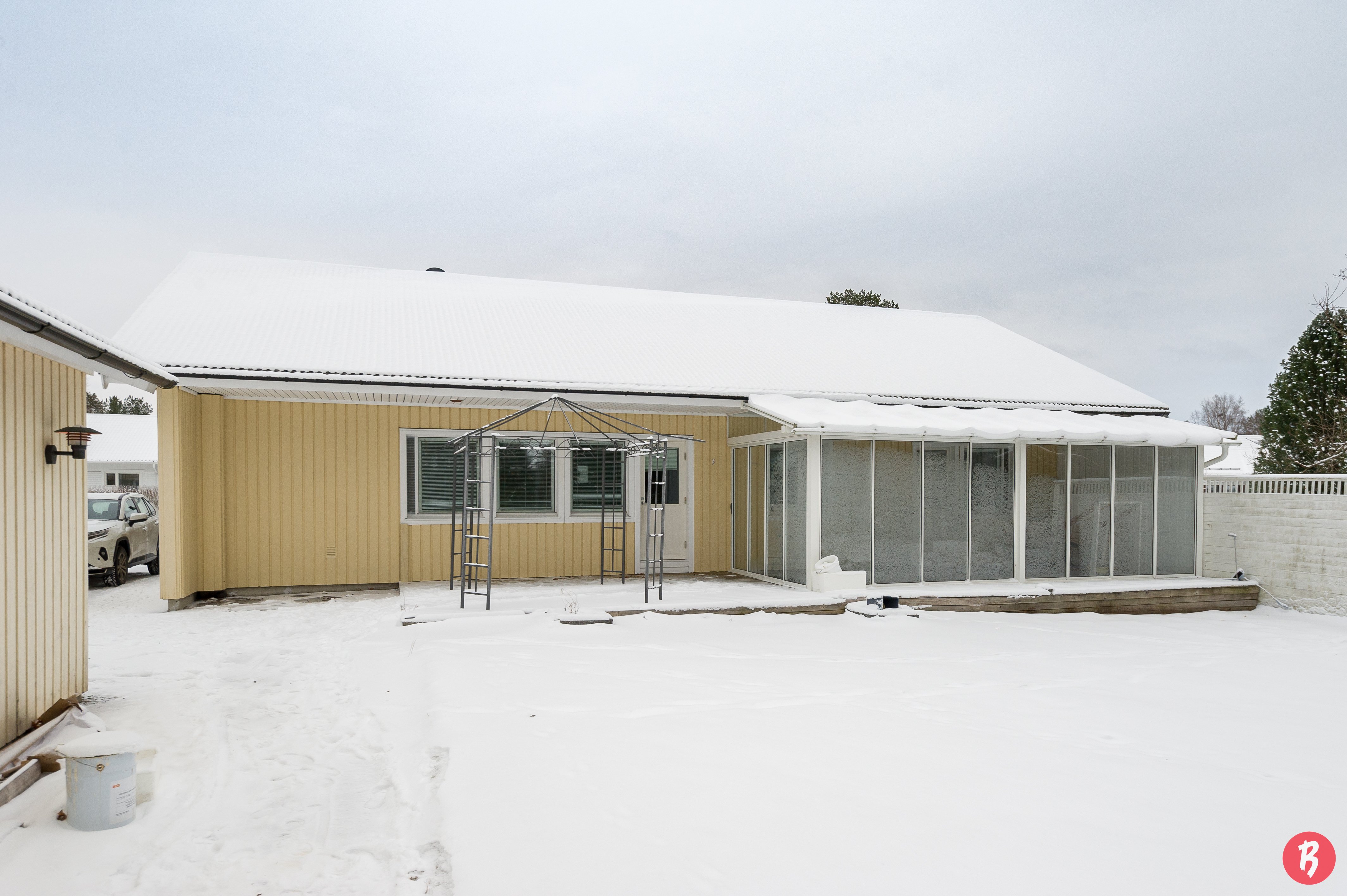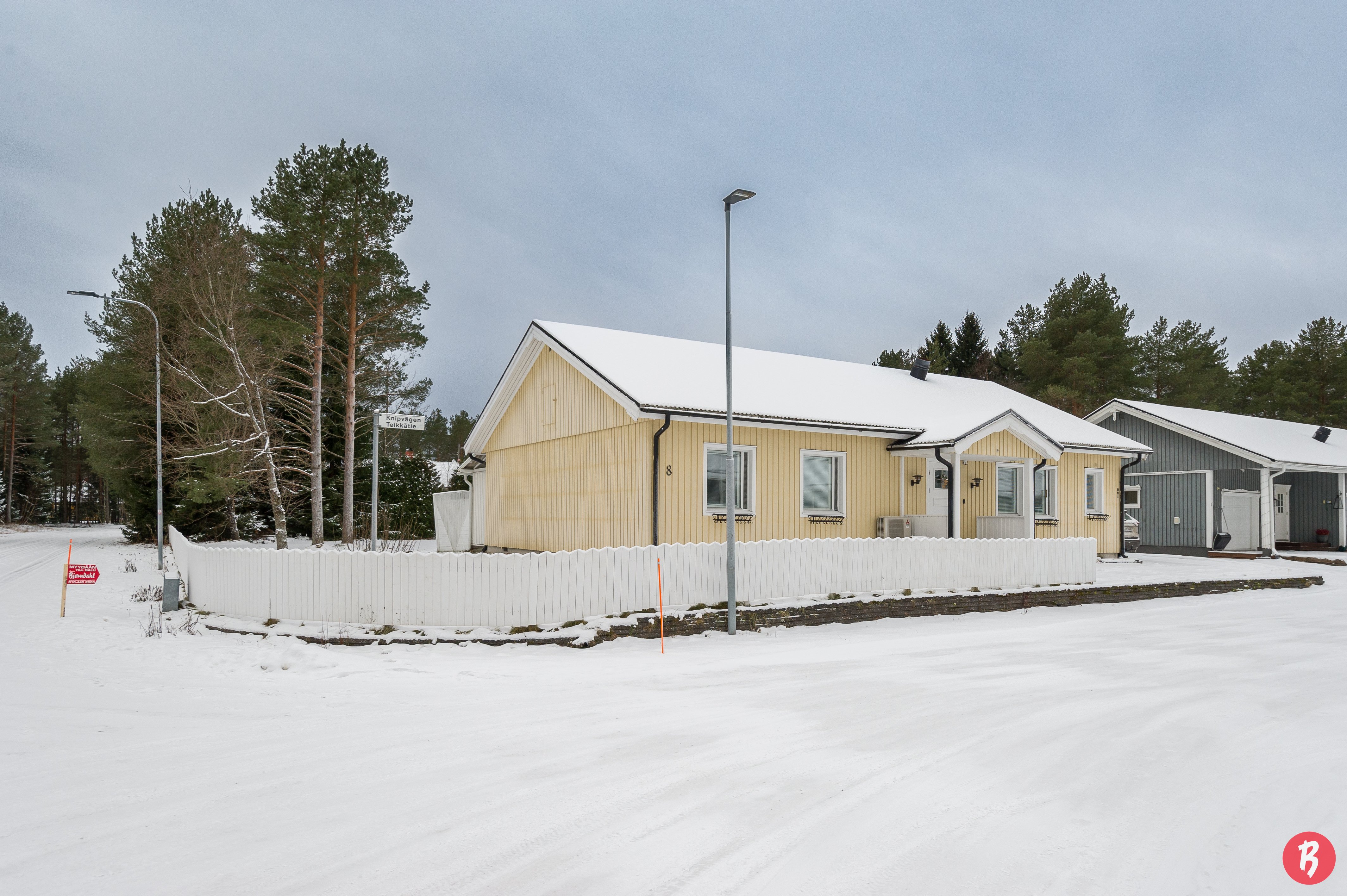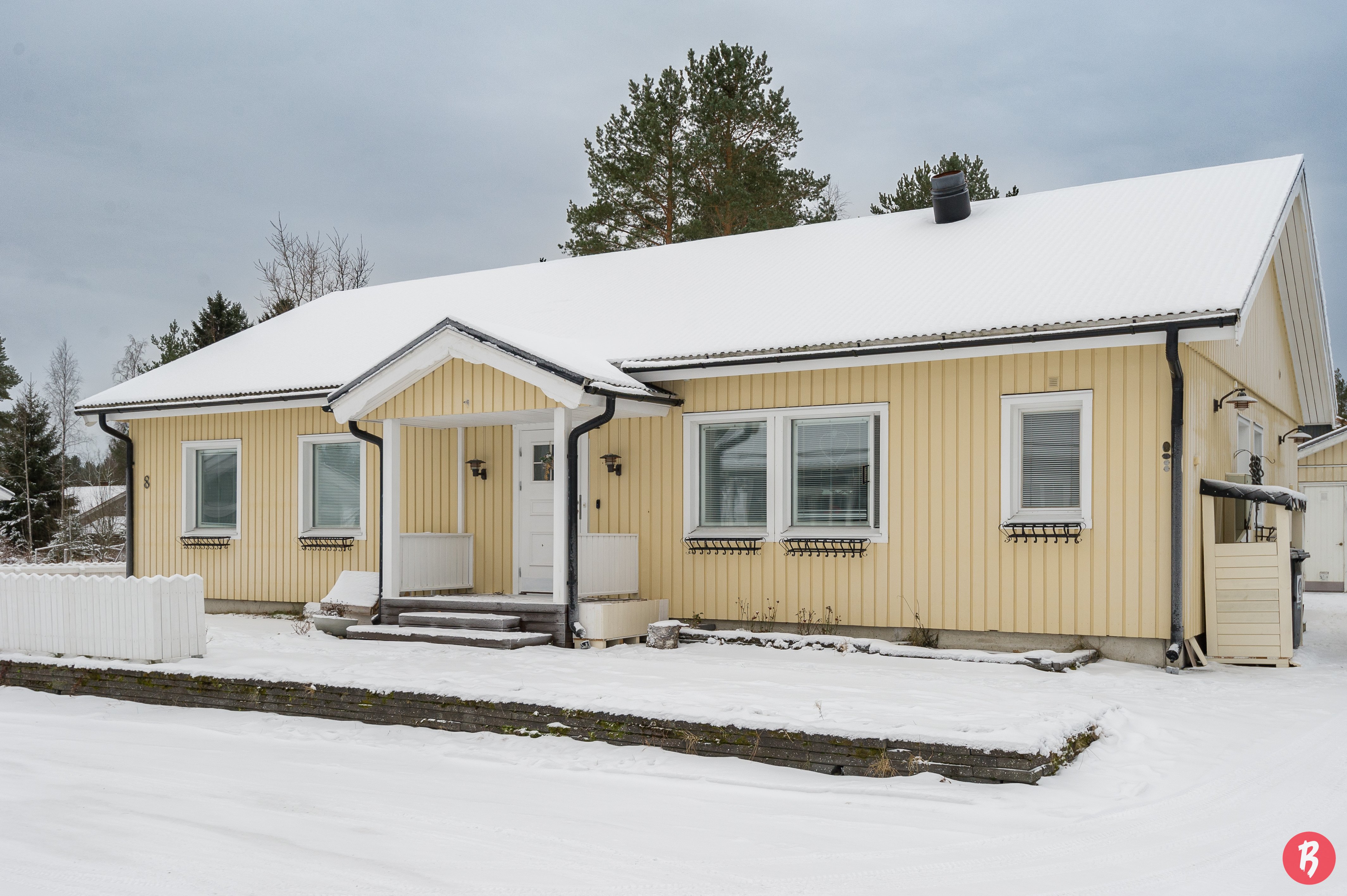 Den inglasade terrassen ger extra komfort året runt, och det separata, rymliga garaget erbjuder även möjlighet till distansarbete. Gårdsplanen är trygg och lämpar sig utmärkt för både barnen och husdjurens lekar.
