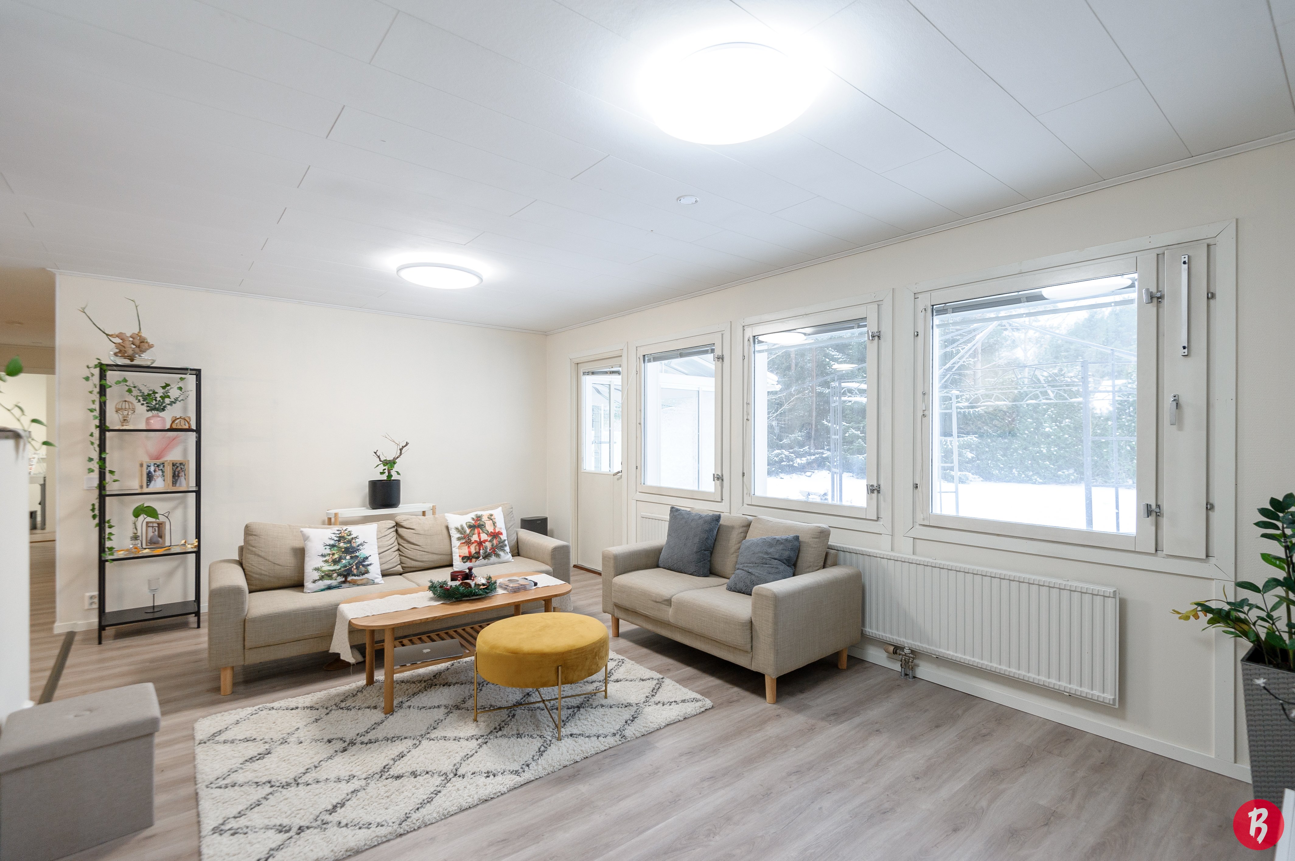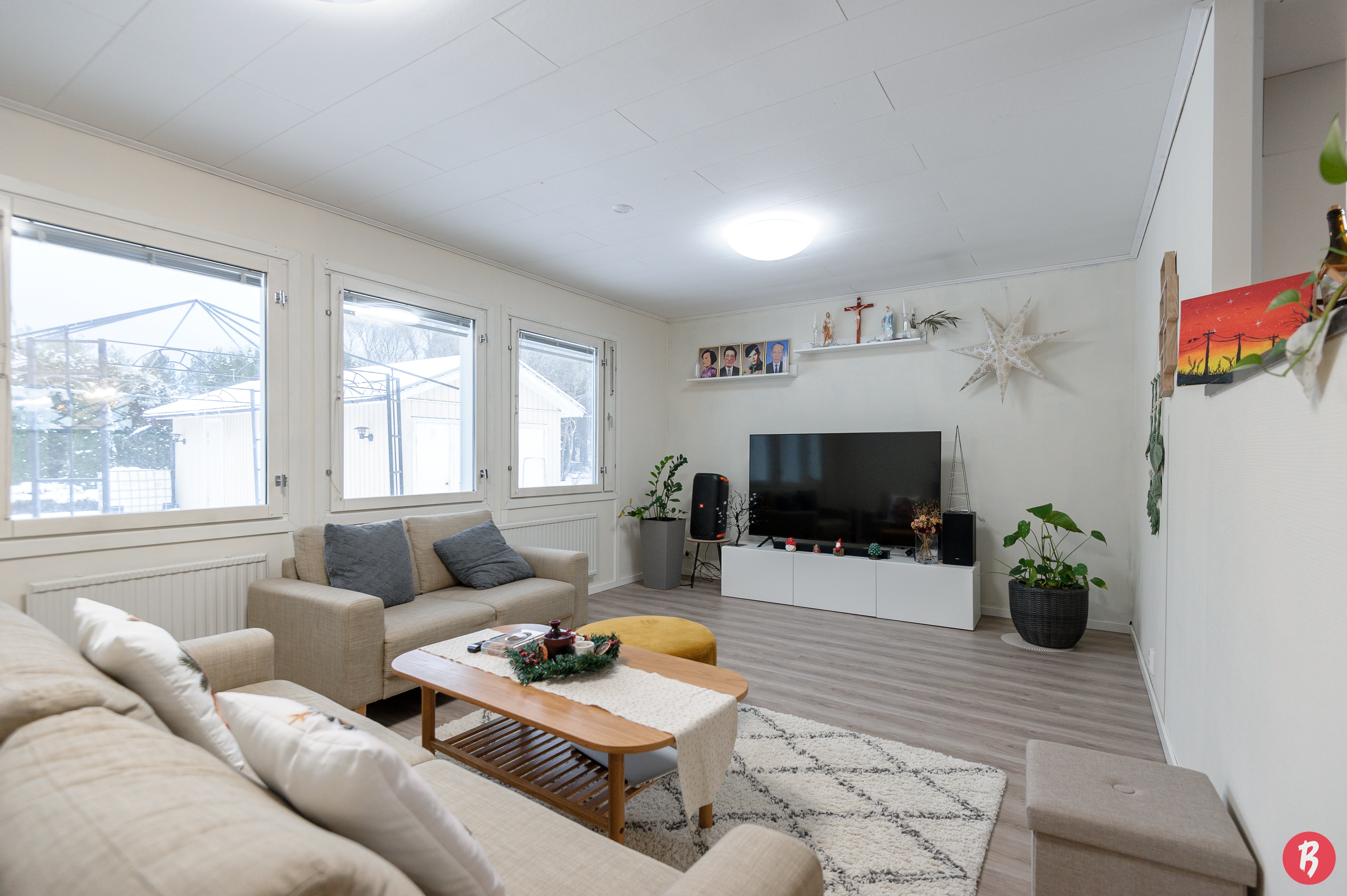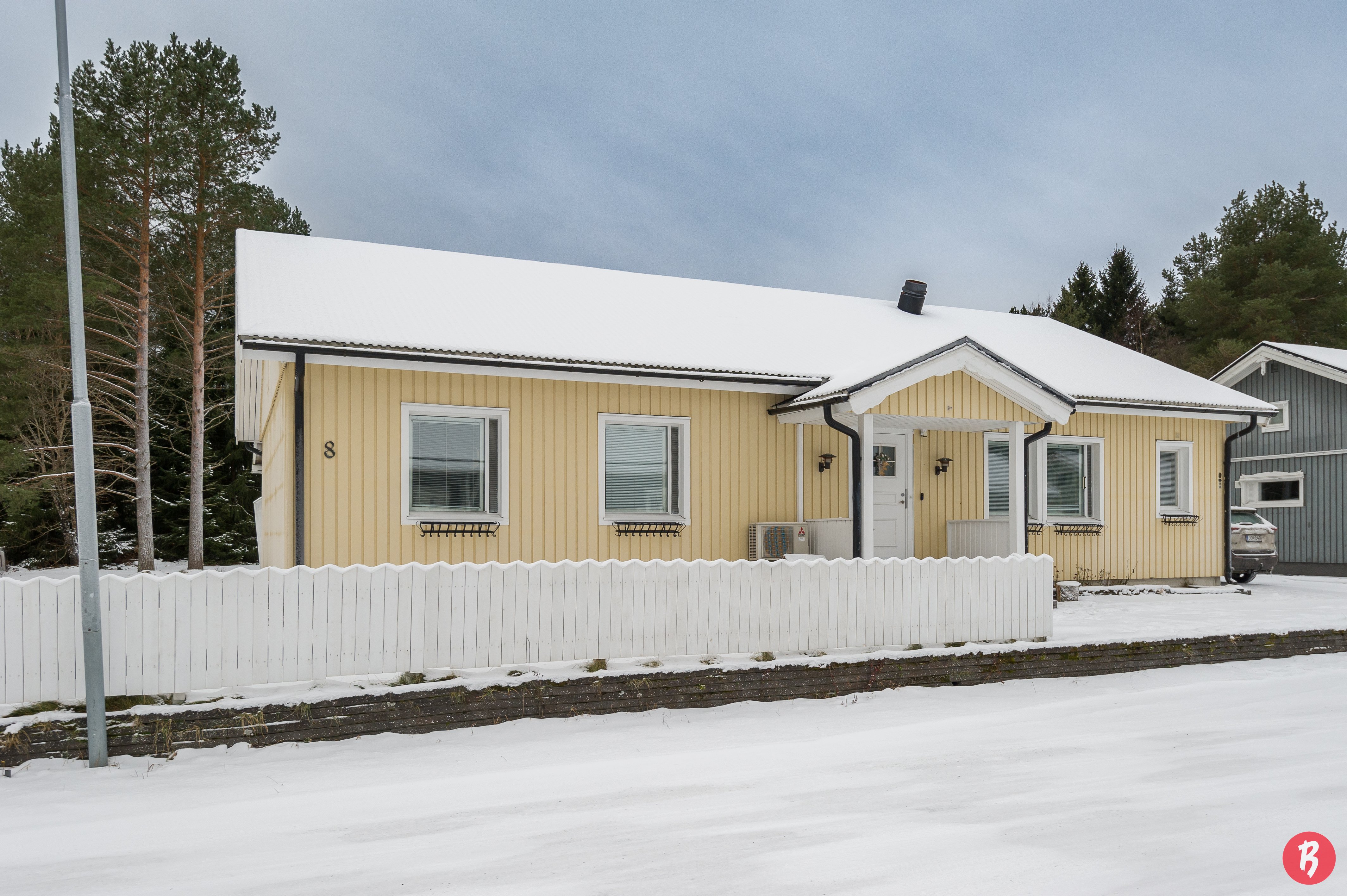 Den inglasade terrassen ger extra komfort året runt, och det separata, rymliga garaget erbjuder även möjlighet till distansarbete. Gårdsplanen är trygg och lämpar sig utmärkt för både barnen och husdjurens lekar.
