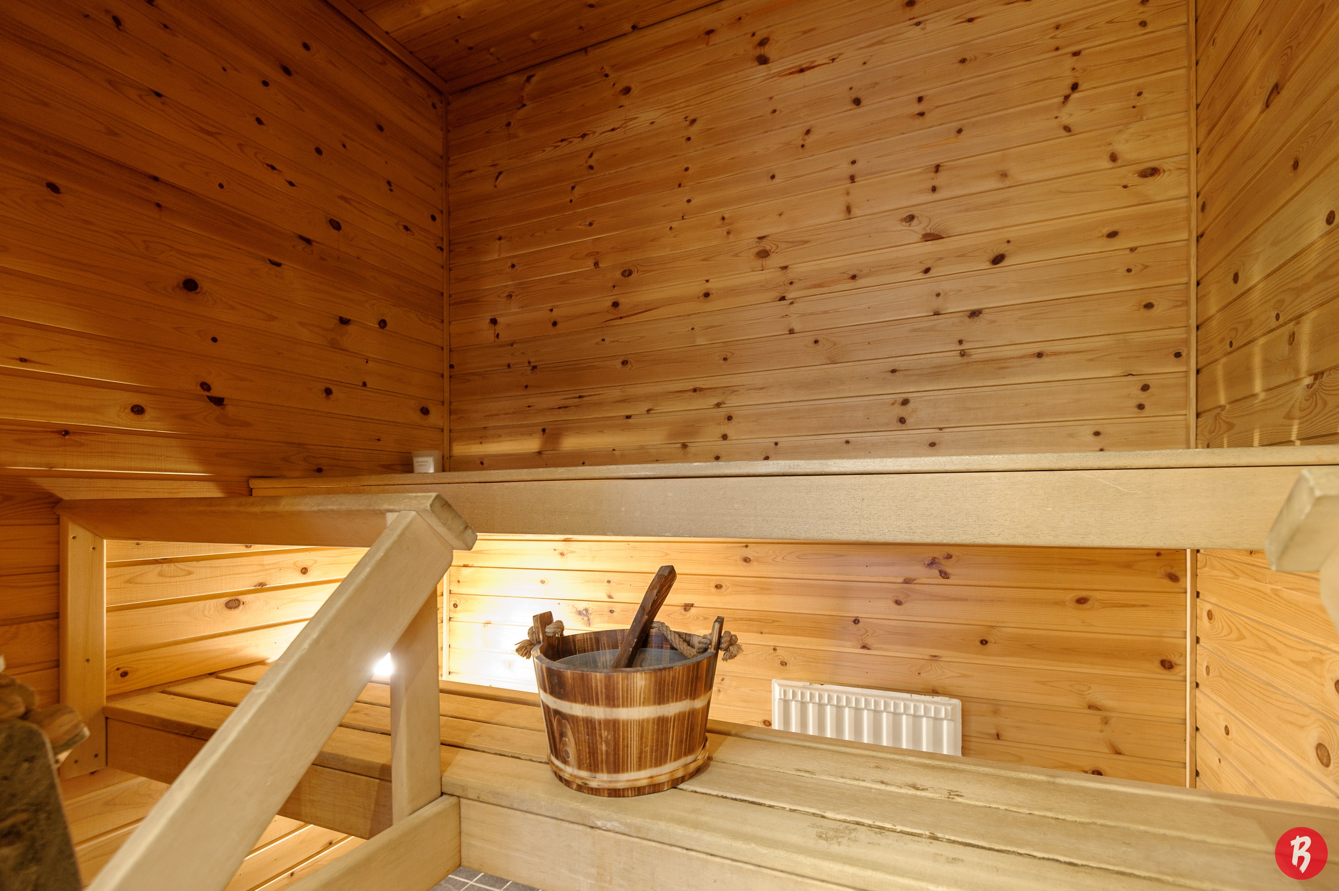 Badrummet har golvvärme och duschskåpet förnyades år 2025. Hjälpköket har egen utgång, vilket gör vardagens sysslor smidigare. Den egna bastun erbjuder avkopplande stunder efter en lång dag.