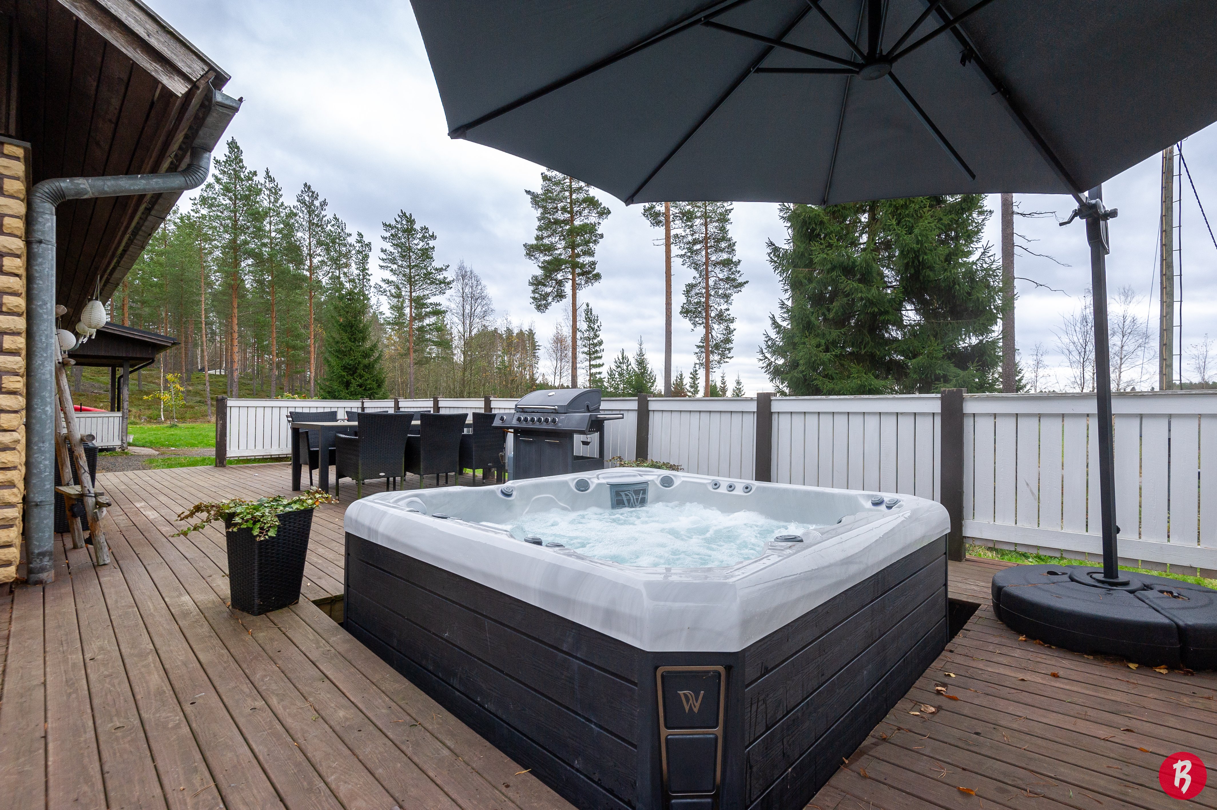 Pihapiiri on suuri ja vehreä, ja tilava terassi poreammeineen kutsuu nauttimaan ulkoilmasta. Autokatos ja varasto tarjoavat lisätilaa säilytykseen.