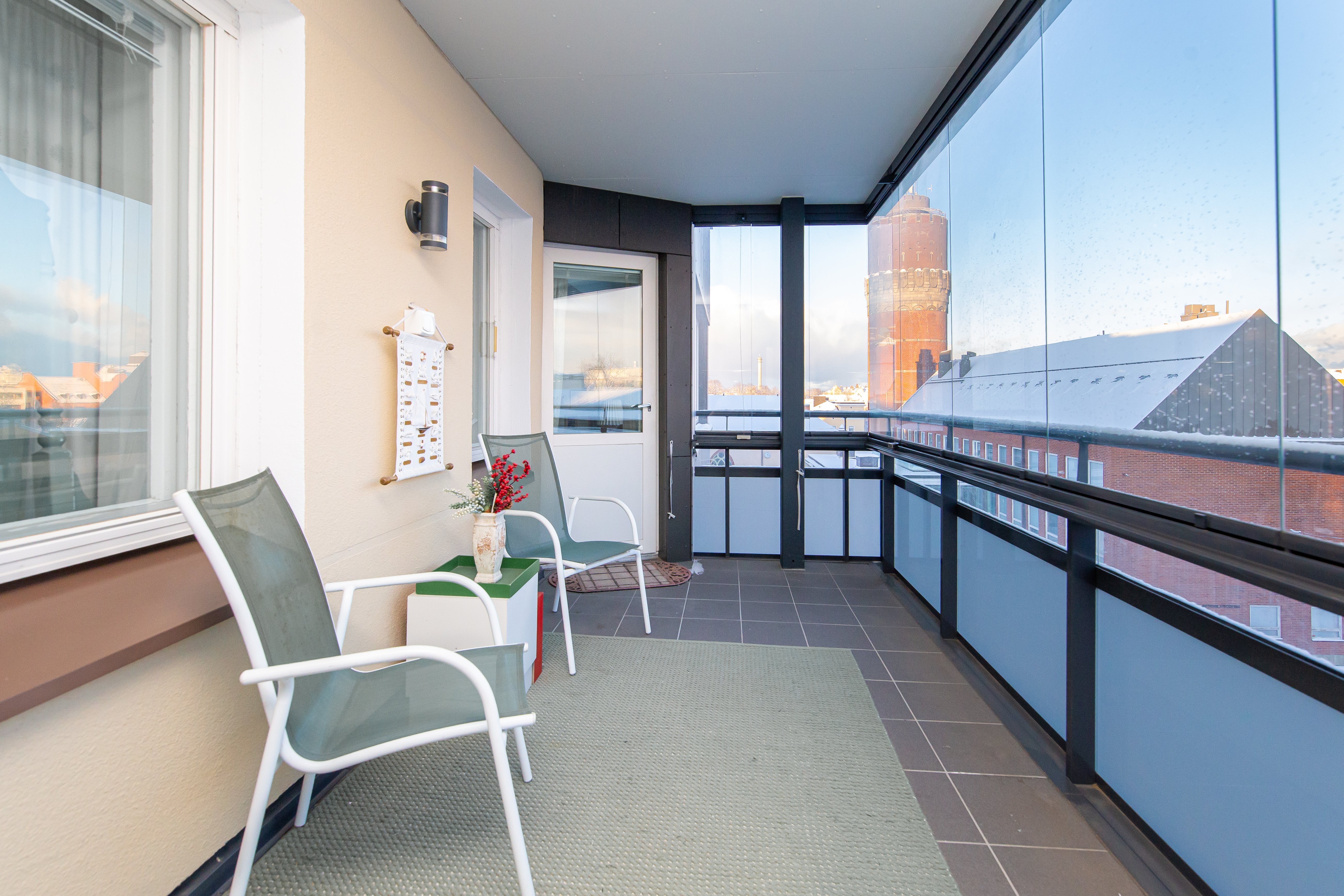 Bostaden är belägen på femte våningen i ett tornhus som uppfördes år 1962. Den stora inglasade balkongen erbjuder en imponerande utsikt över staden. Inglasningen gör balkongen användbar året om.
