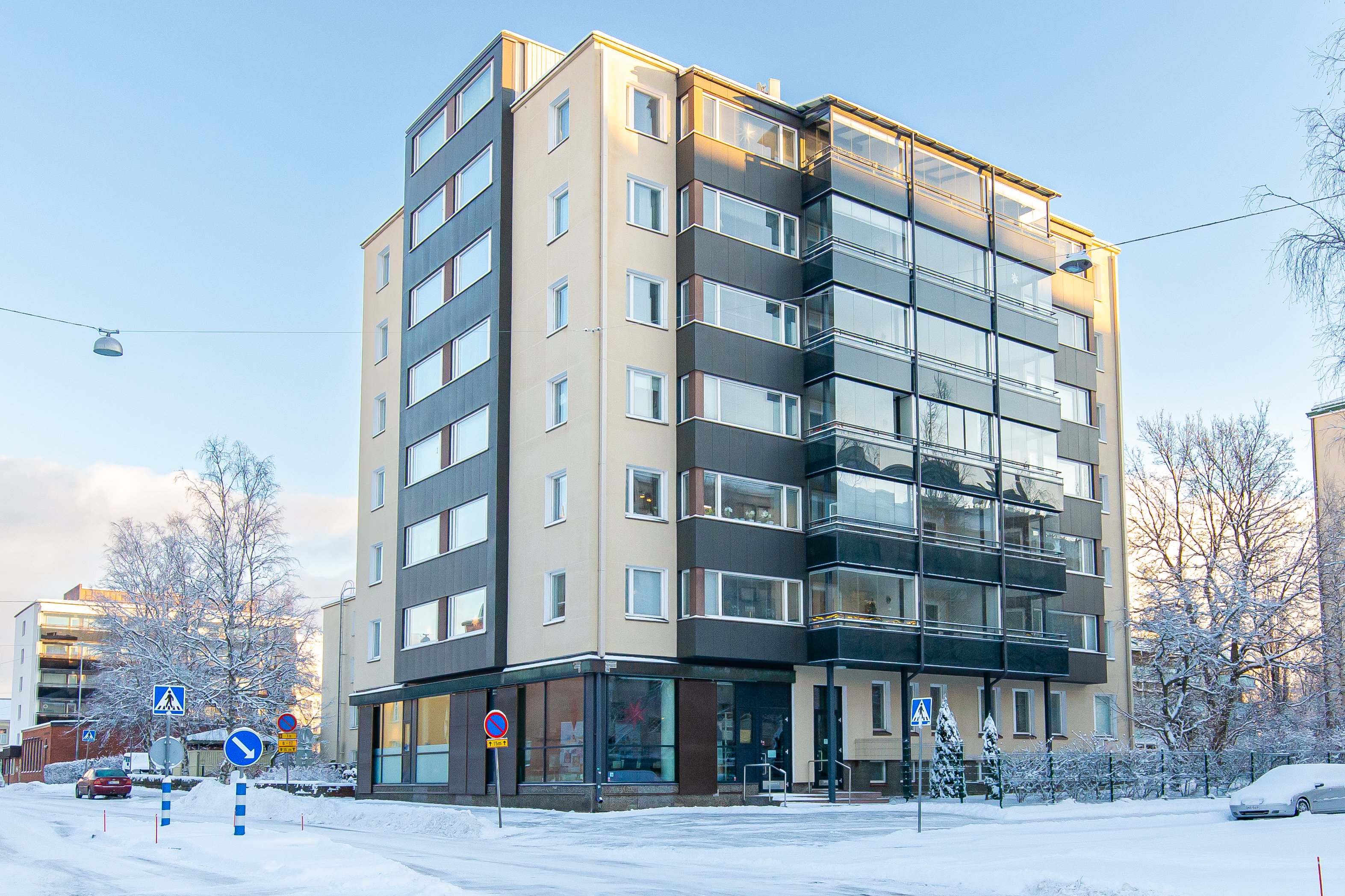 Asunto sijaitsee vuonna 1962 rakennetun tornitalon viidennessä kerroksessa. Asunnon todella tilava lasitettu parveke tarjoaa vaikuttavan näkymän kaupungin ylle. Parvekkeen lasitus pidentää käyttöaikaa ympäri vuoden.