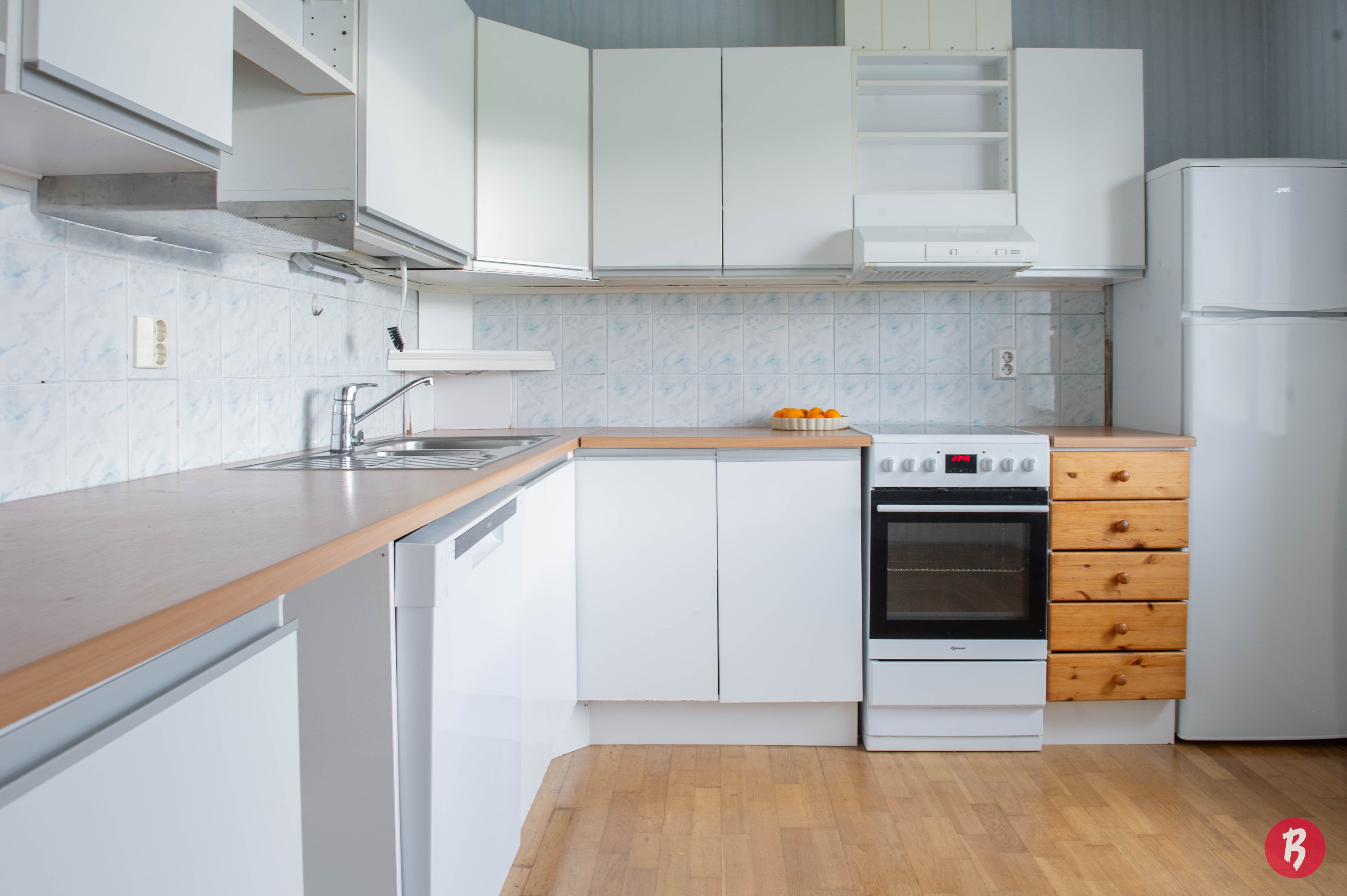 Keittiö on varustettu astianpesukoneella ja jääkaappipakastimella, mikä helpottaa arjen askareita. Luonnonvalo tulvii sisään suurista ikkunoista, luoden avaran ja miellyttävän tunnelman. Asuntoon kuuluu myös autotalli/ varasto, jotka tarjoavat lisää säilytystilaa.