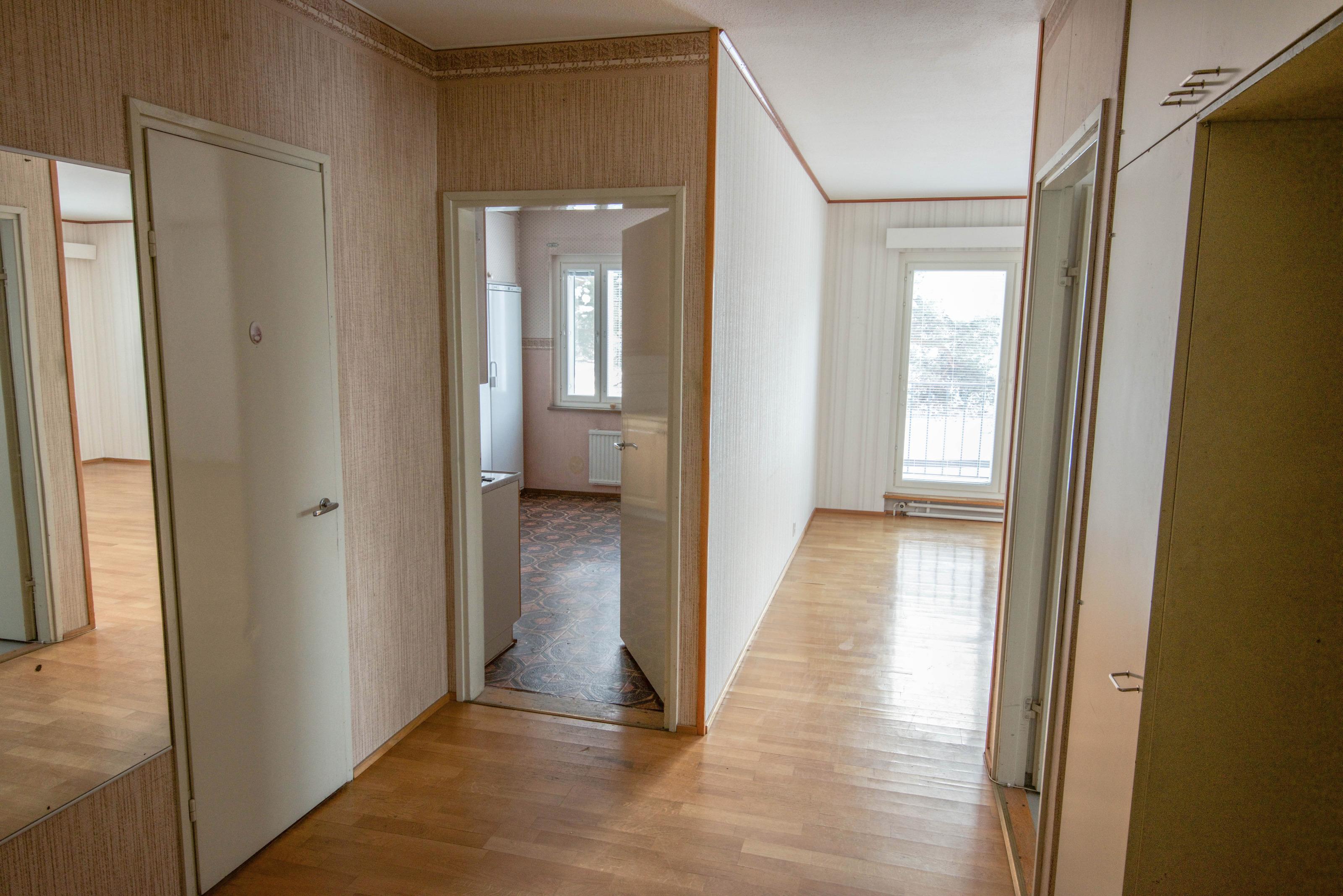 /Ljus, hemtrevlig hörnlägenhet i 2. våningen, lägenhet med fungerande bottenplan. Behändigt med hiss fram till dörren. I lägenheten finns ett rymligt och behändigt vardagsrum, där matsal samt vardagsrum kan bl.a. kombineras. Två sovrum med egen dörr och enskilt kök. Ifrån den inglasade balkongen en vacker vy utöver den grönskande bakgården, där bl.a. husbolagets gård och grilltak finns. Lugnt och tyst husbolag som skötts bra. Läge nära till all service, men ändå eget lugn. Kråkholms mångsidiga frisklufts möjligheter bakom hörnet.